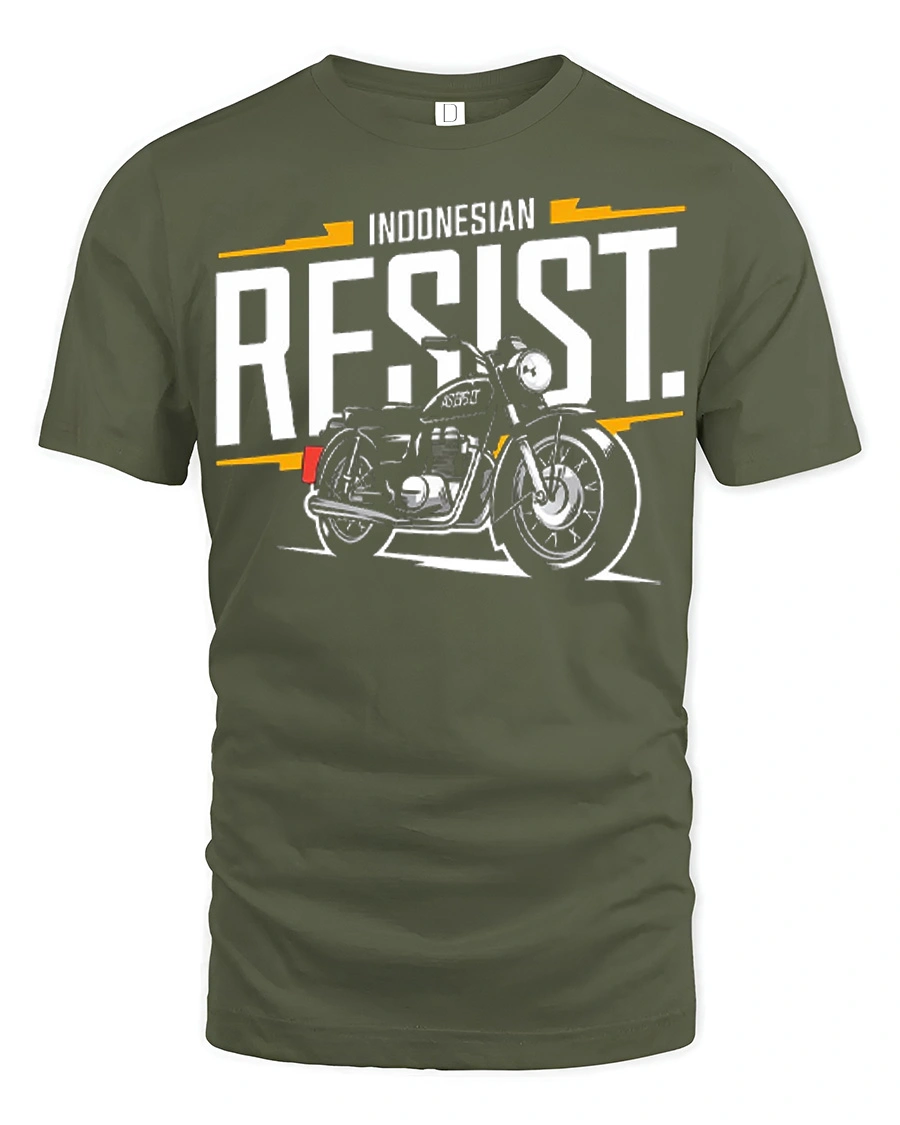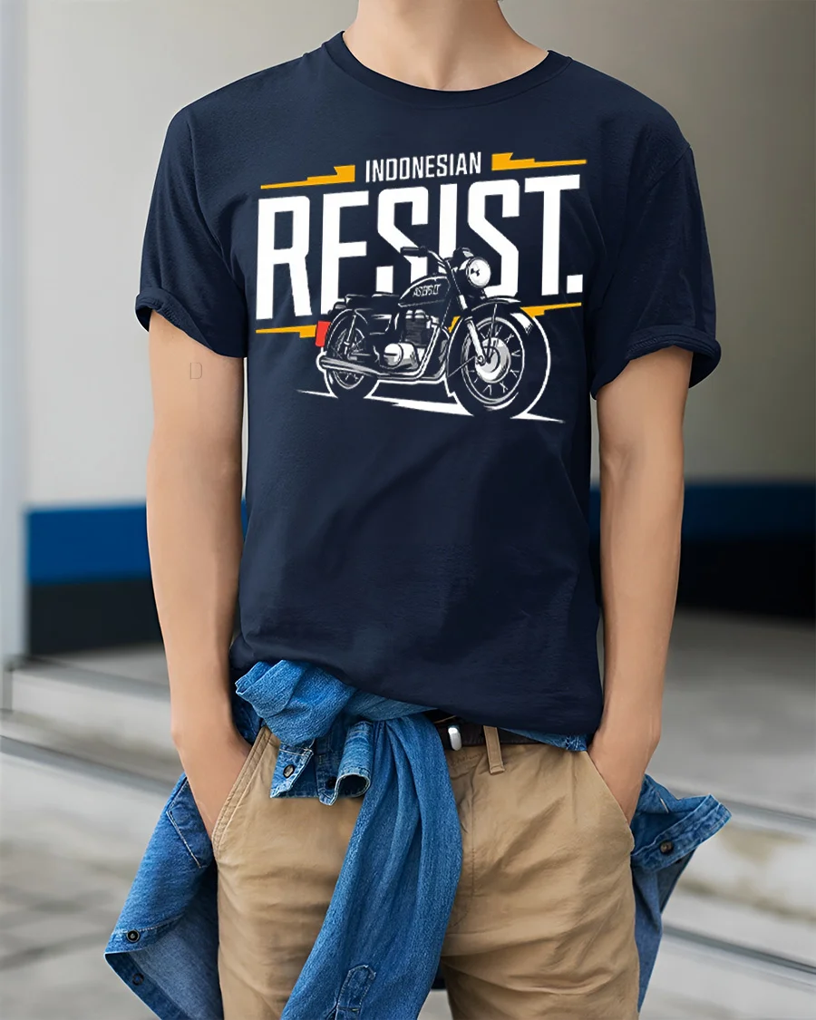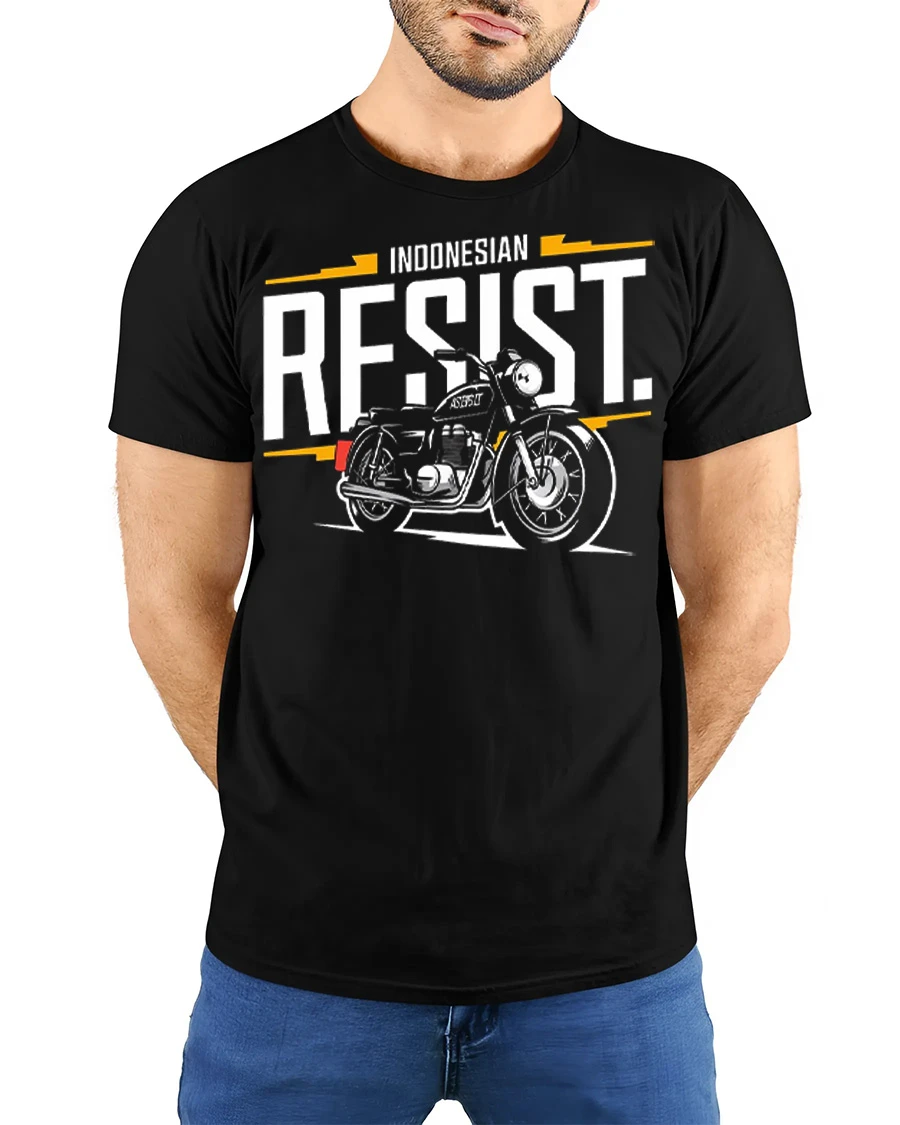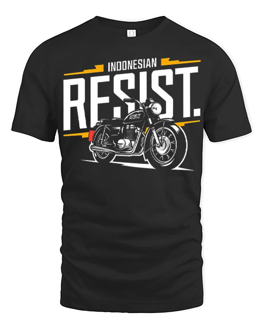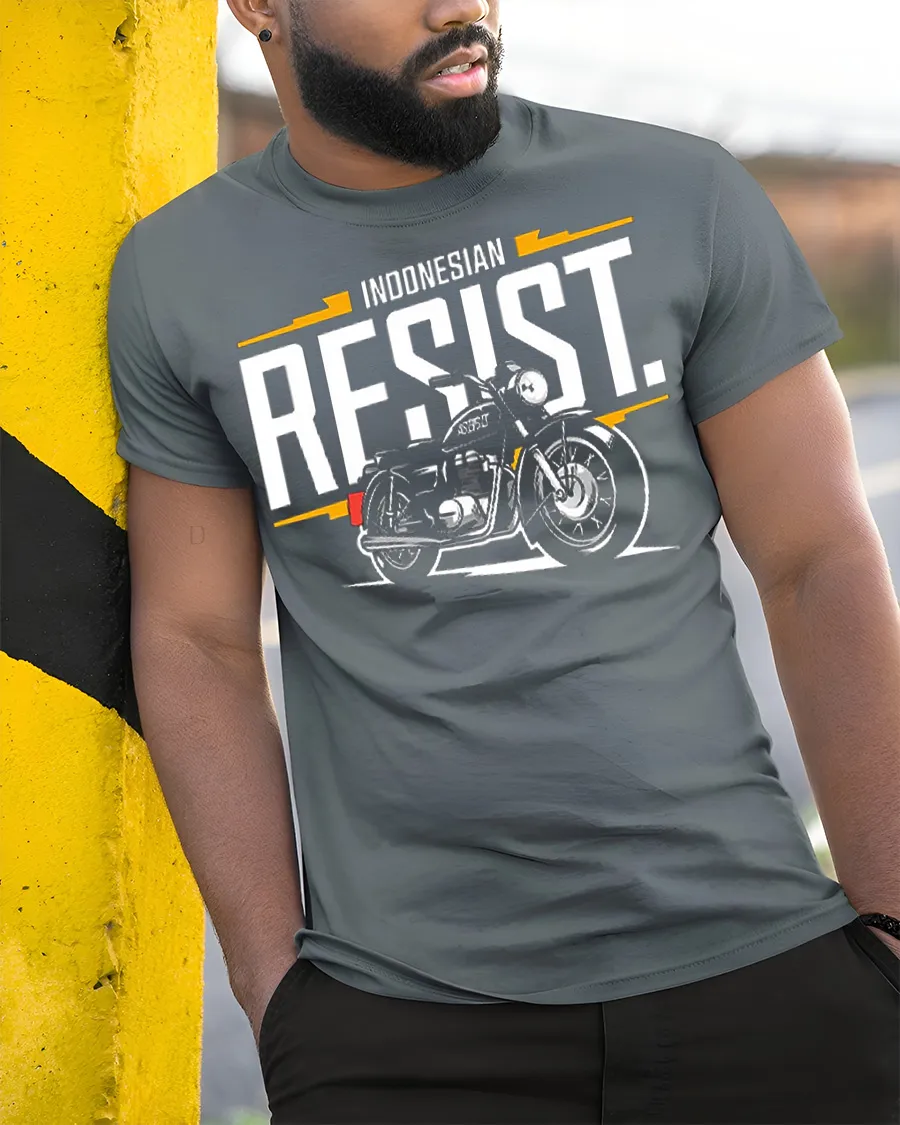 Indonesian Resist Motorcycle Tee Vintage Biker Spirit Graphic Tshirt brings together bold typography and a classic motorbike illustration that captures the raw energy of the open road.