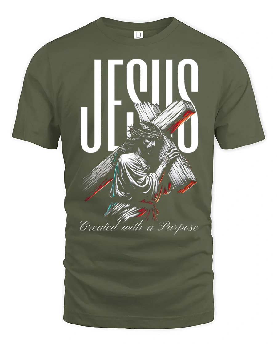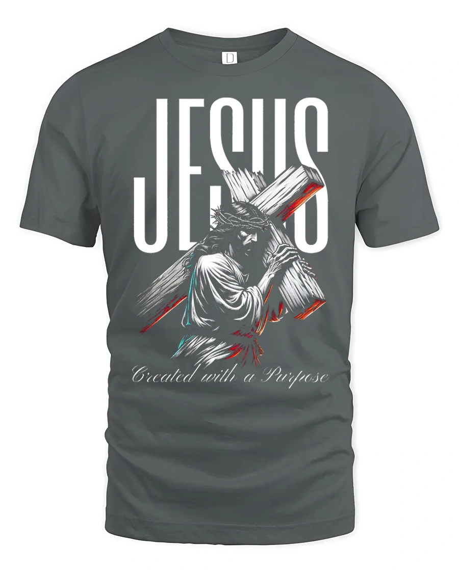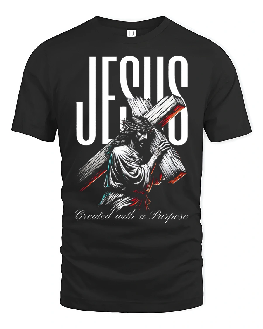 The Jesus Created With A Purpose Christian Faith Graphic Tshirt features a powerful and meaningful design that represents faith, sacrifice, and spiritual strength.