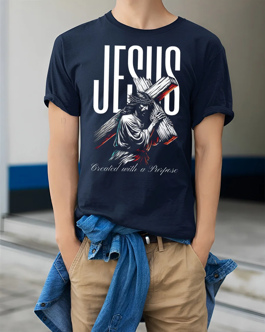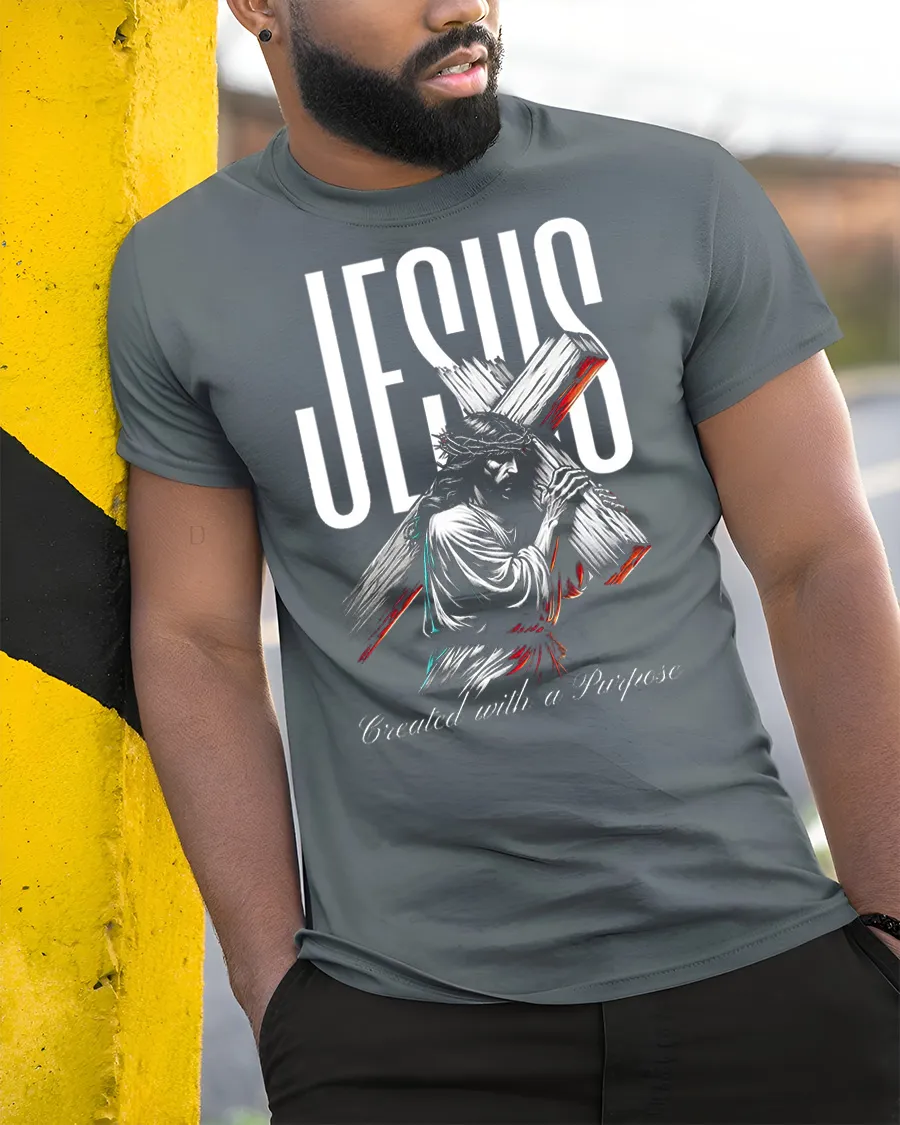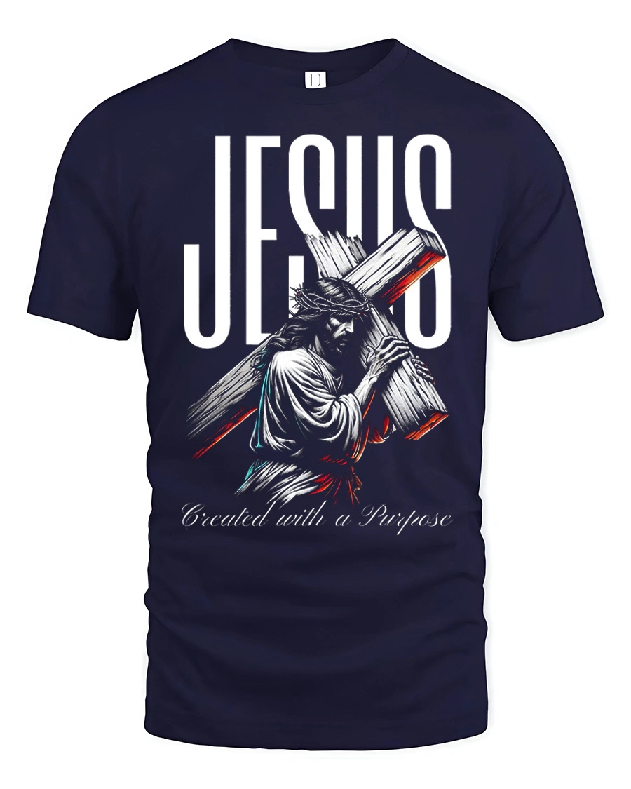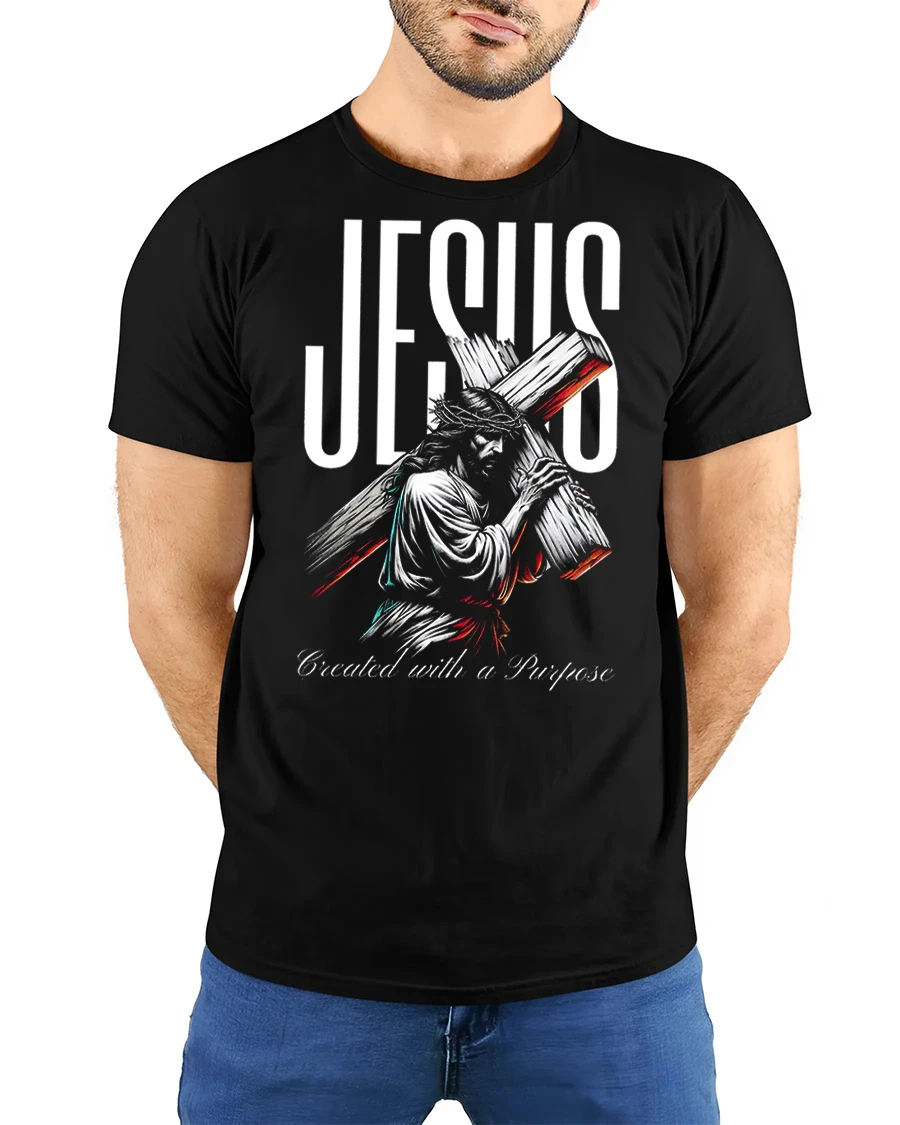 The Jesus Created With A Purpose Christian Faith Graphic Tshirt features a powerful and meaningful design that represents faith, sacrifice, and spiritual strength.