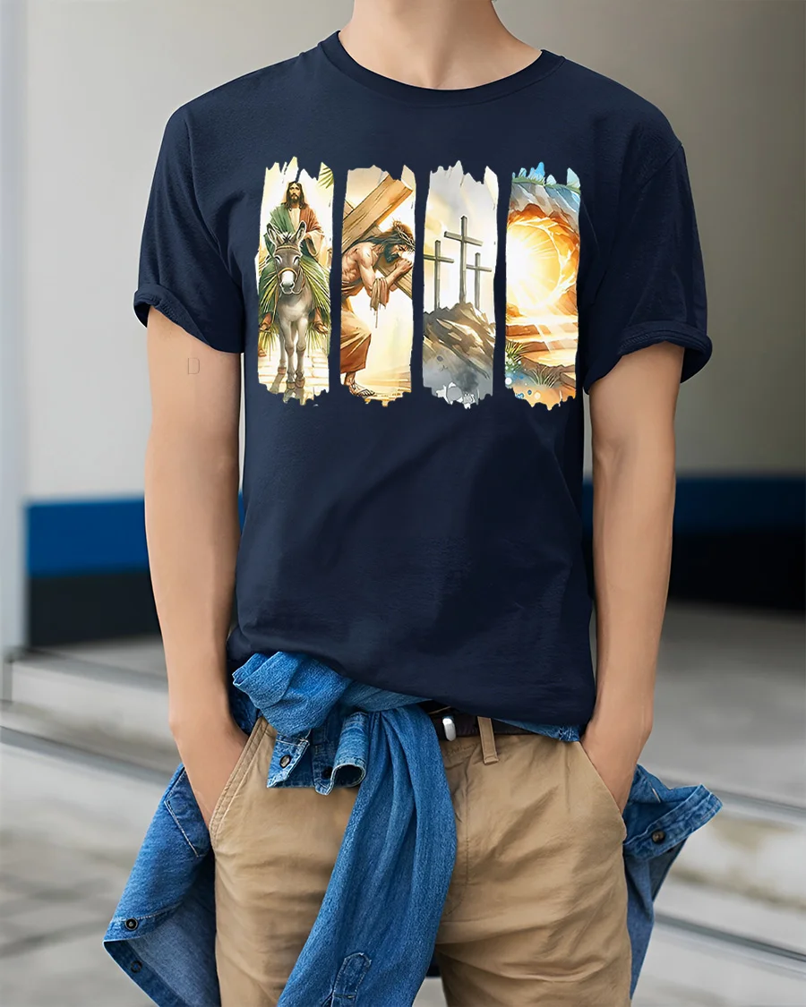 The design beautifully illustrates key moments including Jesus entering the city, carrying the cross, the crucifixion, and the radiant resurrection.
