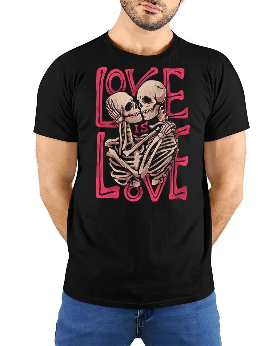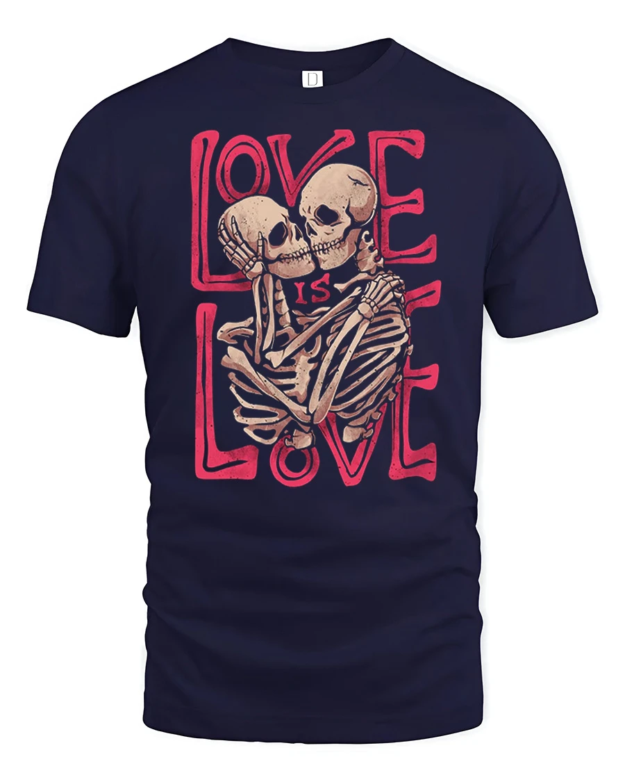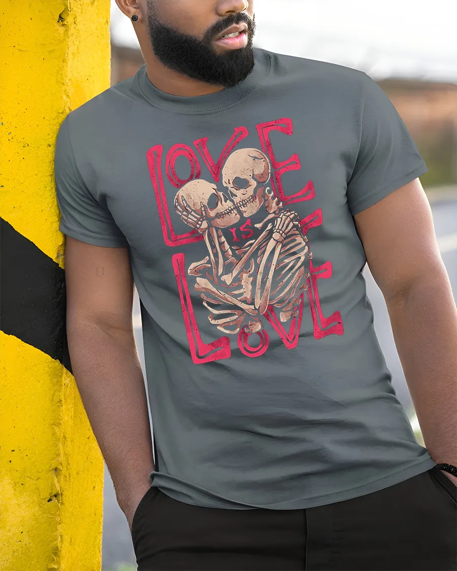 The Love Is Love Skeleton Couple Graphic Tee Gothic Love Tshirt features a bold and artistic design of two skeletons embracing with a strong love message in stylish typography.