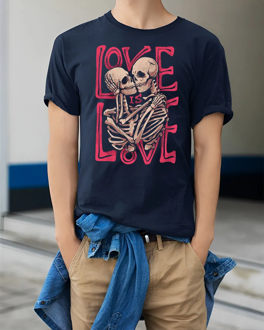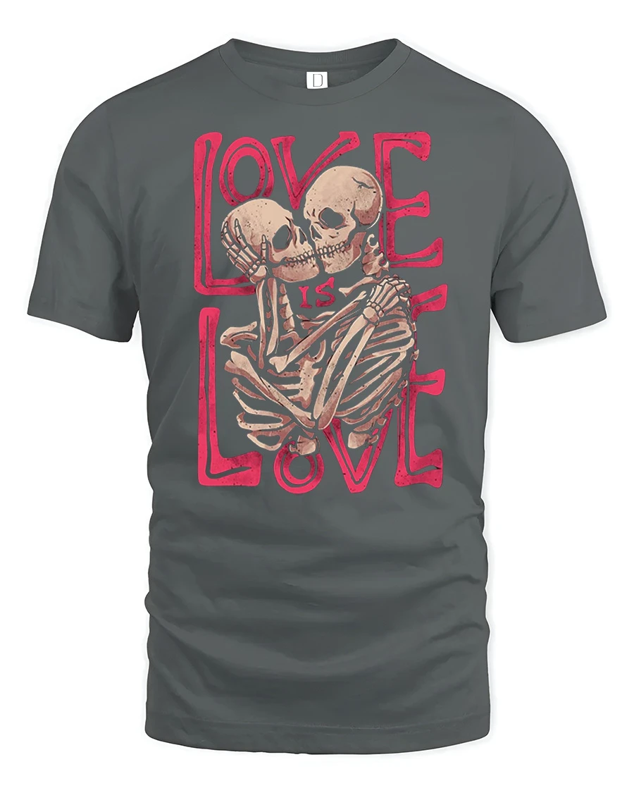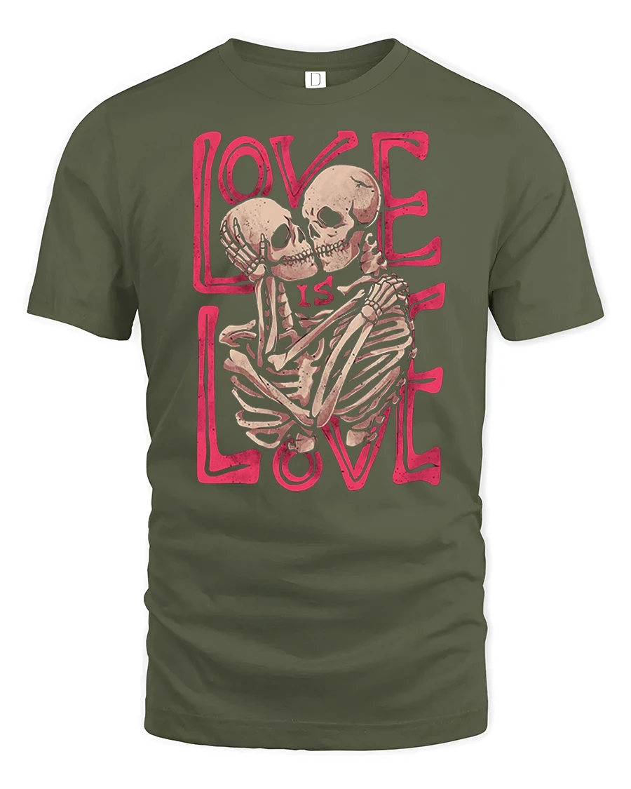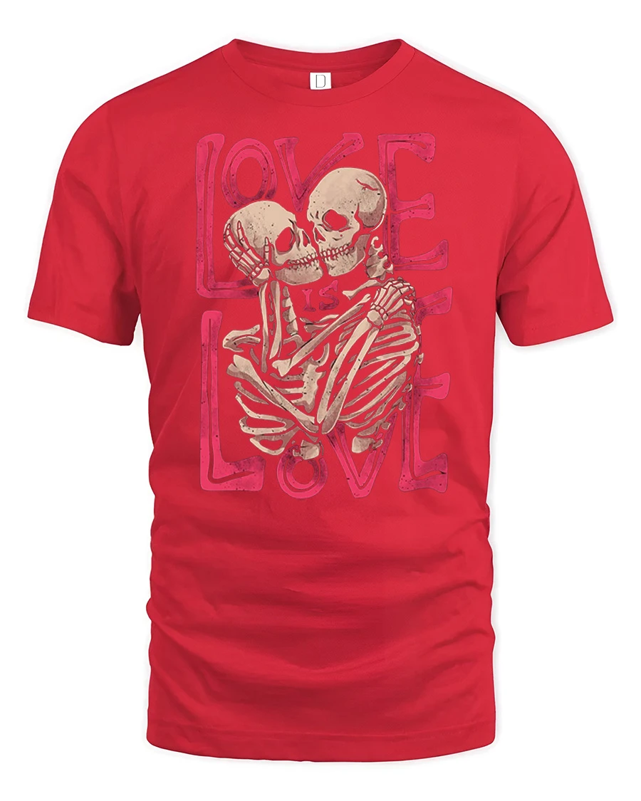 The Love Is Love Skeleton Couple Graphic Tee Gothic Love Tshirt features a bold and artistic design of two skeletons embracing with a strong love message in stylish typography.