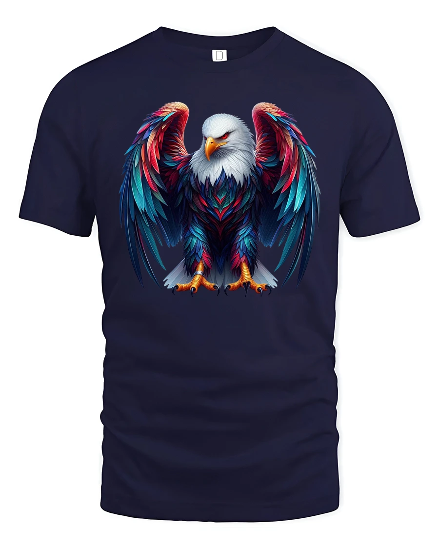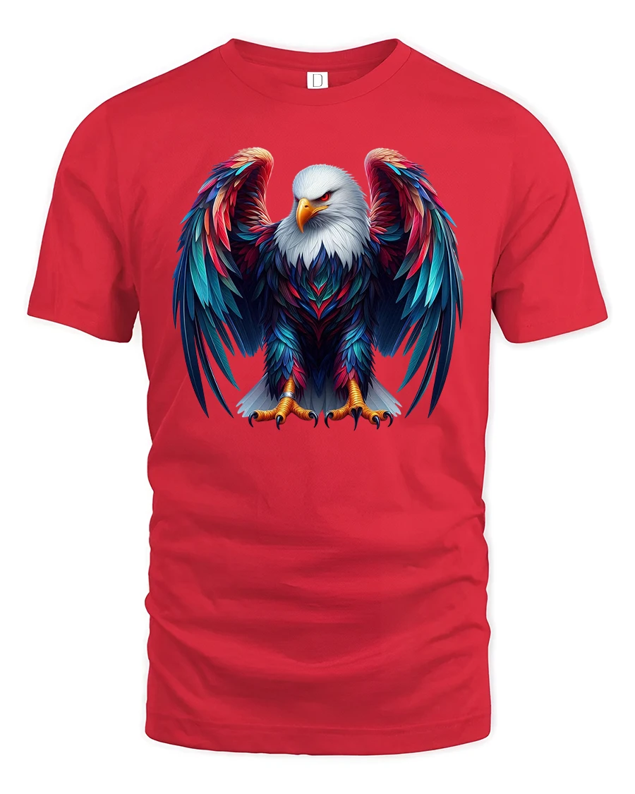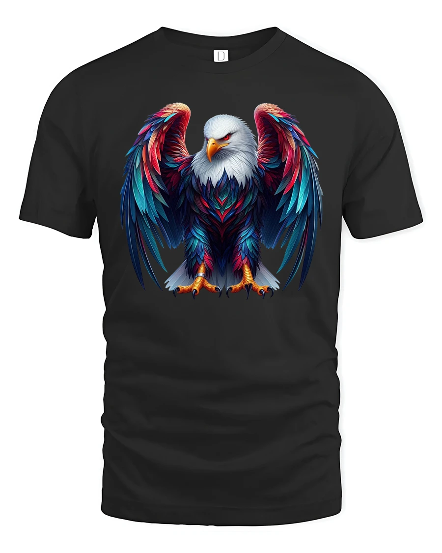 This striking design features a detailed bald eagle standing proudly with wide colorful wings and intense focus.