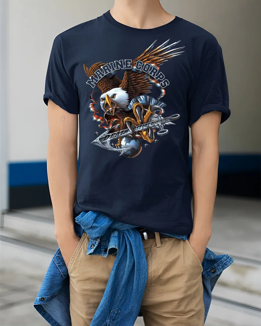 This design features a fierce bald eagle clutching the iconic Marine Corps emblem, symbolizing freedom, honor, and the fearless spirit of the U.S. Marines.