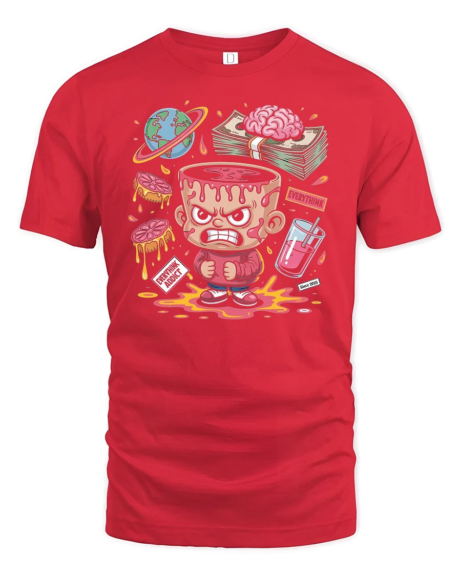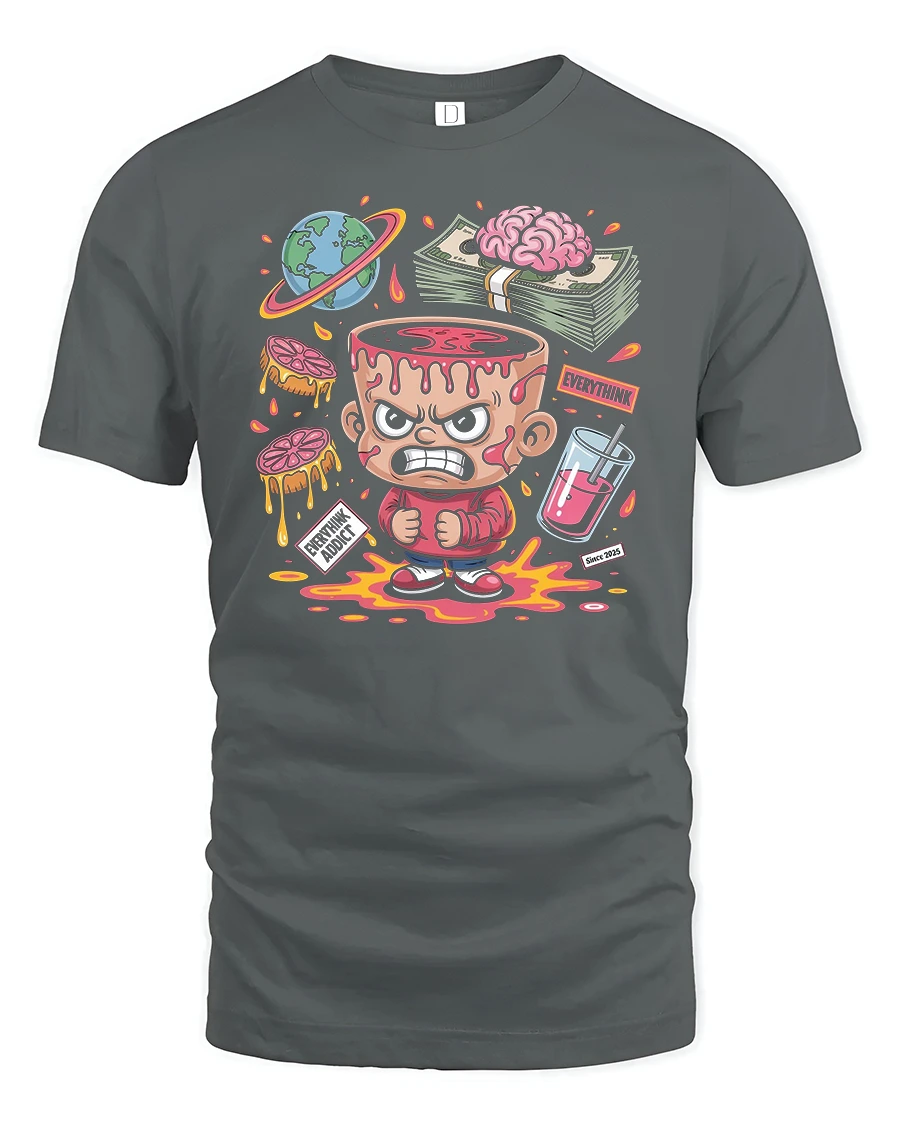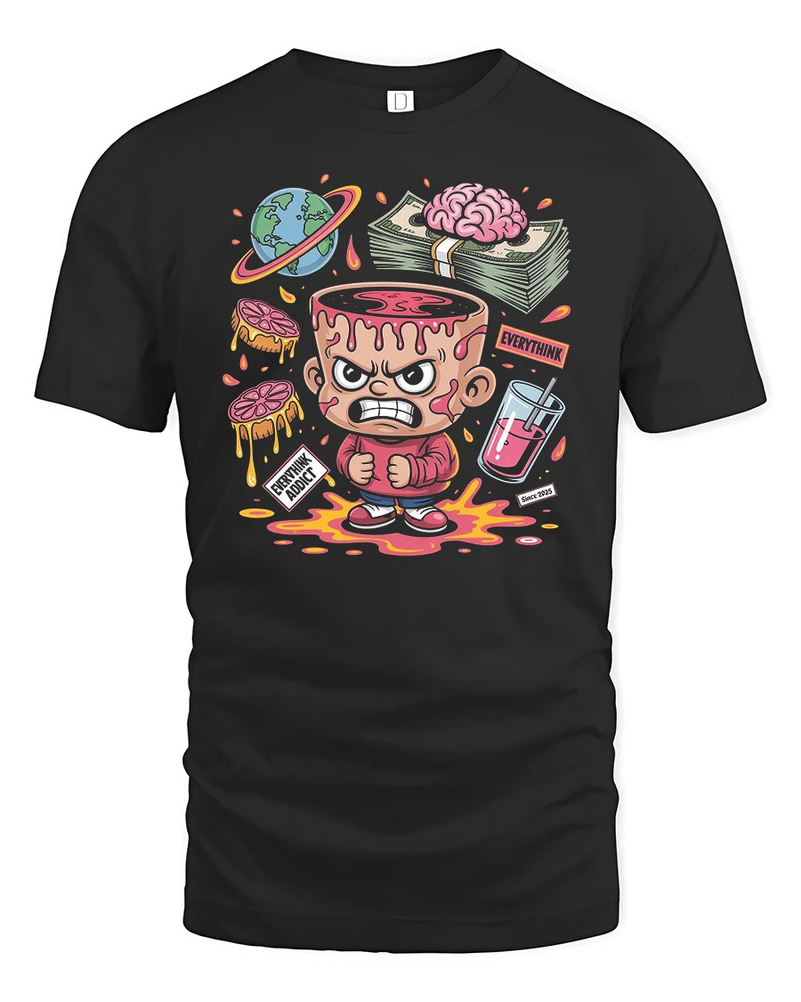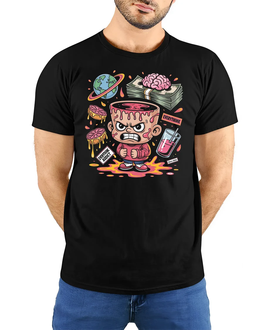 Featuring a bold cartoon character with a dripping brain, stacks of cash, and colorful details, this shirt captures the chaotic yet fun world of overthinking in a playful way.