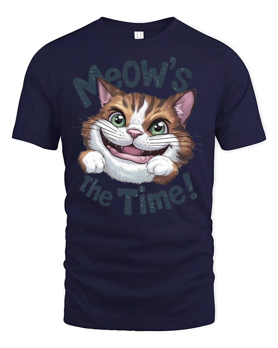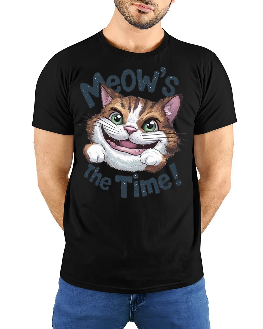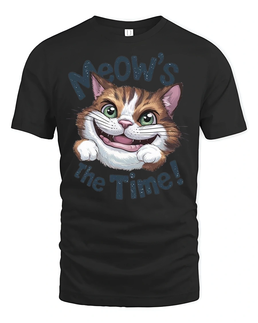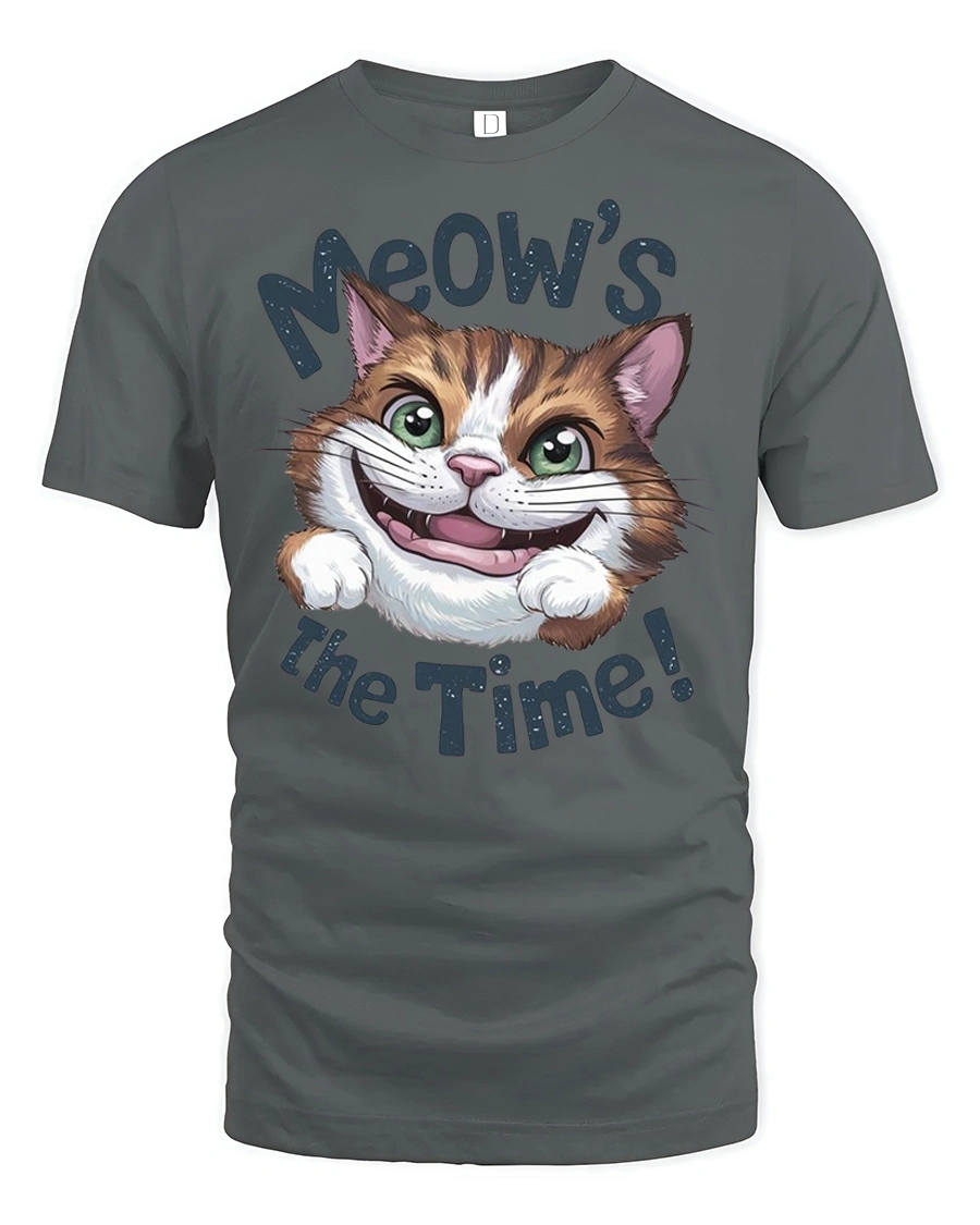 This tee features an adorable cat with big bright eyes and a playful grin paired with the fun phrase Meows The Time that instantly makes people smile.