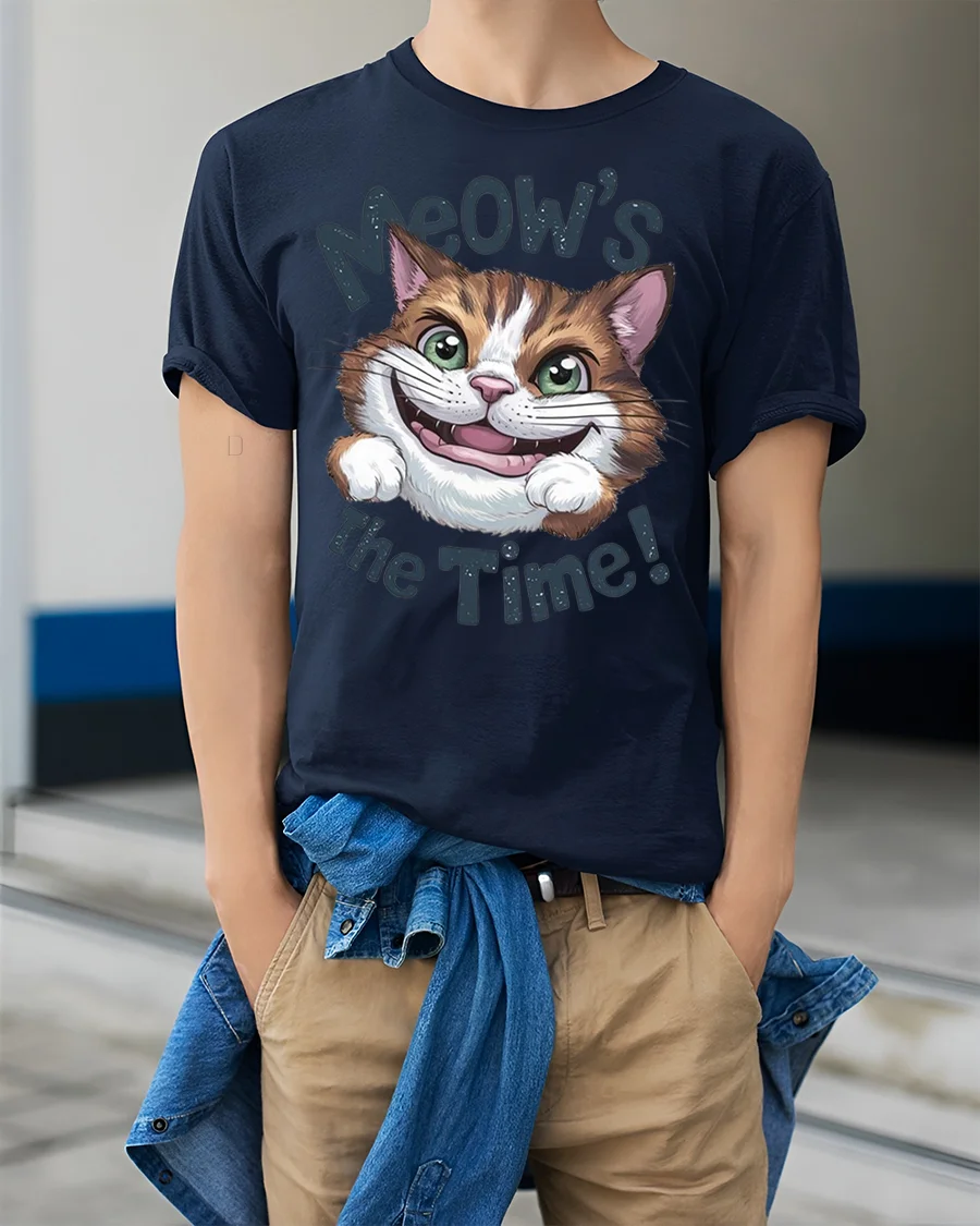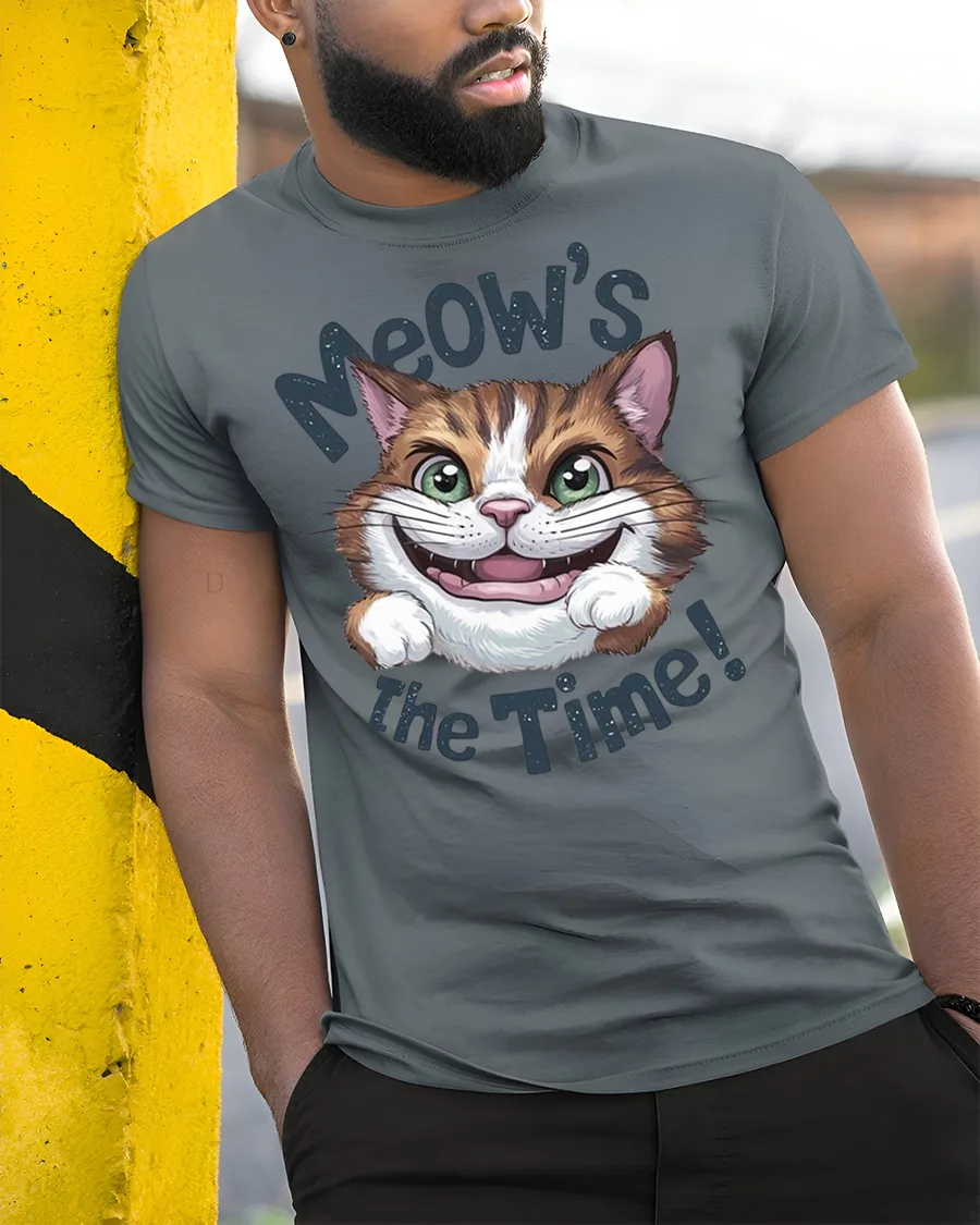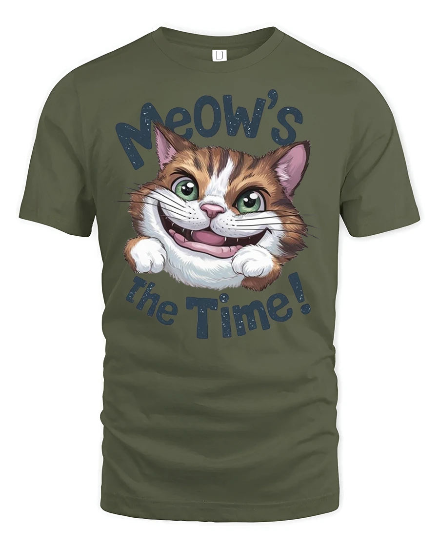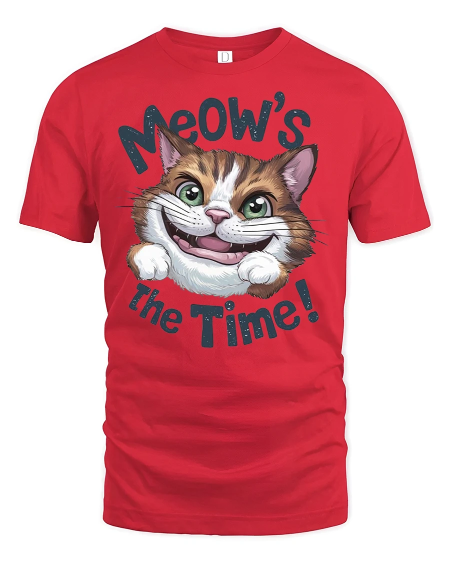 This tee features an adorable cat with big bright eyes and a playful grin paired with the fun phrase Meows The Time that instantly makes people smile.