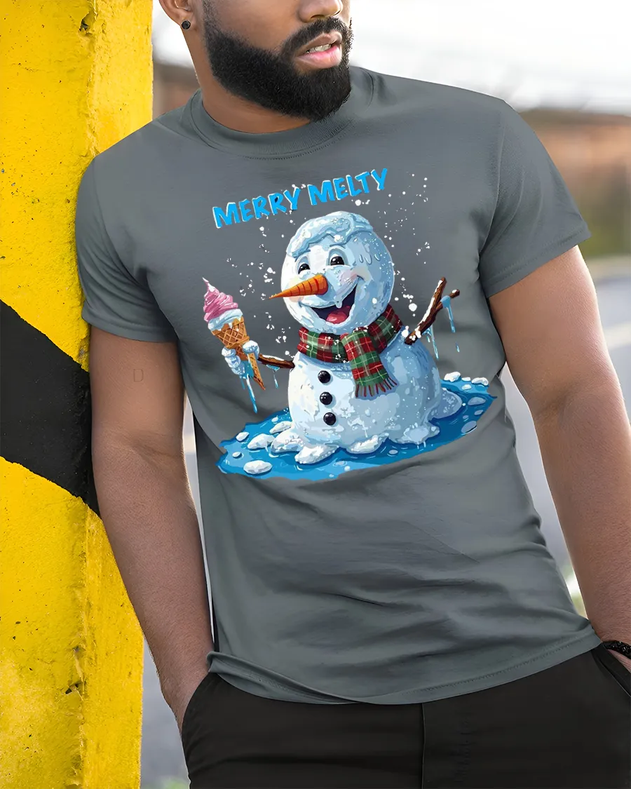 The Merry Melty Snowman Ice Cream Graphic T Shirt Funny Winter Tee brings cheerful humor and festive charm into a playful winter design.