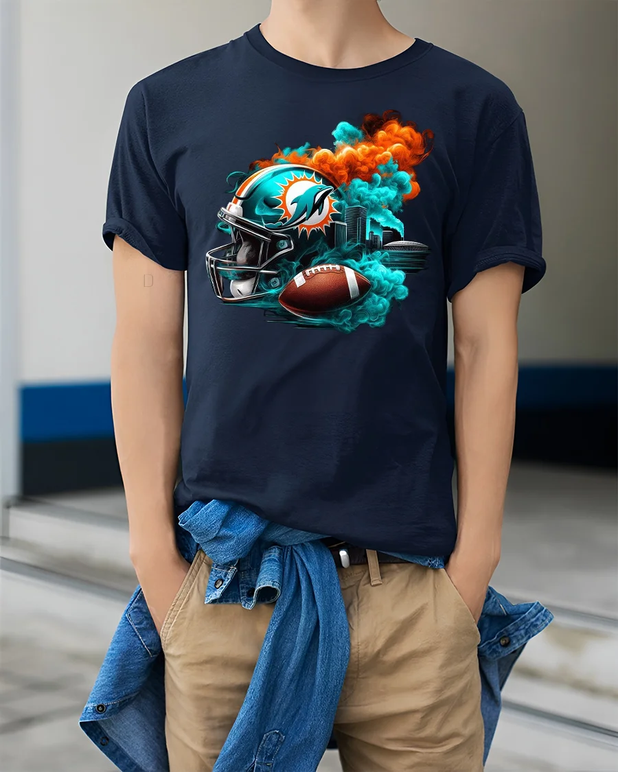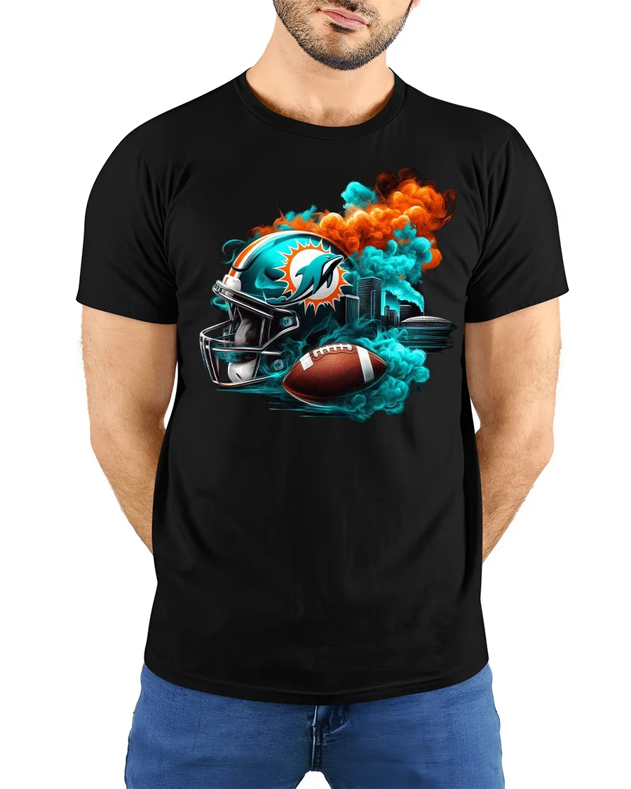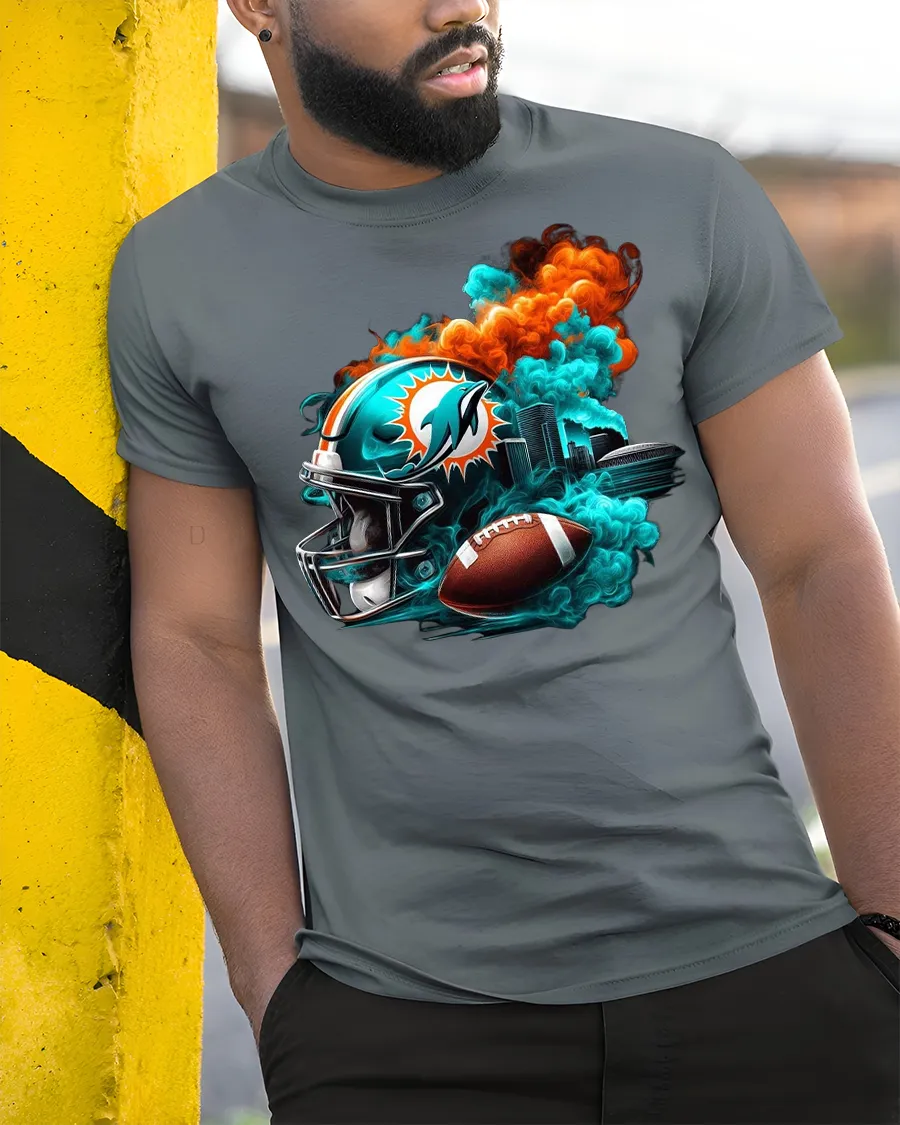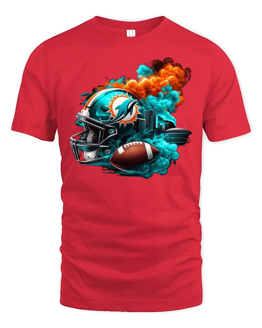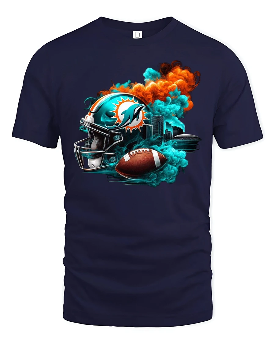 Featuring a bold helmet, football, and fiery smoke in vivid Miami-inspired colors, this design embodies game day excitement and unstoppable team pride.