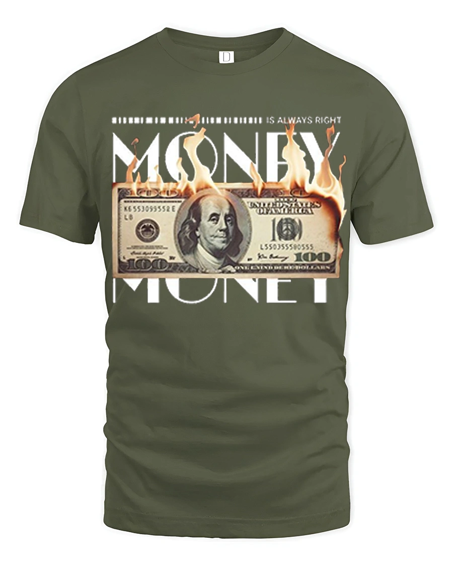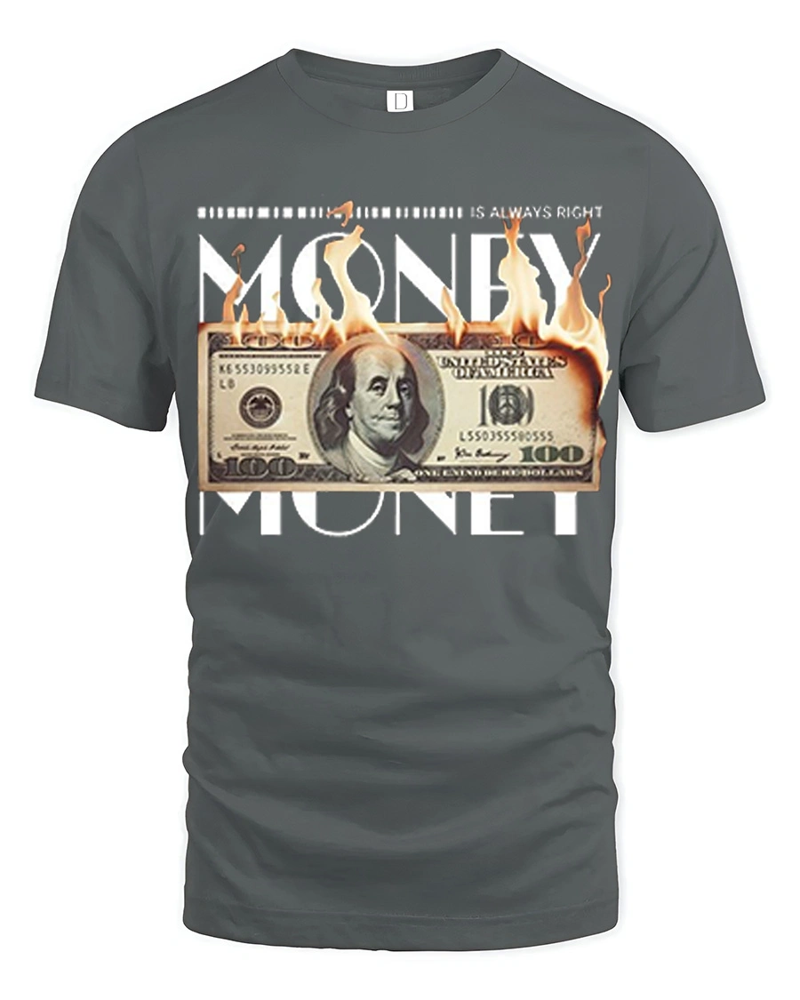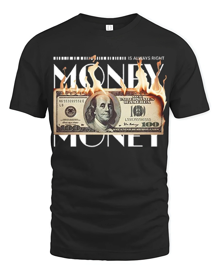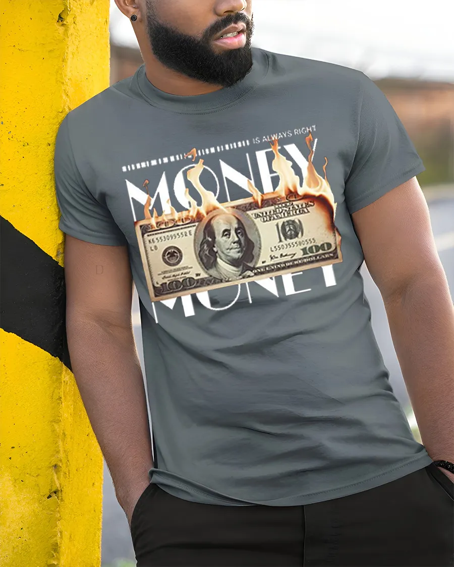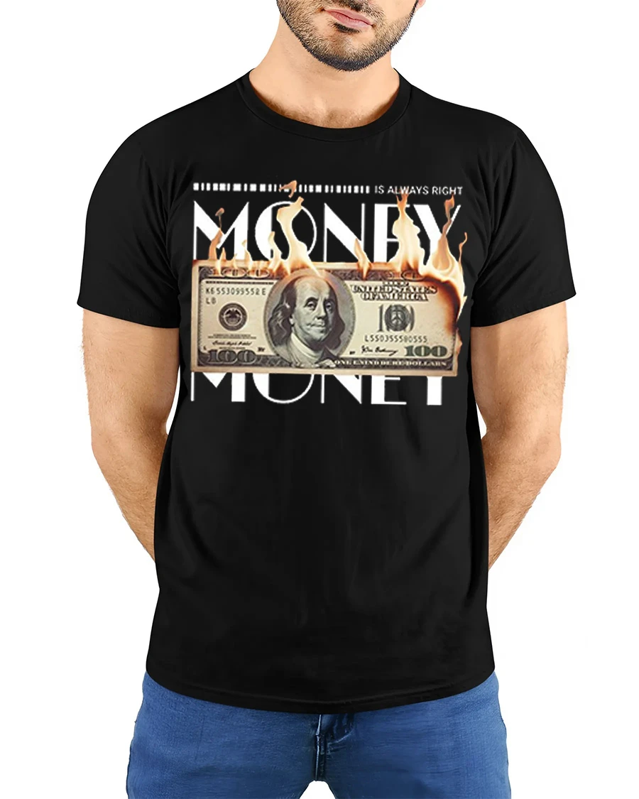 The Money Is Always Right Burning Dollar Funny Graphic Tee Shirt features a bold design that blends humor, attitude, and striking visual style.