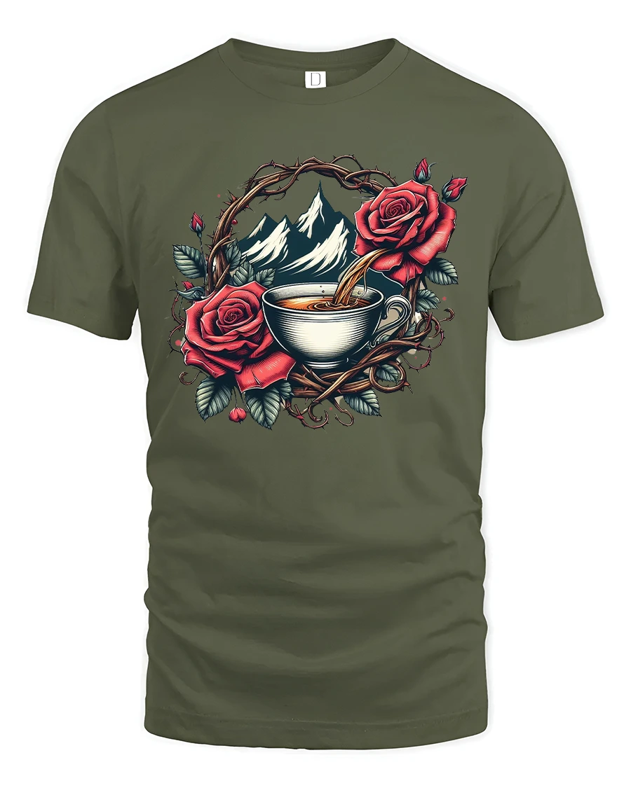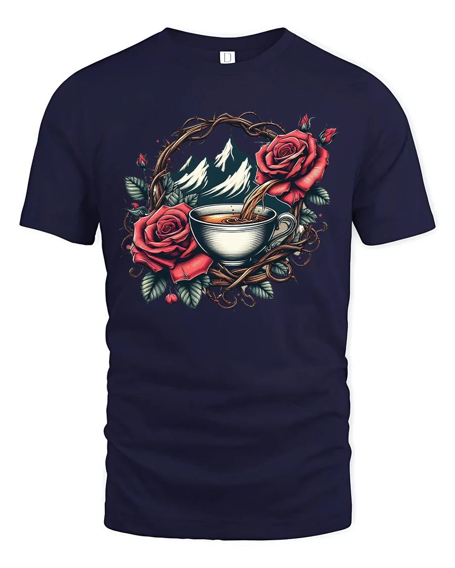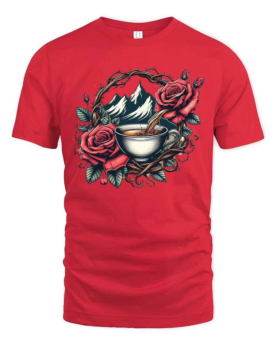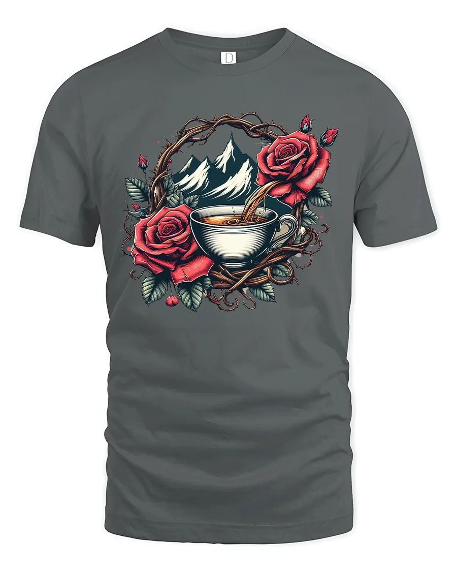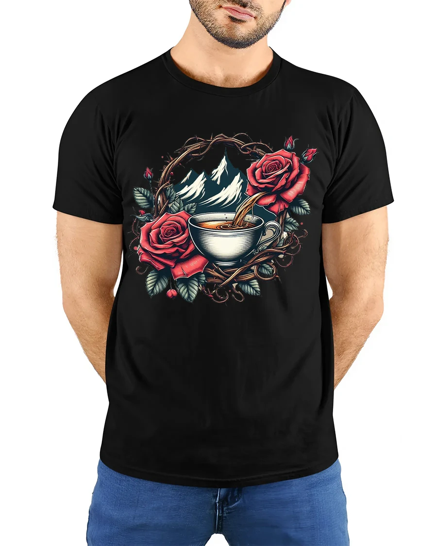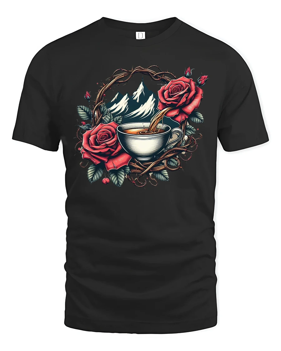 This Mountain Coffee Rose Graphic T Shirt blends natural beauty with artistic elegance through a detailed illustration of a warm coffee cup framed by roses and mountain scenery.