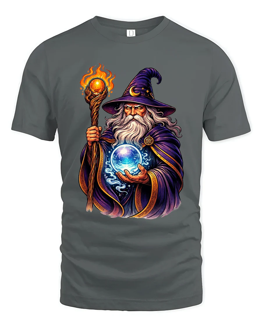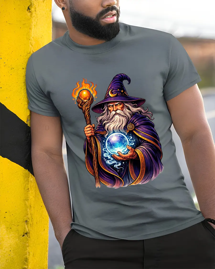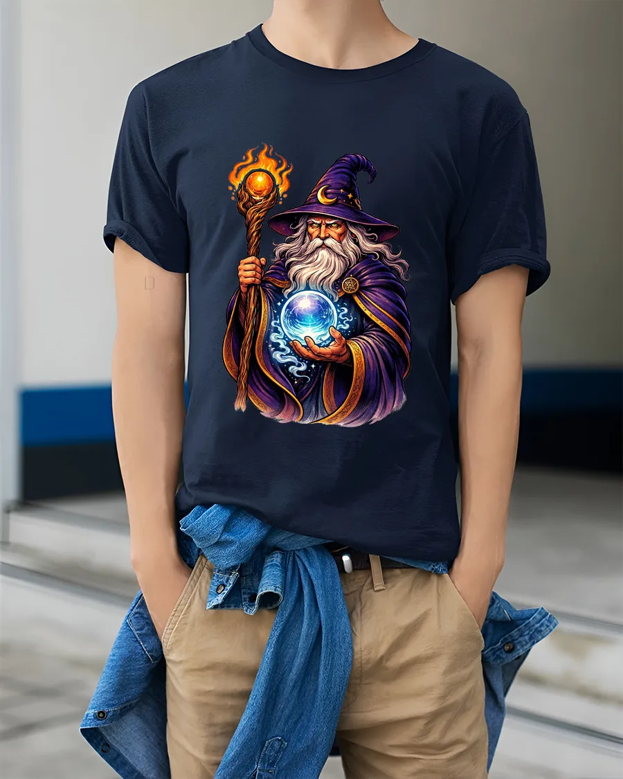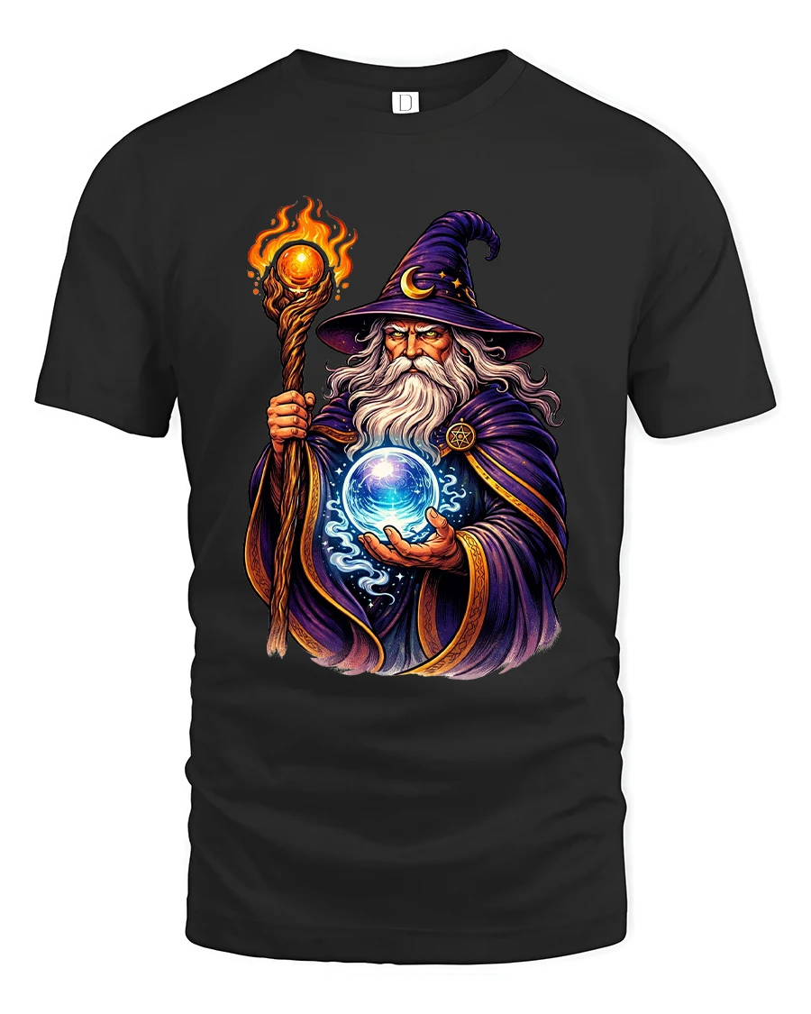 Mystic Wizard With Magic Orb Graphic T Shirt brings legendary fantasy energy to life with a striking illustration of a powerful spellcaster holding a glowing crystal orb. The detailed artwork showcases flowing robes, a blazing staff, and vibrant magical effects that create a bold and captivating visual. Inspired by classic fantasy storytelling, this tshirt captures the mystery, wisdom, and power associated with arcane magic.