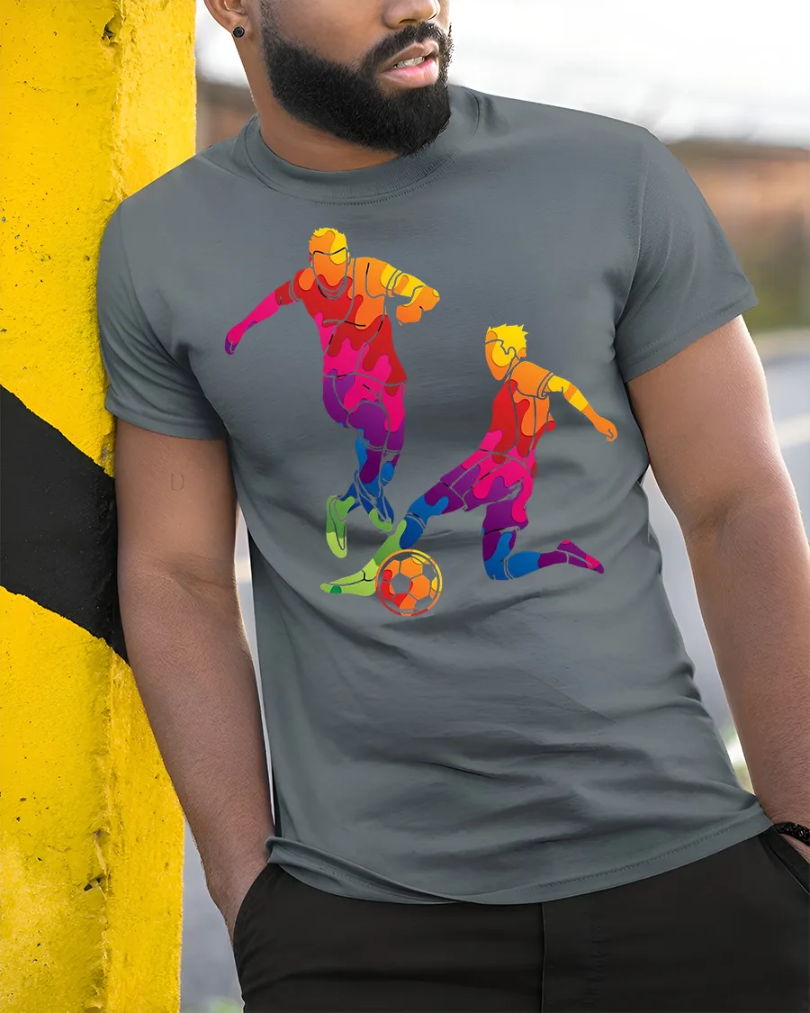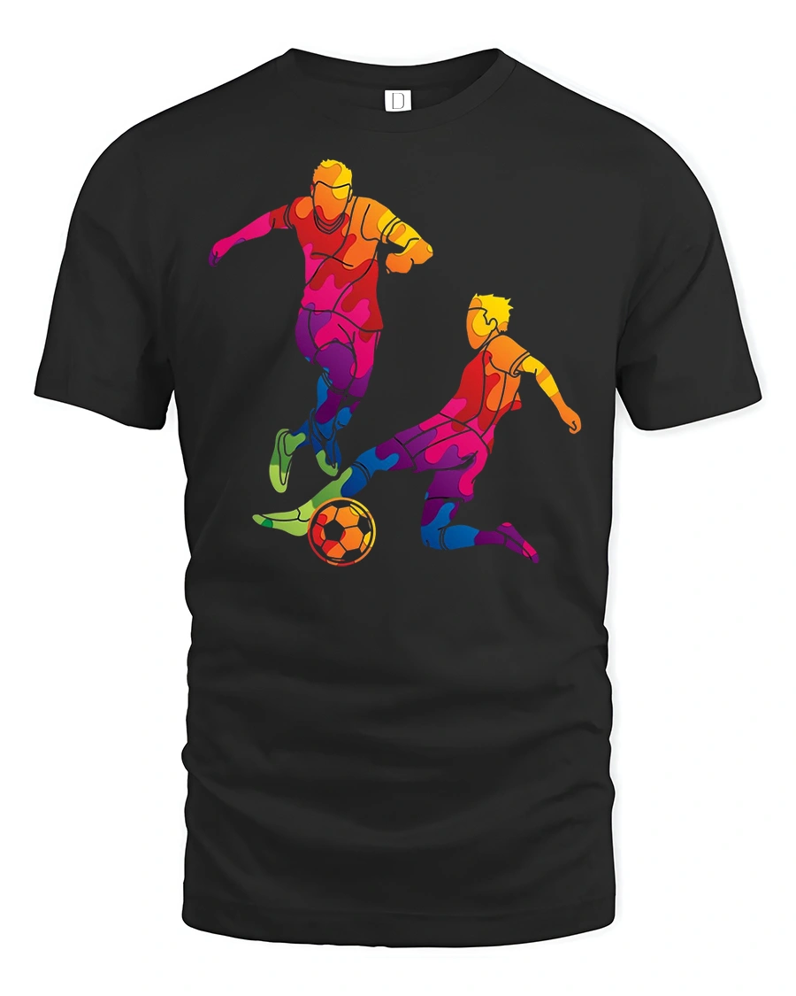 Add bold energy to your wardrobe with the Rainbow Soccer Players Silhouette Graphic Tee. Featuring two dynamic soccer players in a colorful rainbow silhouette style, this shirt is perfect for anyone who loves the sport and enjoys eye-catching designs. The unique multicolor pattern captures the excitement and movement of the game, making it a standout piece for casual wear or game day.
