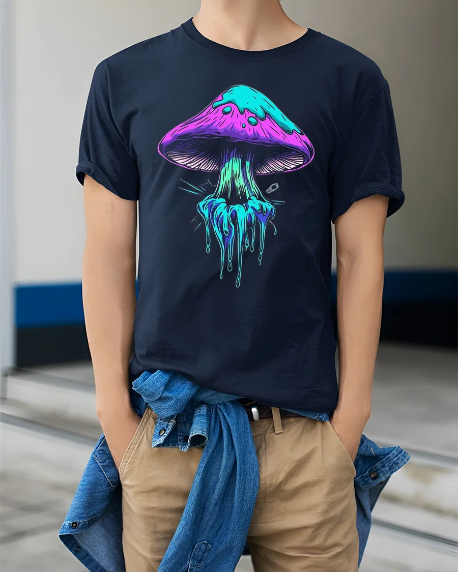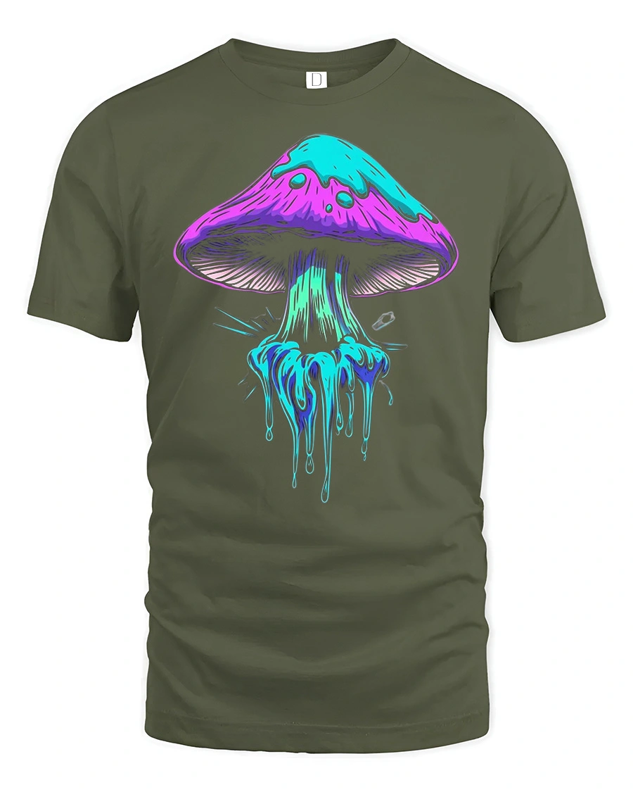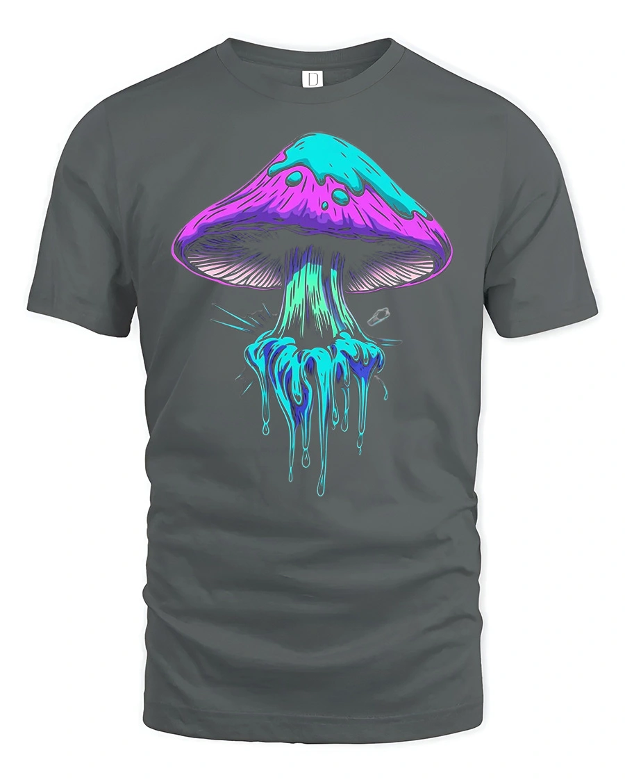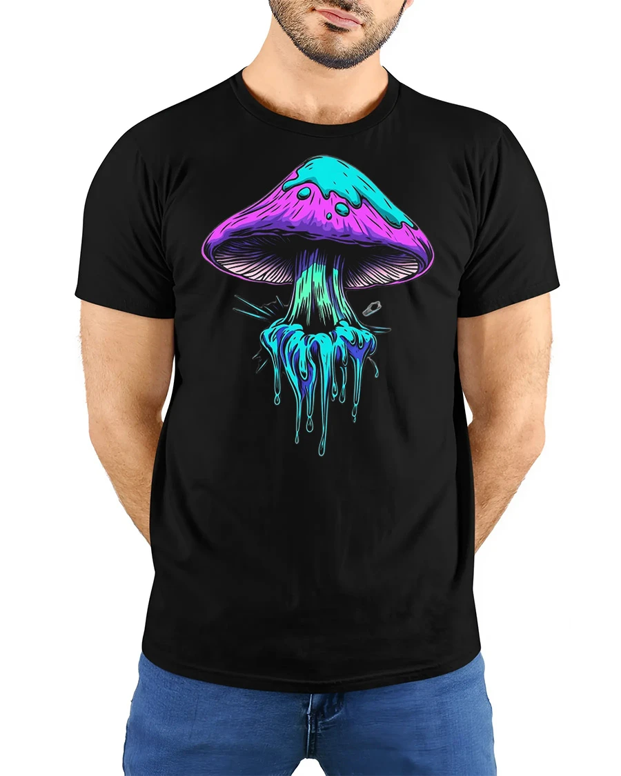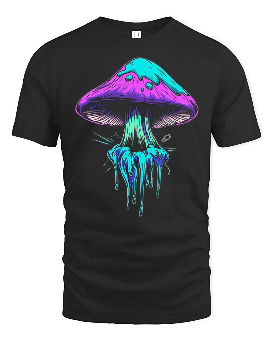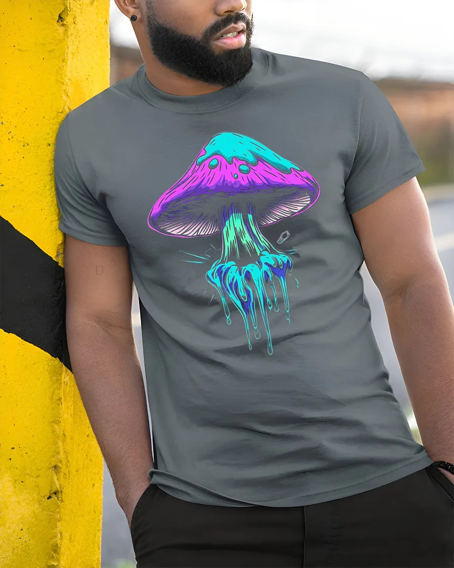 The Neon Dripping Mushroom Graphic Tee Psychedelic Art Tshirt features a bold and colorful mushroom design with neon dripping effects that create a trippy and artistic visual style.