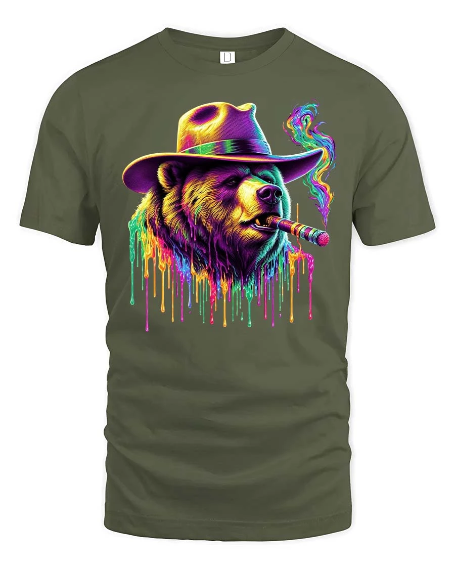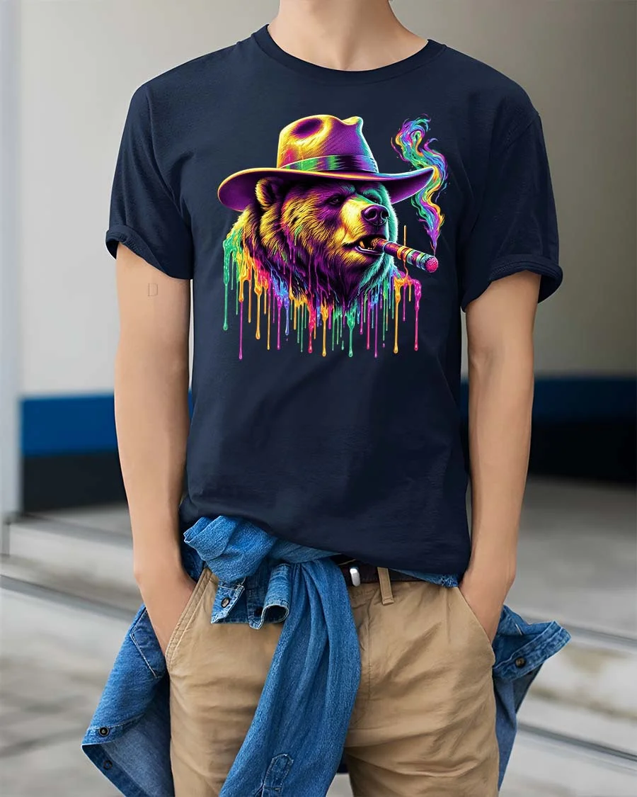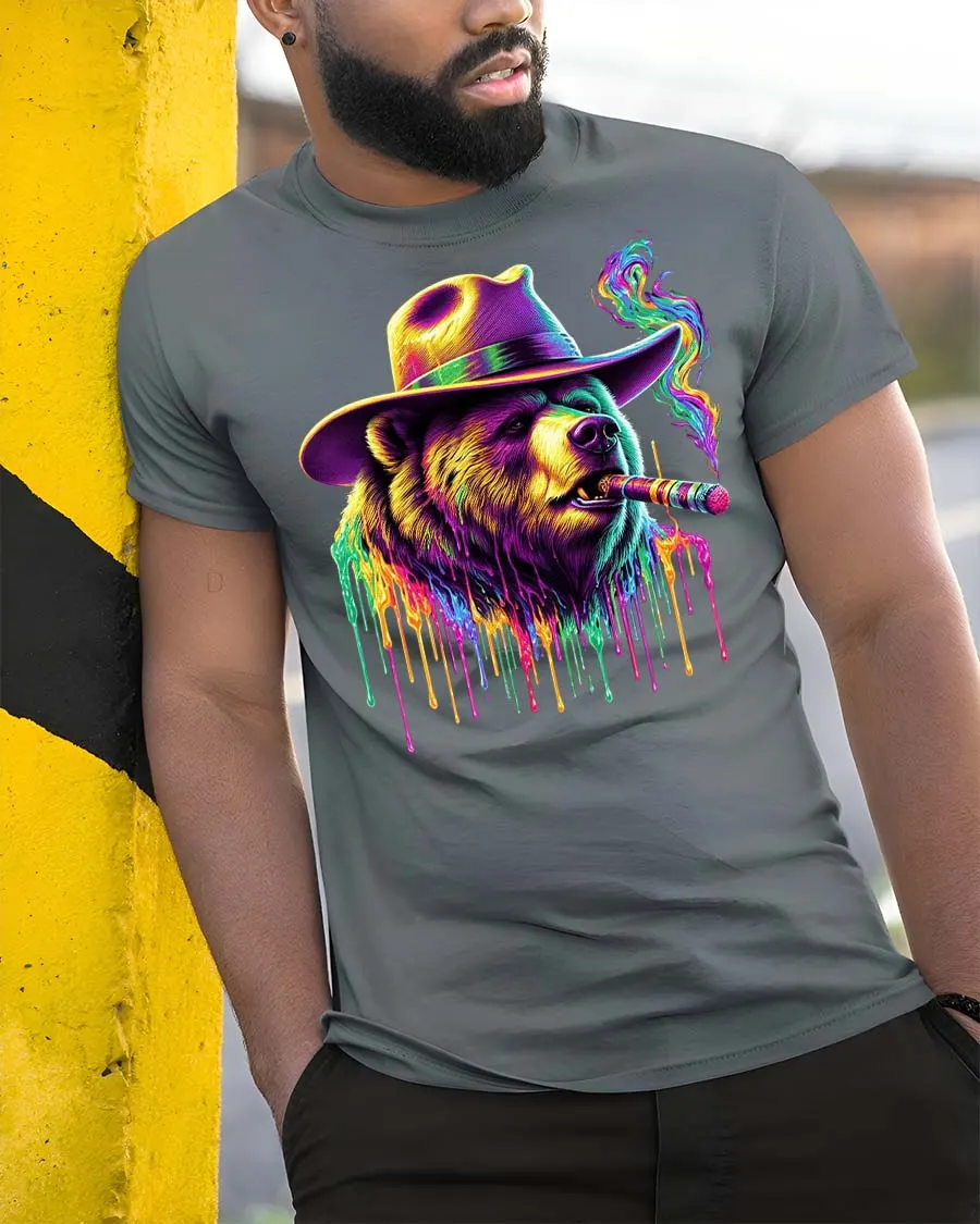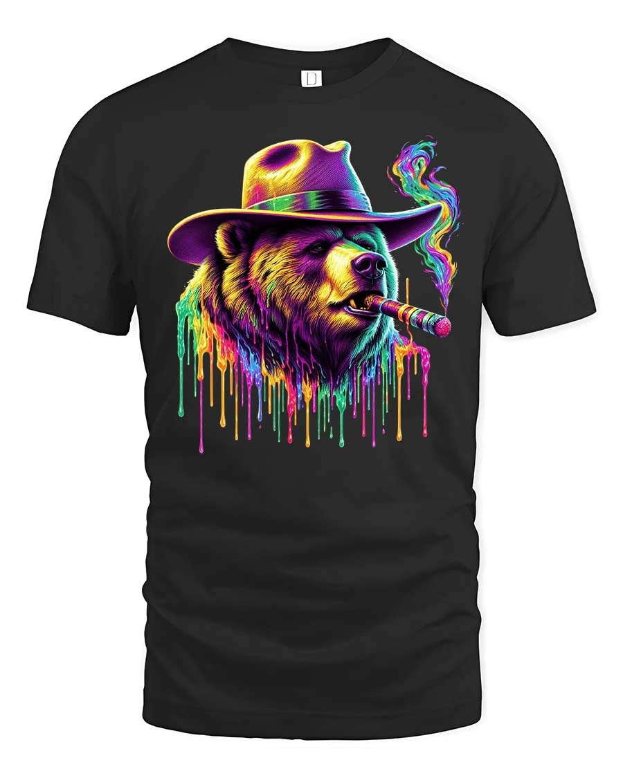 Neon Mafia Bear Tee with Colorful Cigar Smoke Drip Art Style delivers a powerful mix of street attitude and bold artistic flair. Featuring a fierce bear wearing a wide-brimmed hat and smoking a glowing cigar, this graphic tee explodes with neon colors and dripping paint effects. The vibrant purples, greens, yellows, and electric highlights create a striking psychedelic look that stands out instantly, whether day or night.