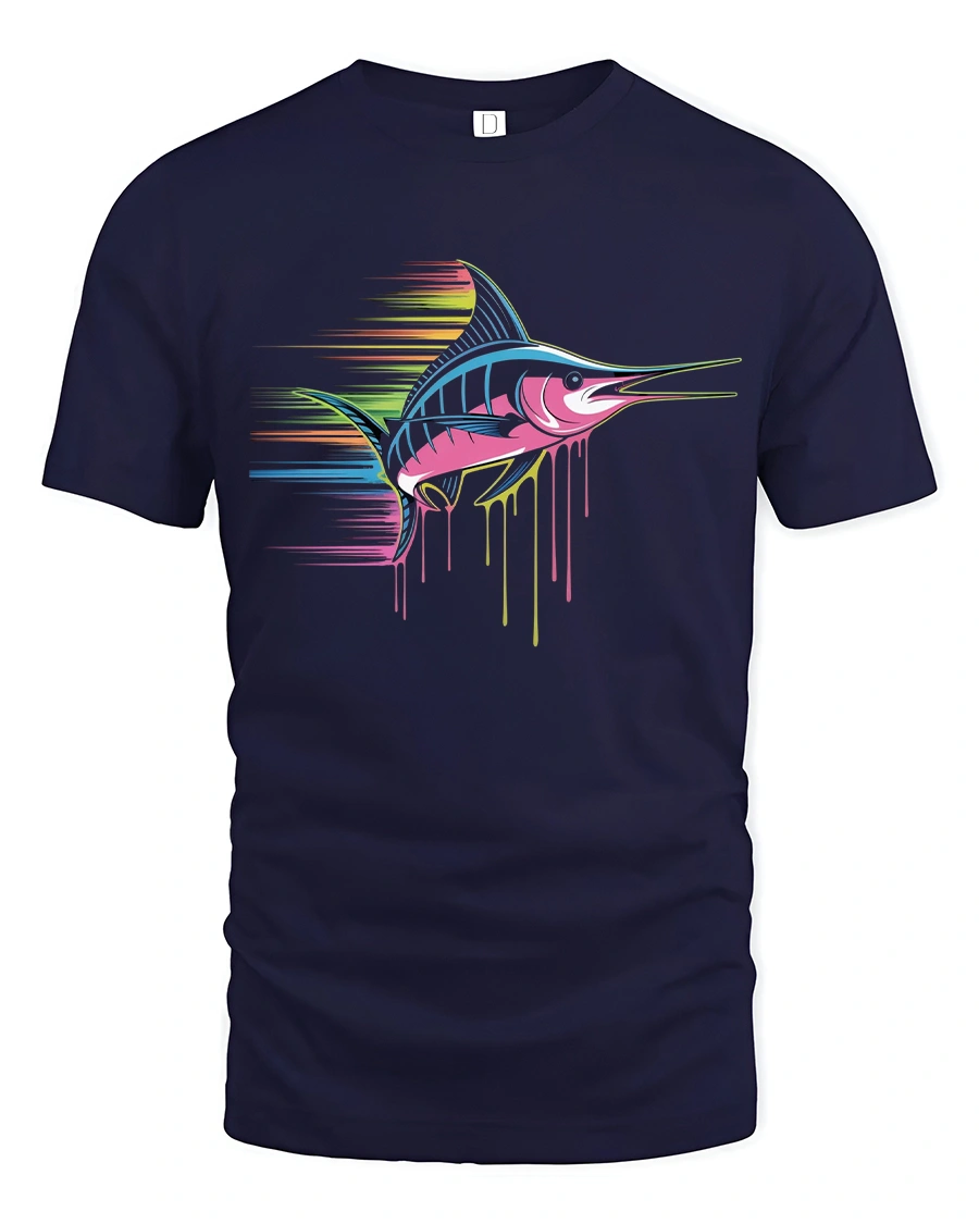 Featuring a stunning marlin in motion, this vibrant design blends neon shades and paint drips for a fast, fluid effect that catches attention instantly.