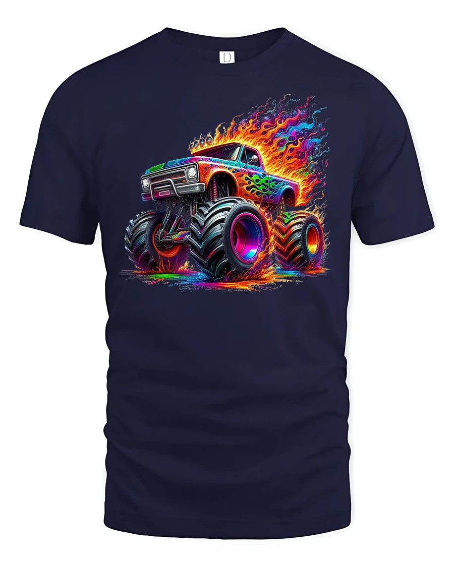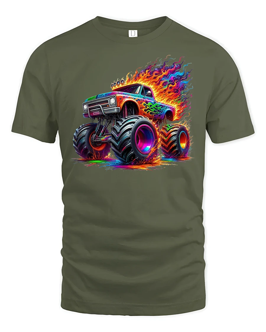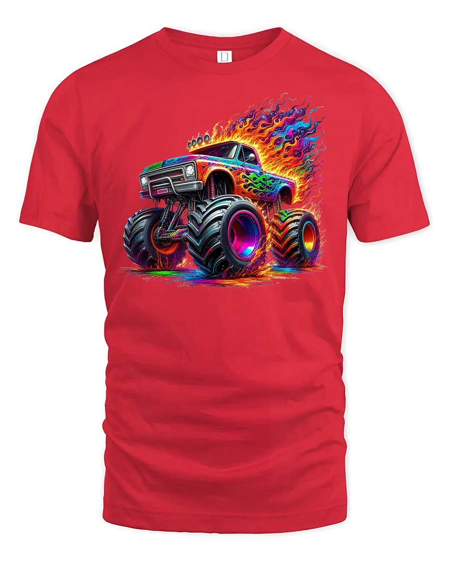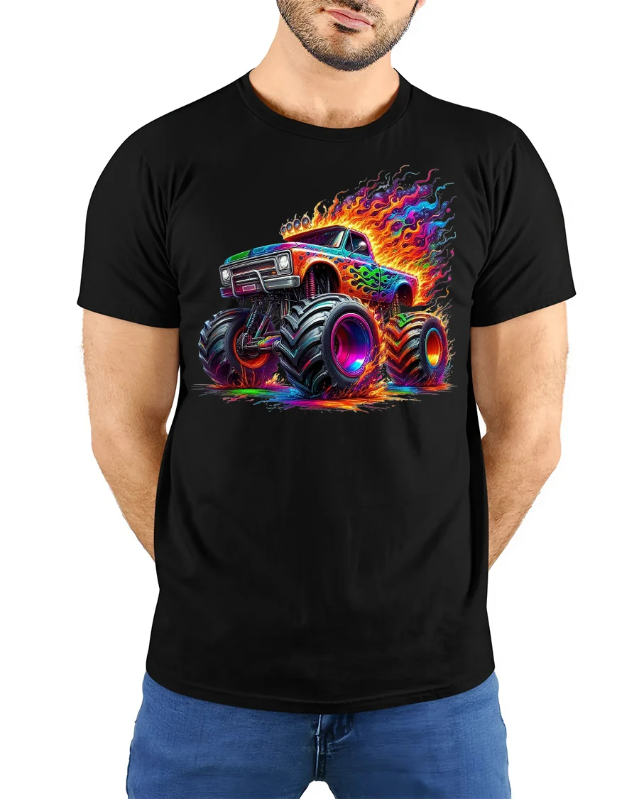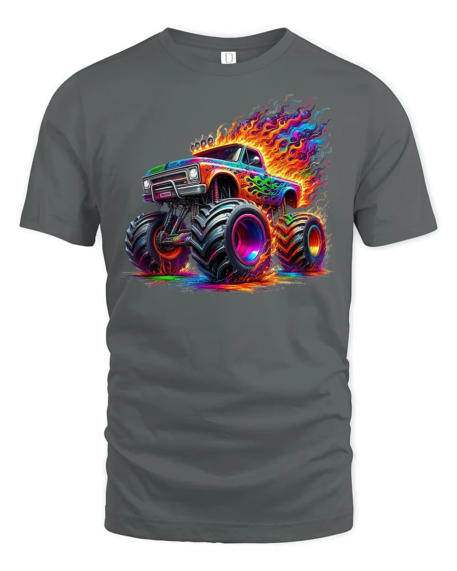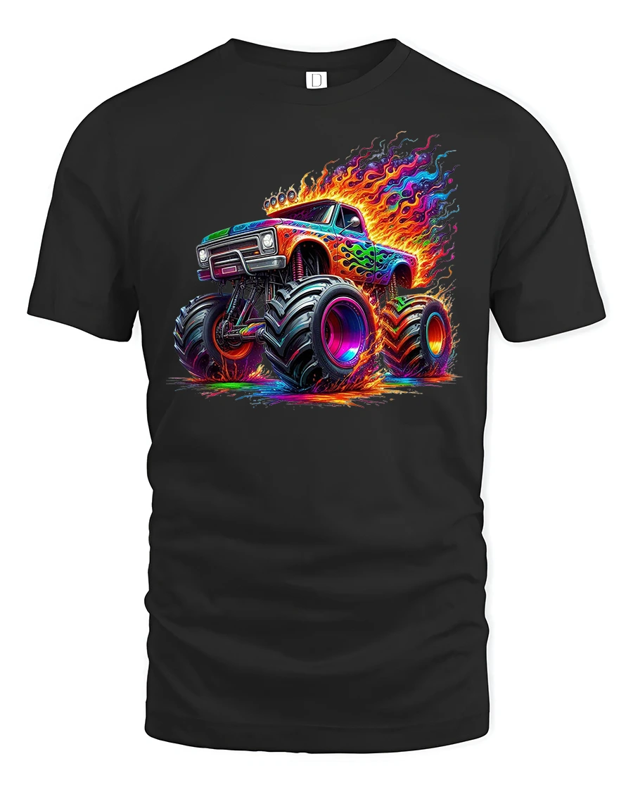 Get ready to roll in style with the Neon Monster Truck Fire Power Graphic T-Shirt.
