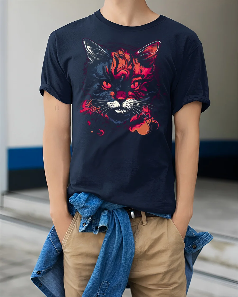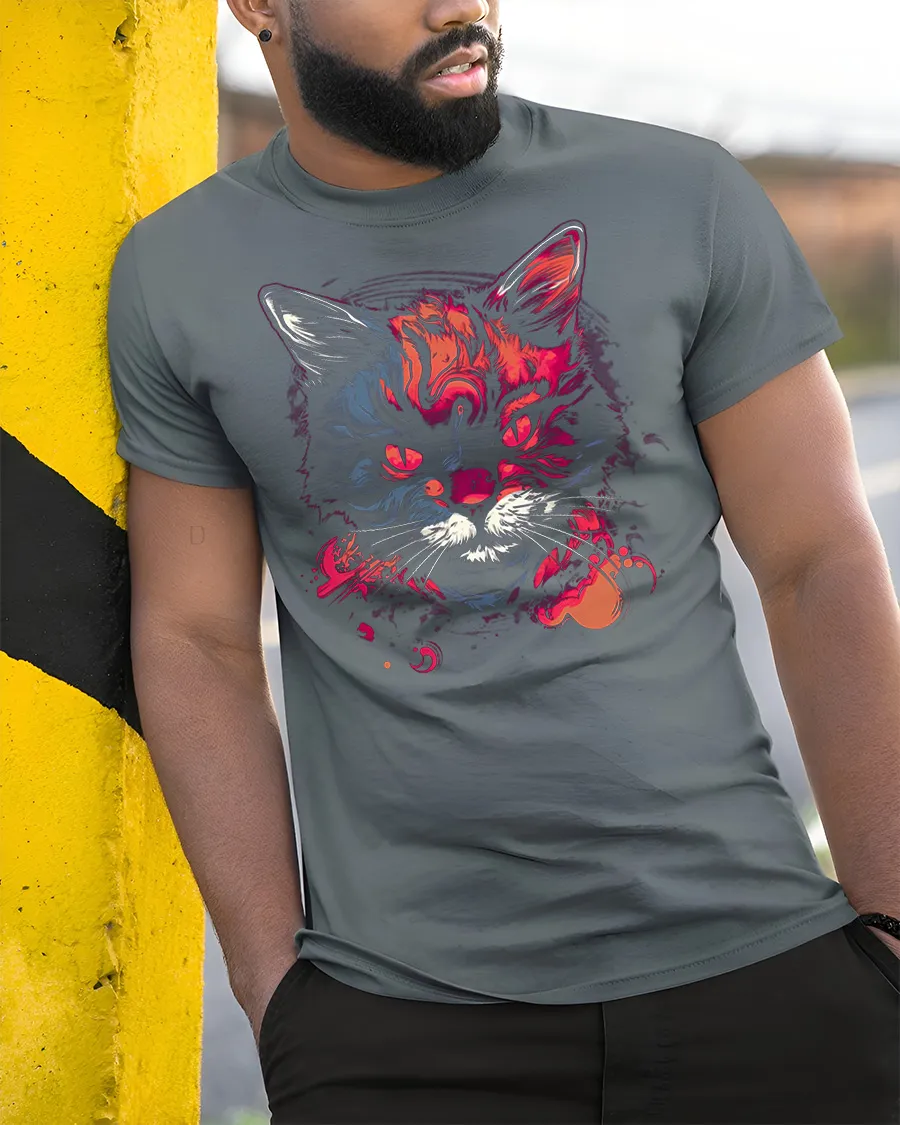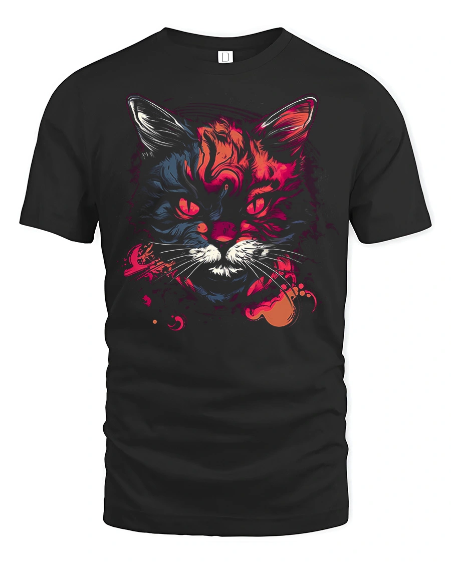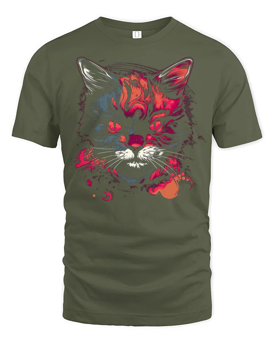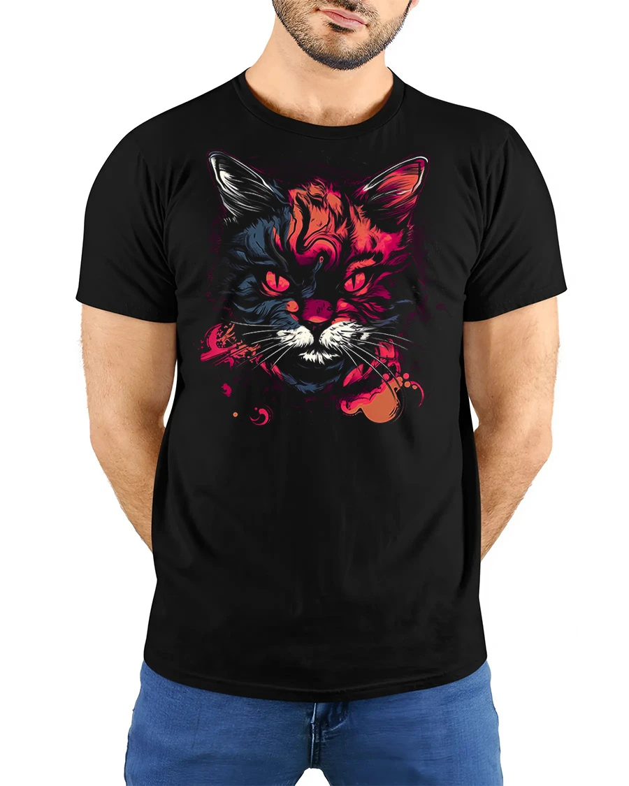 This striking design features a fierce cat face brought to life with vibrant neon colors and artistic splashes that create a powerful visual impact.