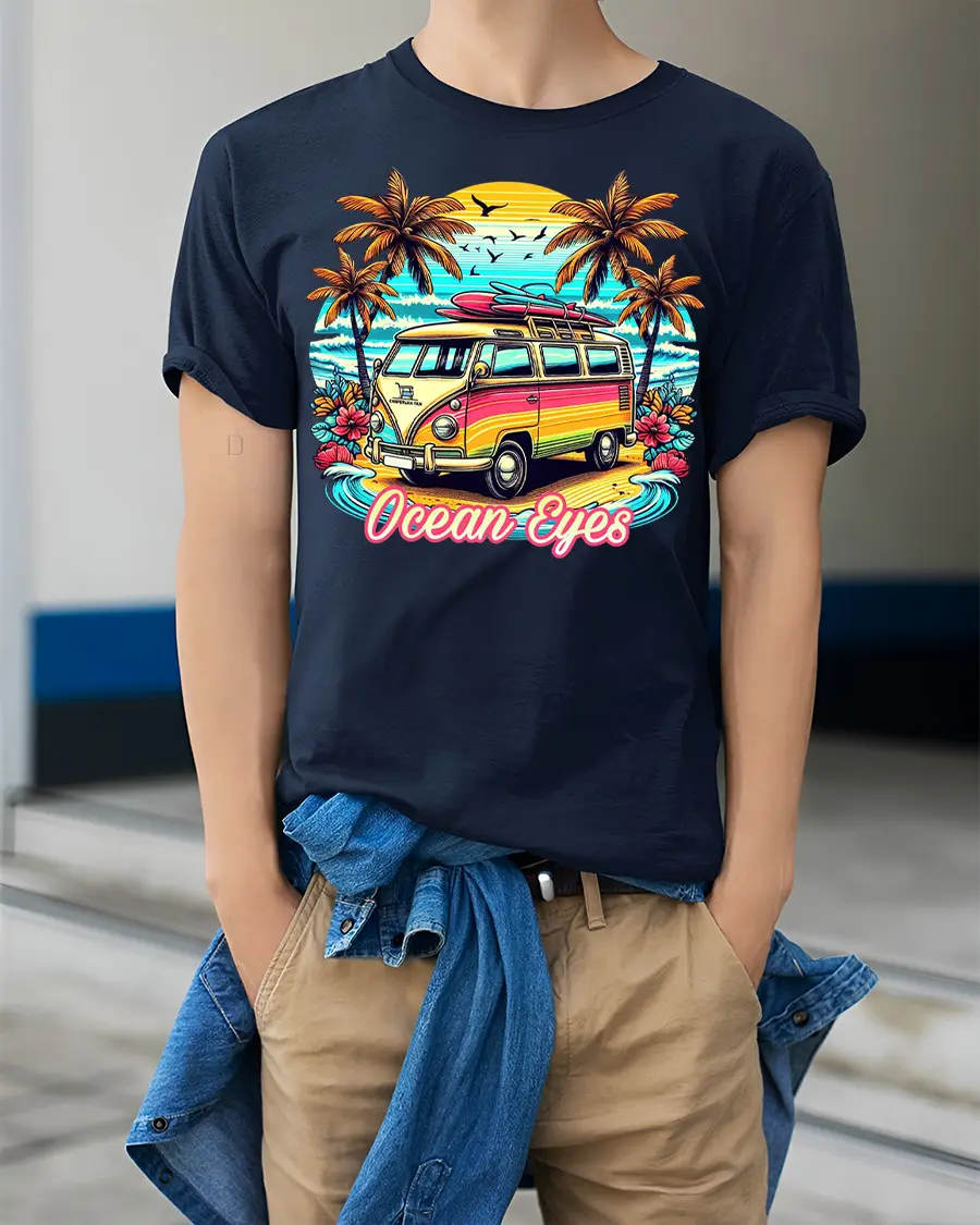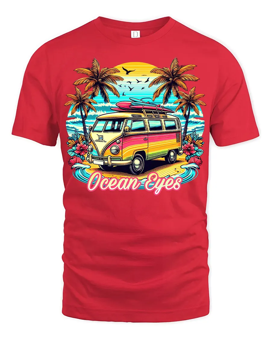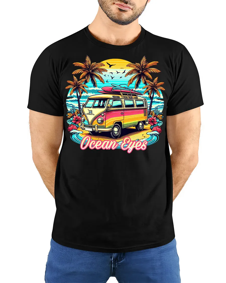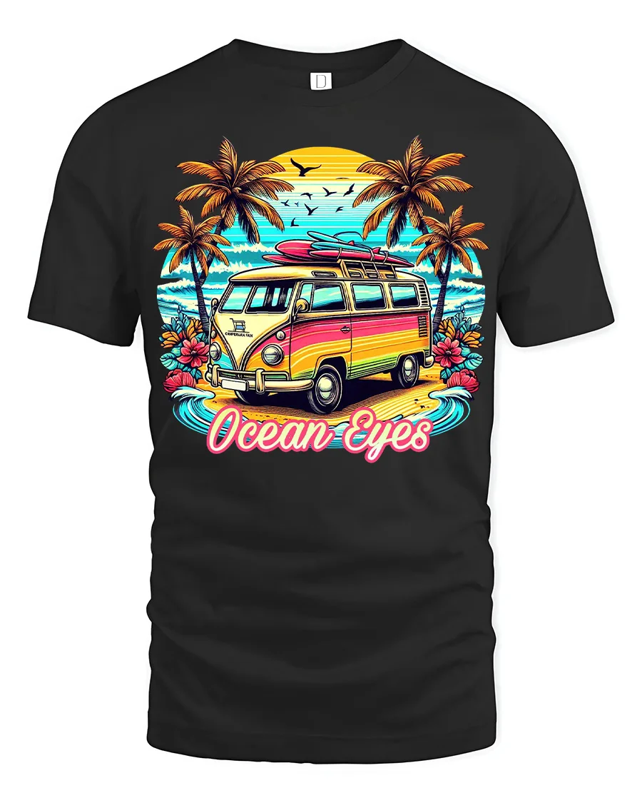 Ocean Eyes Surf Van Beach Graphic Tshirt Retro Summer Vibe brings a vibrant coastal scene to life with a colorful camper van set against a stunning sunset beach backdrop.