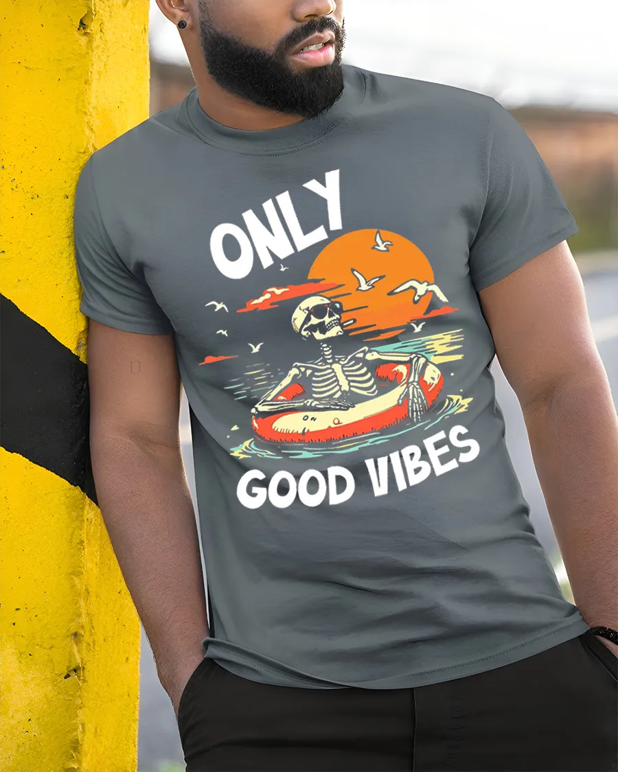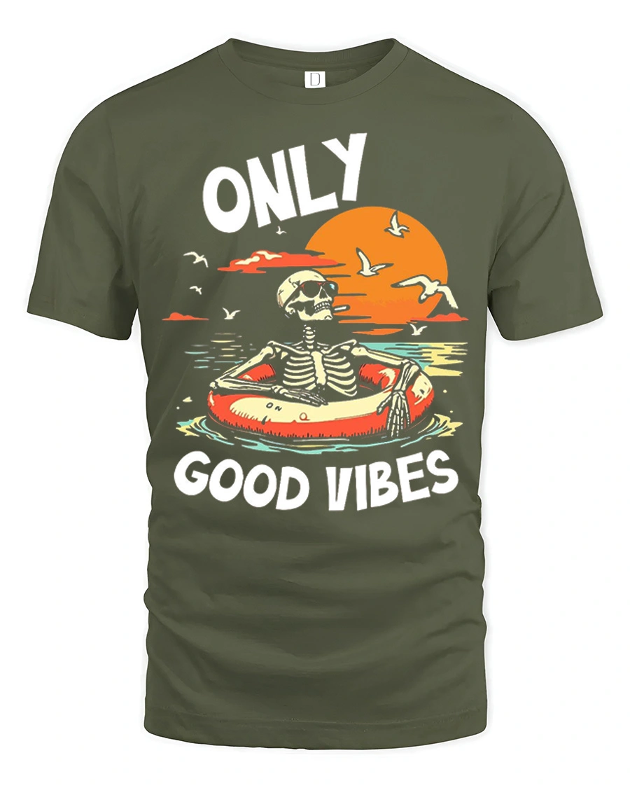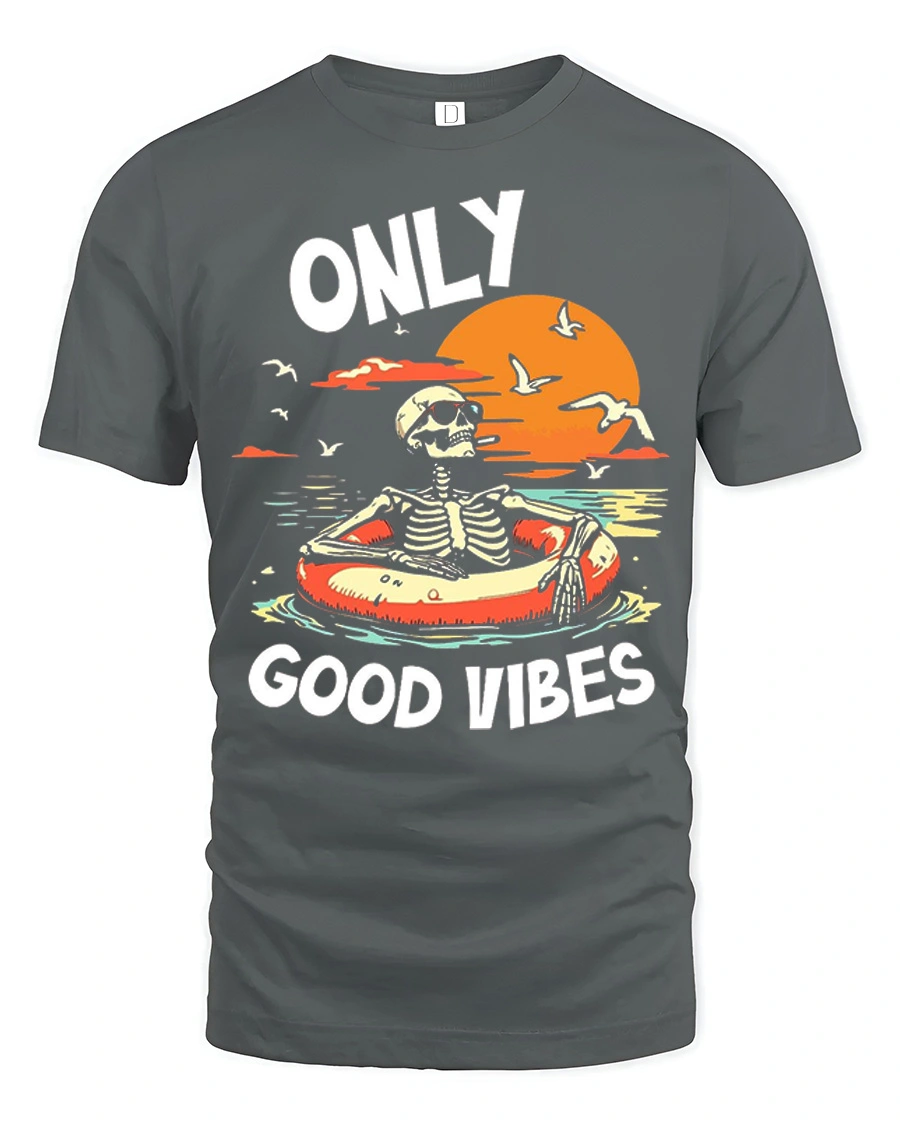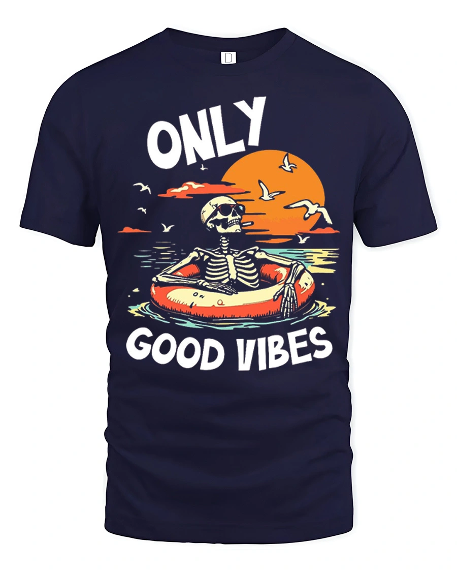 This only good vibes skeleton beach graphic t shirt design celebrates relaxation, humor, and the joy of enjoying life with a carefree attitude.