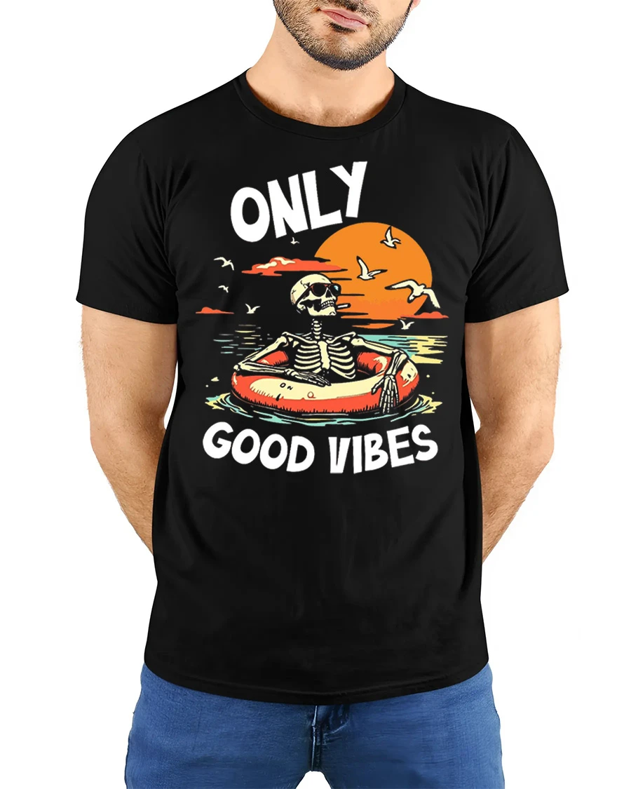 Only Good Vibes Skeleton Beach Graphic T Shirt Funny Summer Vibe Tee features a playful skeleton relaxing on a floating ring in the ocean during a bright sunset scene.
