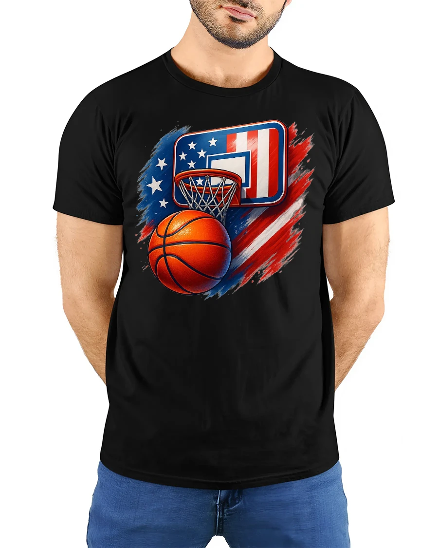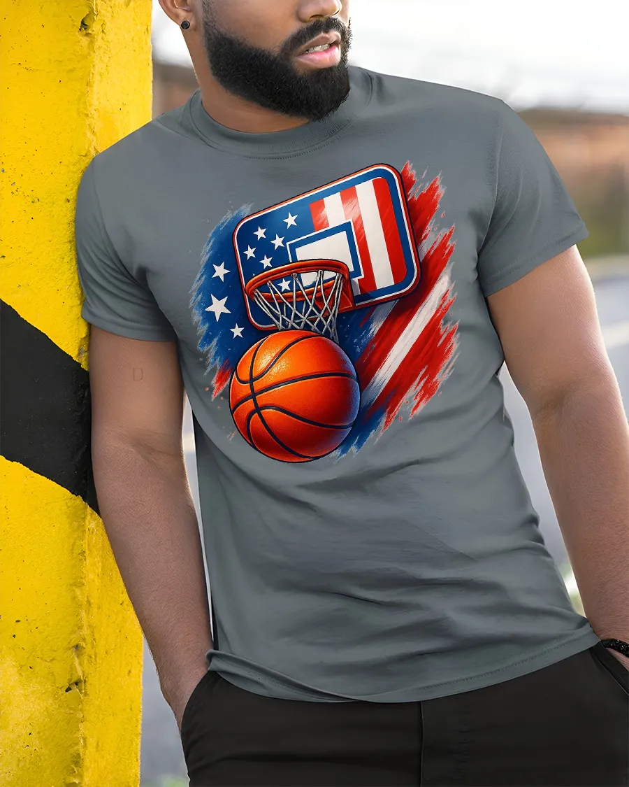 Celebrate your love for sports and country with the Patriotic Basketball USA Flag Slam Dunk Print Tee. This bold design features a dynamic basketball flying into the hoop with stars and stripes in the background, creating a powerful combination of athletic passion and American pride. Perfect for basketball fans, sports enthusiasts, and those who love stylish patriotic apparel, this tee is a slam dunk for your casual wardrobe.