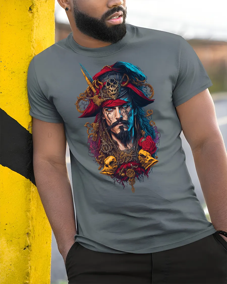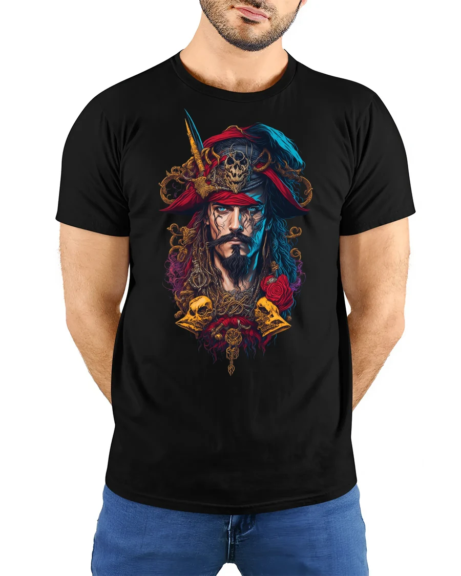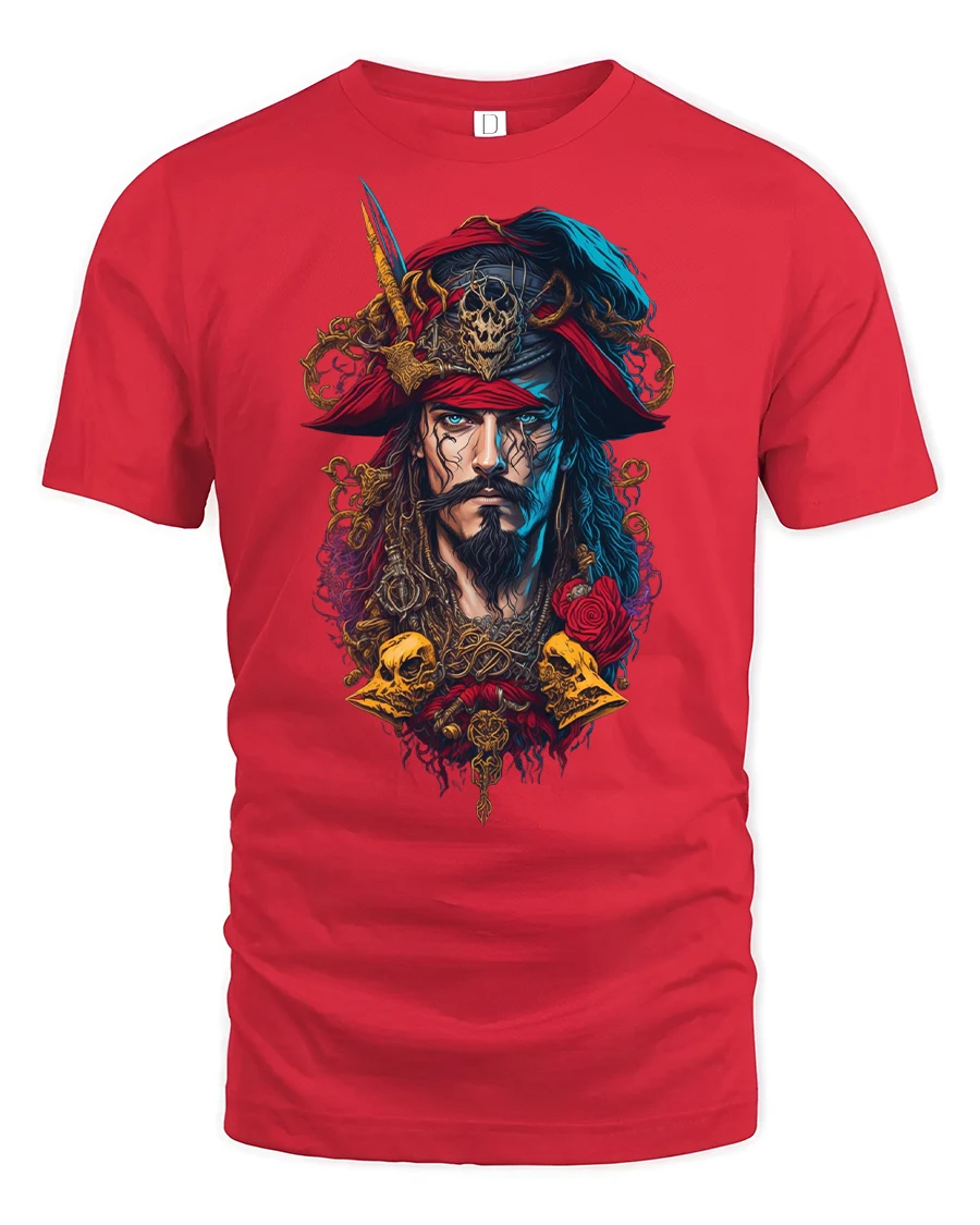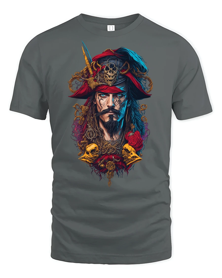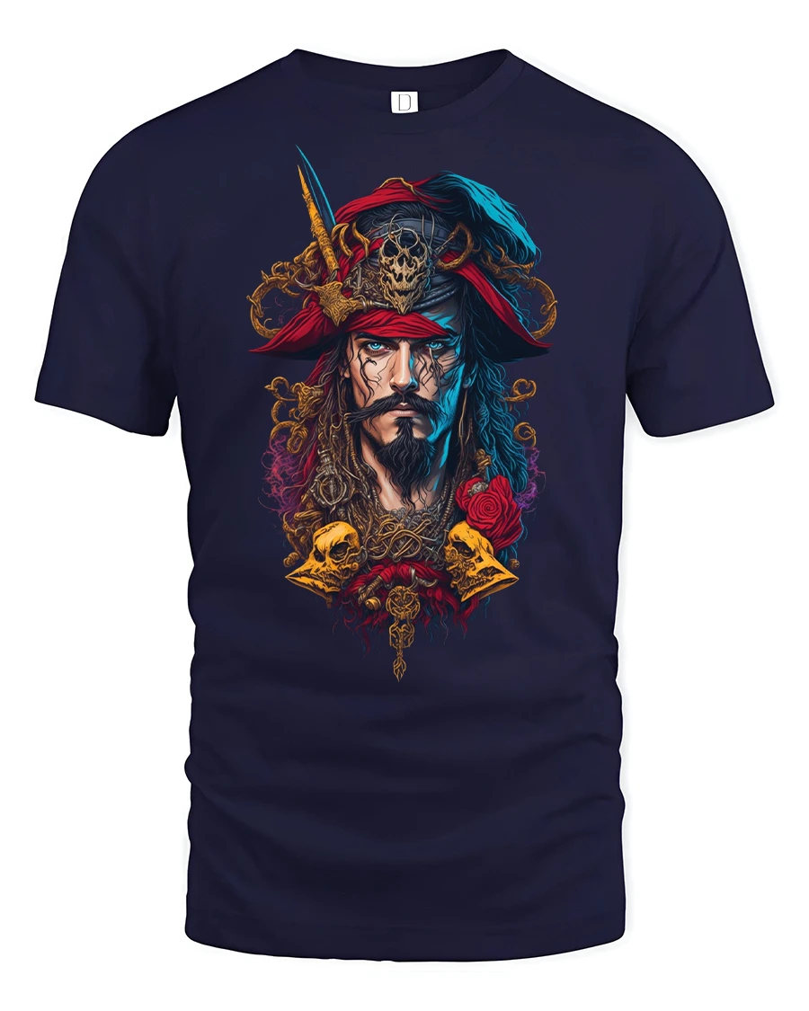 Set sail in style with this Pirate Skull T-Shirt, featuring a striking pirate captain surrounded by skulls, roses, and intricate gothic details. This design captures the fearless spirit of adventure, danger, and mystery — perfect for fans of pirates, fantasy art, or bold statement fashion. The intense colors and detailed artwork make this tee an unforgettable piece for any wardrobe.