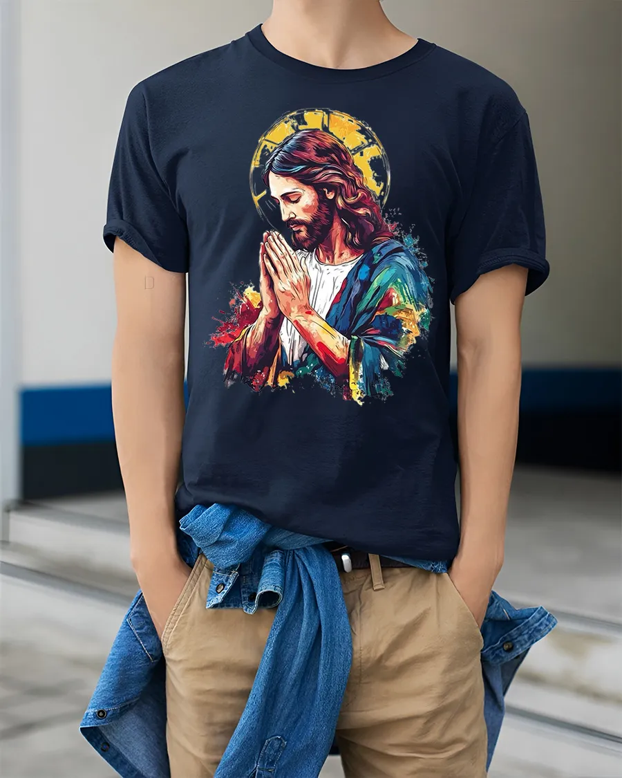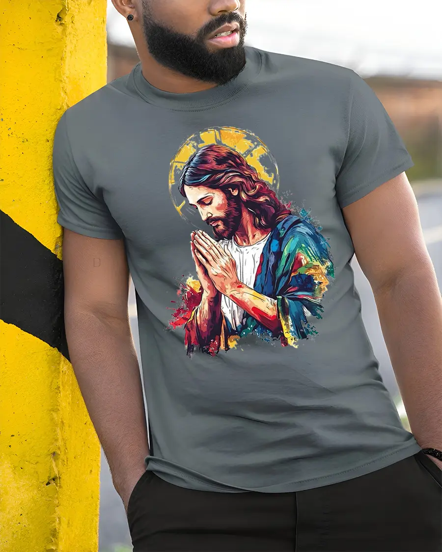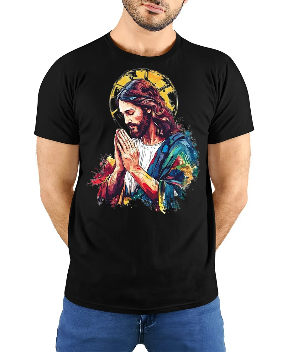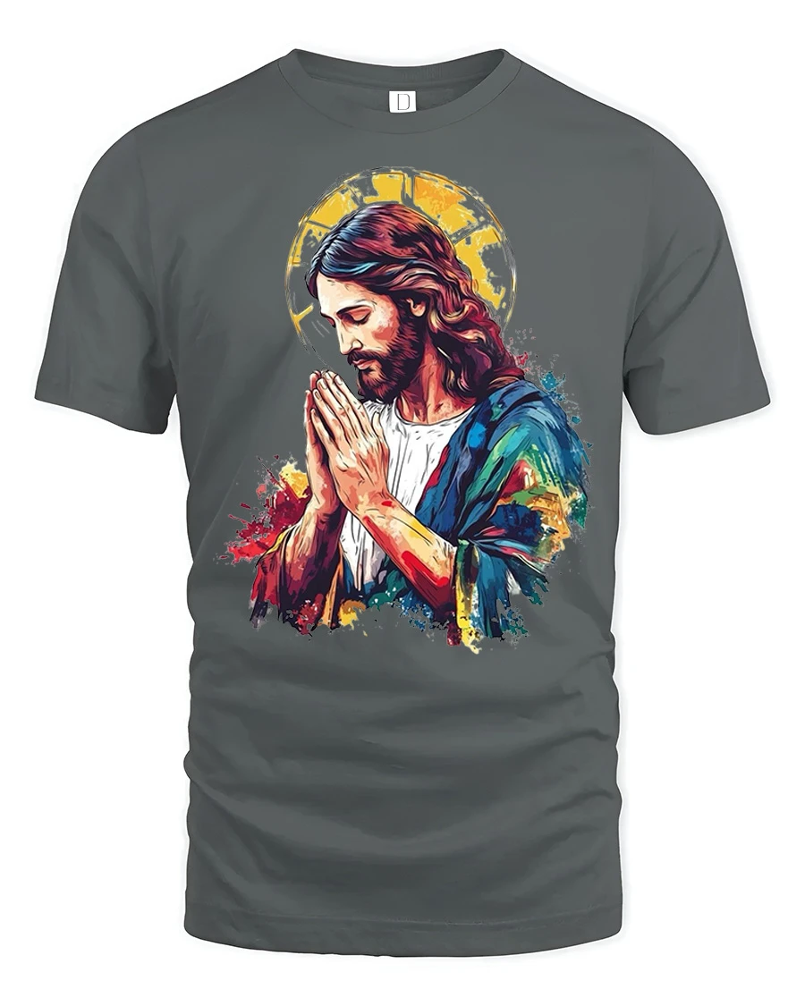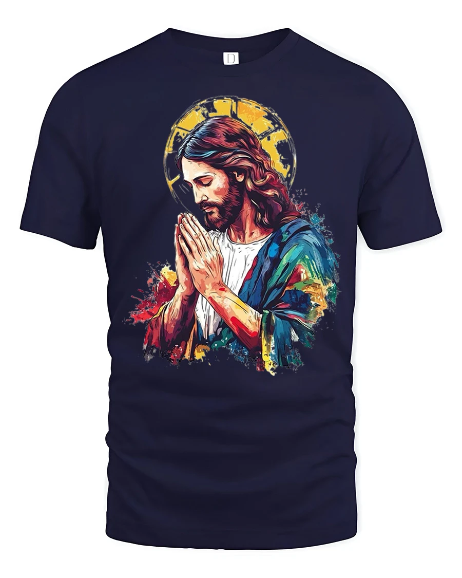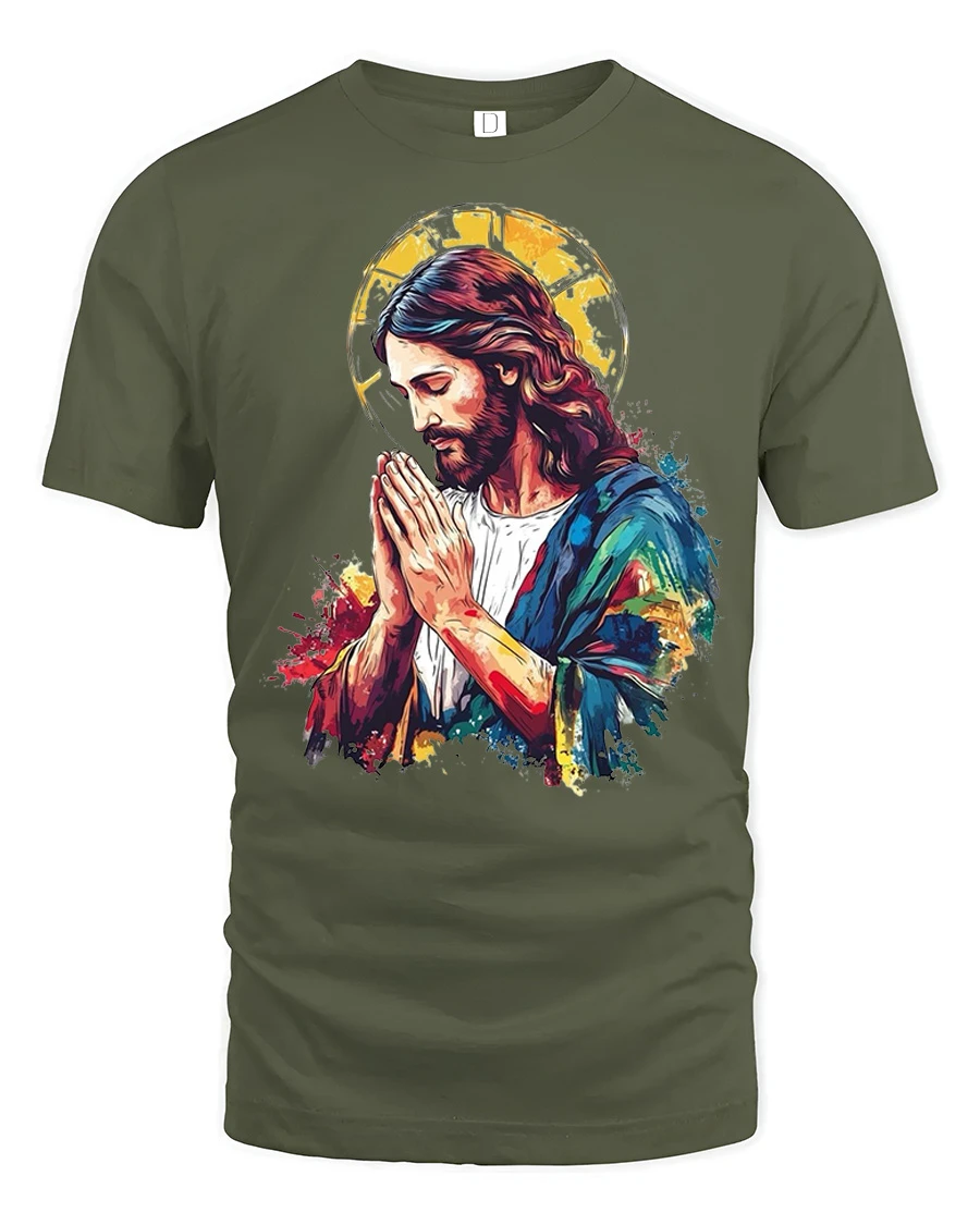 The Praying Jesus Christ Faith Graphic Tee Christian Art Tshirt features a beautiful artistic illustration of Jesus in prayer with a colorful painted style that creates a meaningful and inspiring design.
