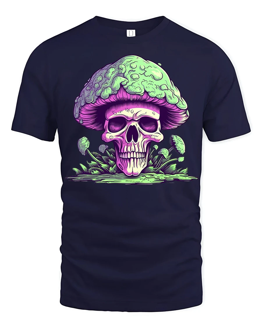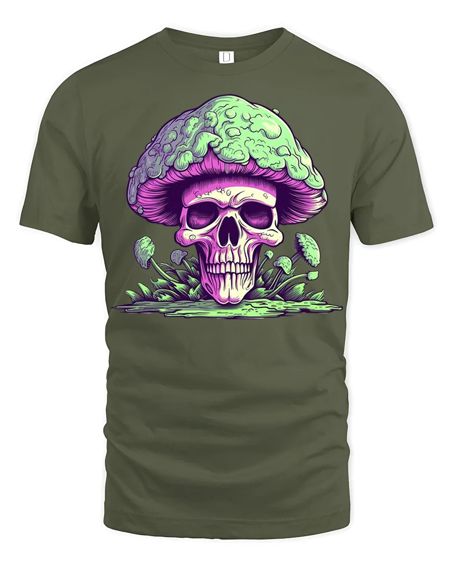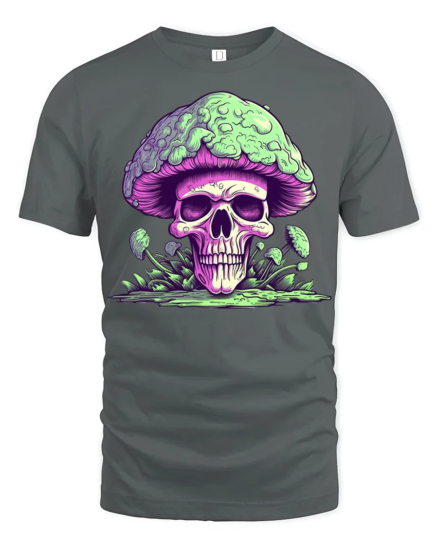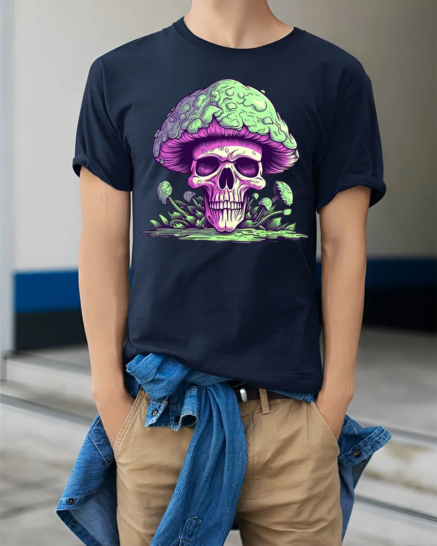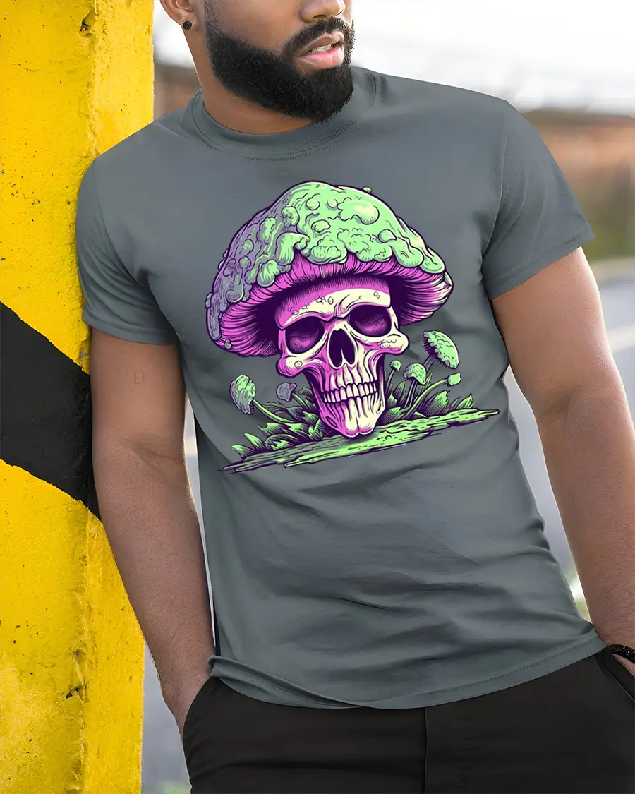 This skull mushroom graphic t shirt design expresses creativity, edgy style, and unique artistic personality.