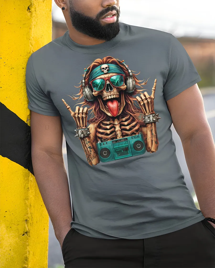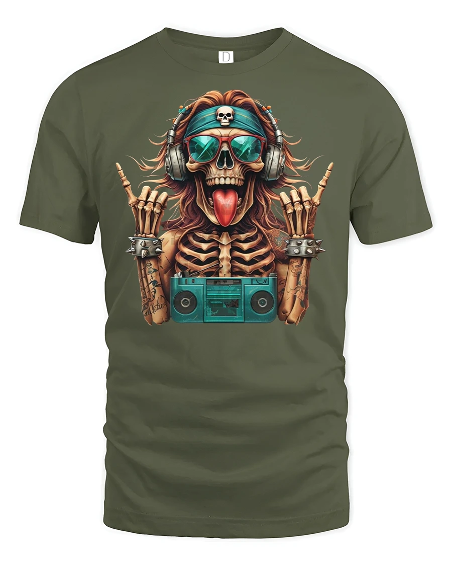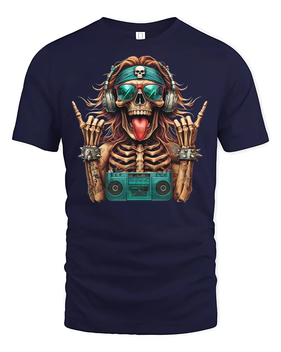 Turn up the volume on your style with this bold and edgy t-shirt featuring a skeleton rocker wearing headphones, sticking out its tongue, and holding a classic boombox. Complete with spiked wristbands, tattoos, and a skull headband, this design is perfect for rock music fans, punk lovers, and anyone with a rebellious spirit.Crafted from soft, breathable fabric, this tee offers all-day comfort while maintaining a vivid, high-quality print wash after wash. Whether you’re at a concert, jamming out with friends, or just showing off your love for music, this shirt makes a statement that’s impossible to ignore.Pair it with jeans, leather, or a denim jacket for the ultimate rock-inspired look. With its mix of attitude, style, and music culture, this skeleton DJ t-shirt is ready to steal the spotlight.