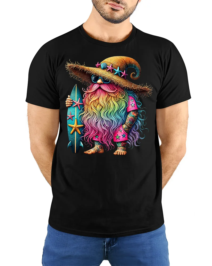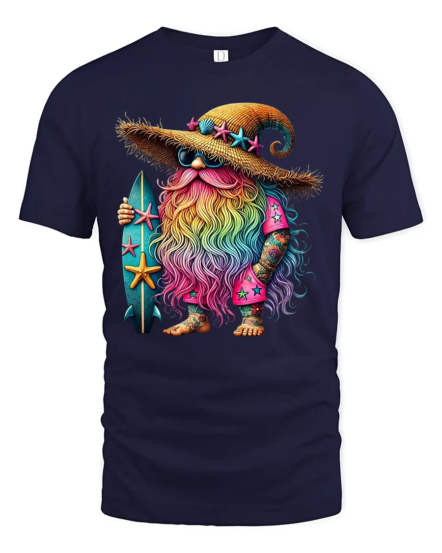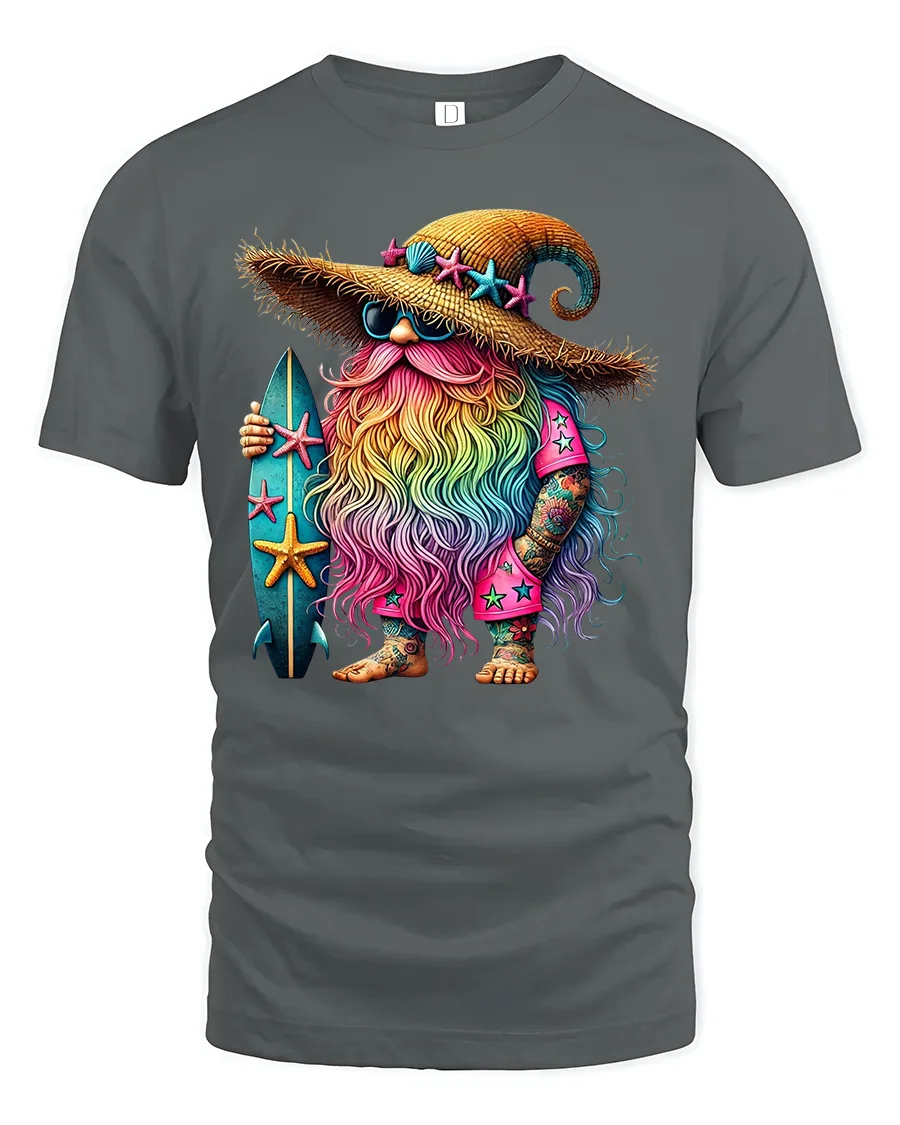 The Rainbow Beard Surfing Gnome Graphic T Shirt Beach Style Art delivers playful creativity with a bold tropical twist.