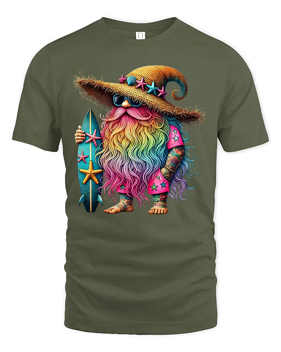This design features a chill gnome rocking a rainbow beard while holding a surfboard with carefree beach energy.