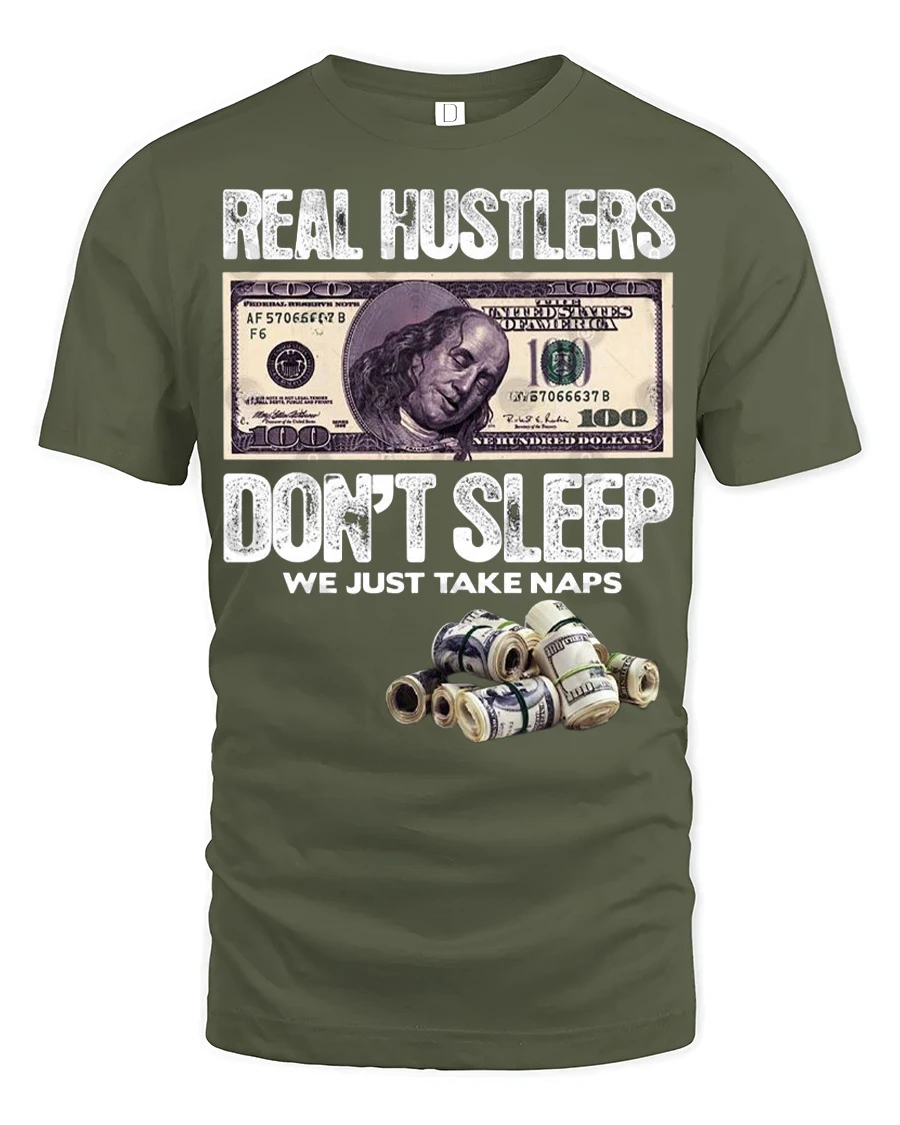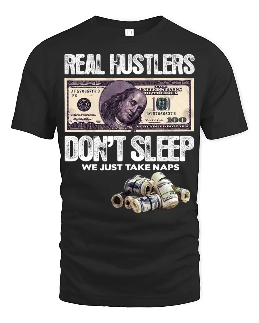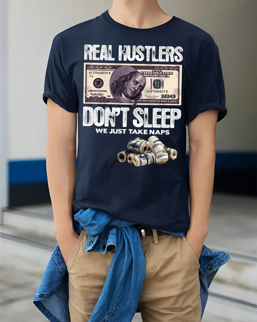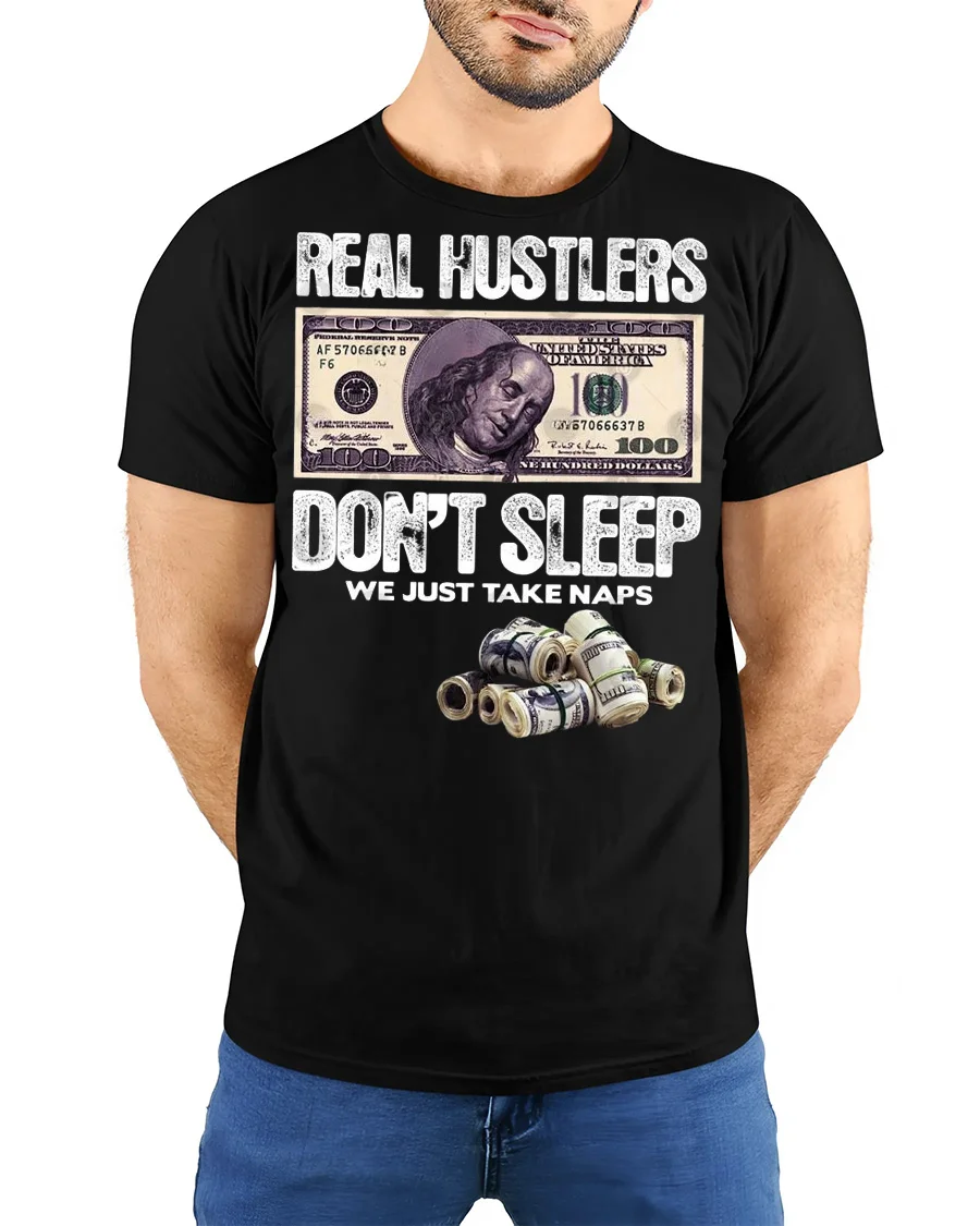 Real Hustlers Dont Sleep We Just Take Naps Money Graphic Tee captures the relentless mindset of people who stay focused on success and ambition.