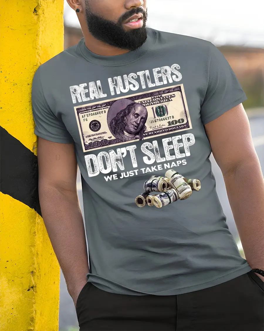 Real Hustlers Dont Sleep We Just Take Naps Money Graphic Tee blends humor with motivational energy to create a memorable and eye catching design.