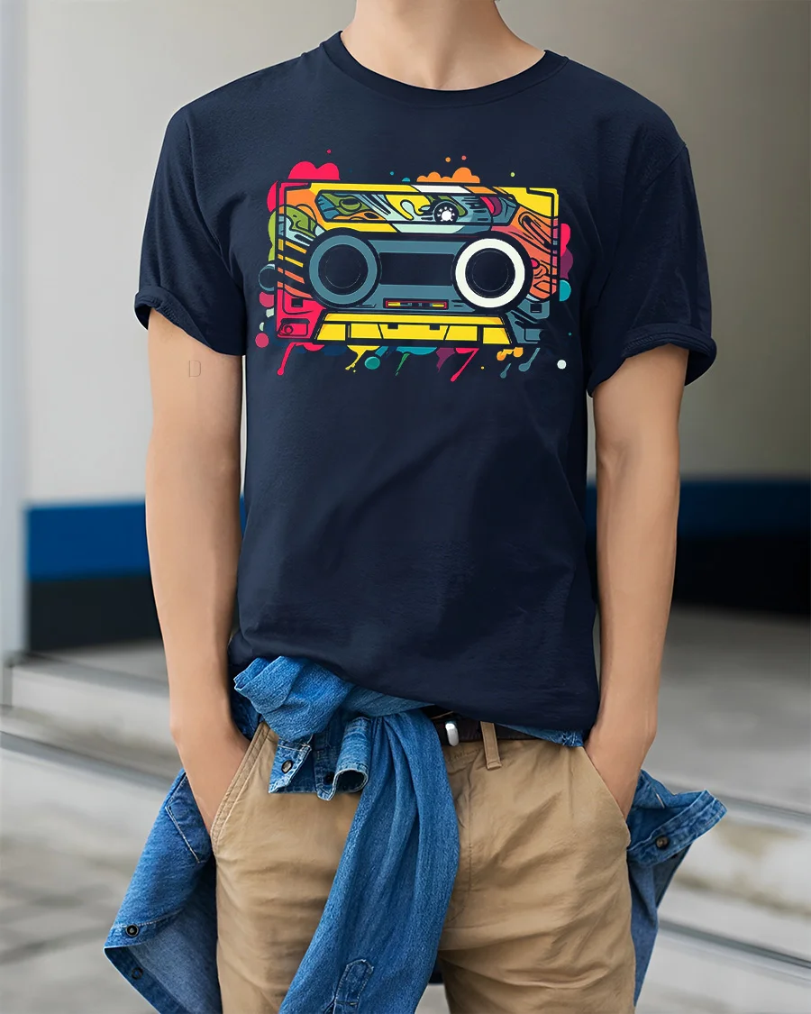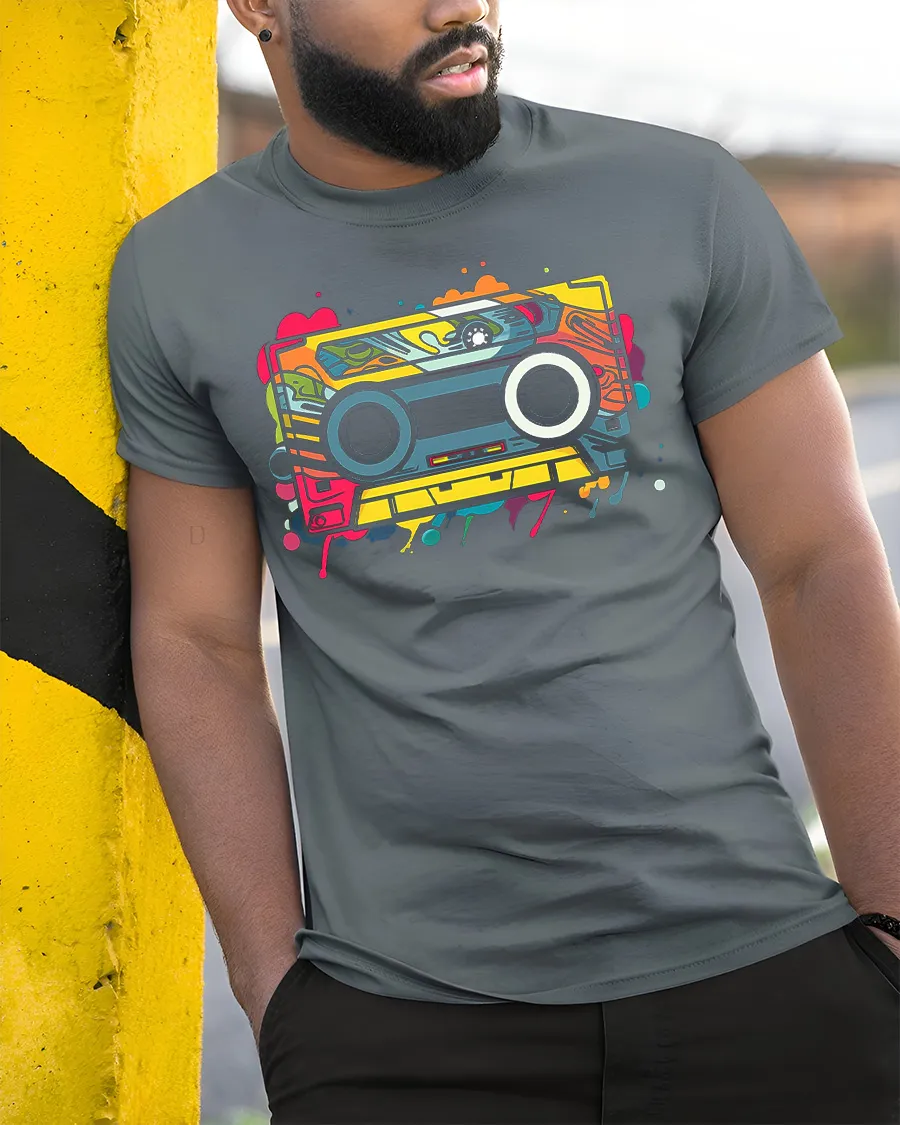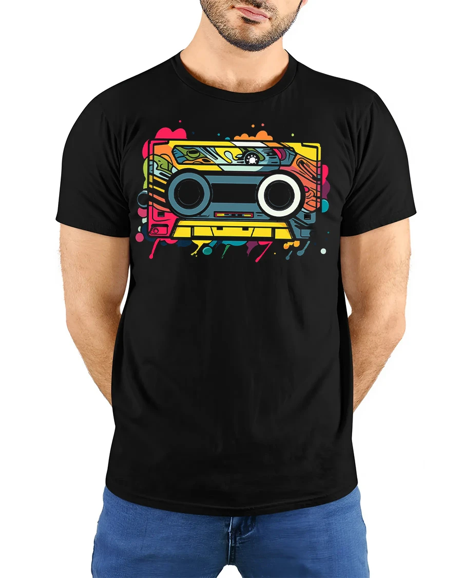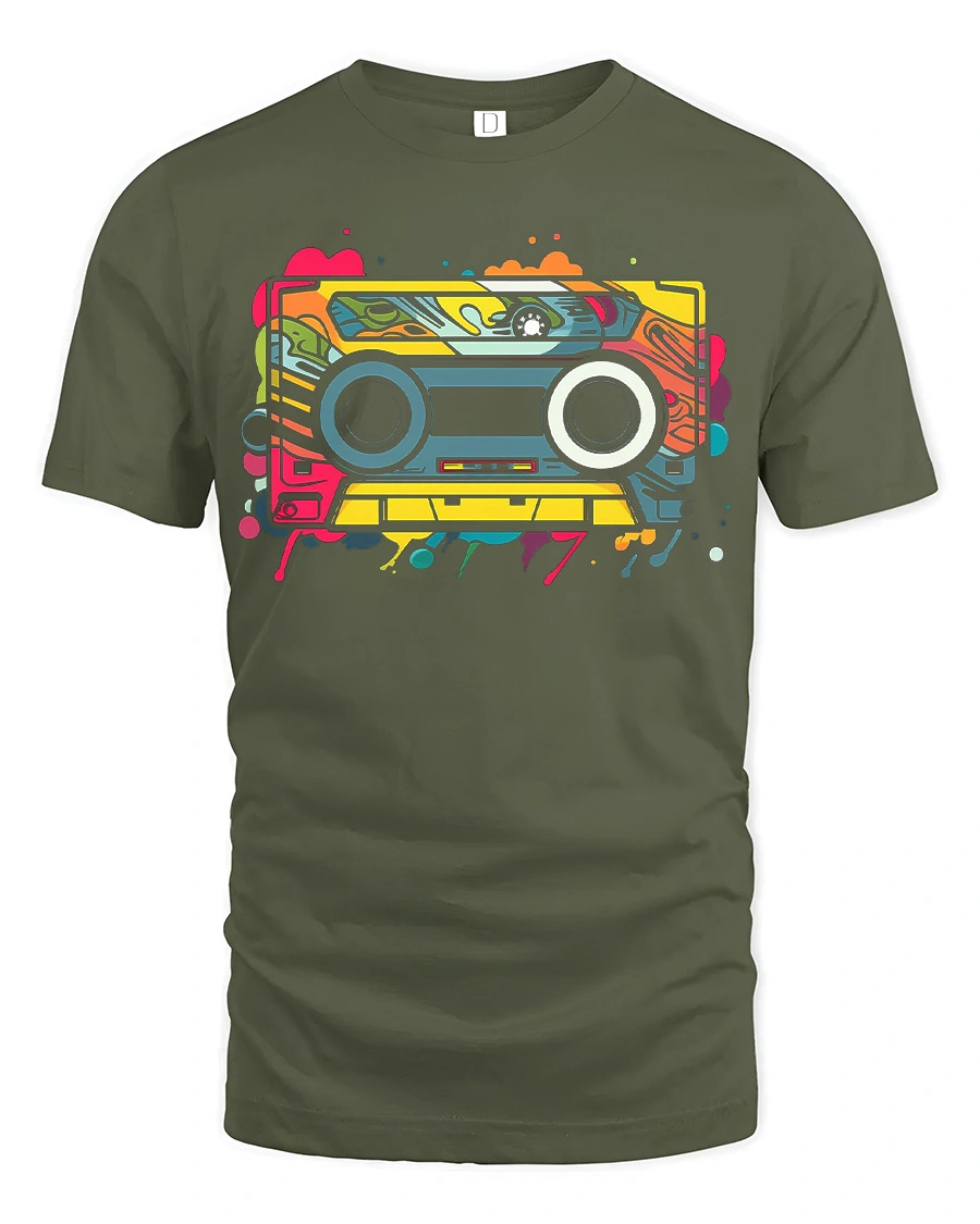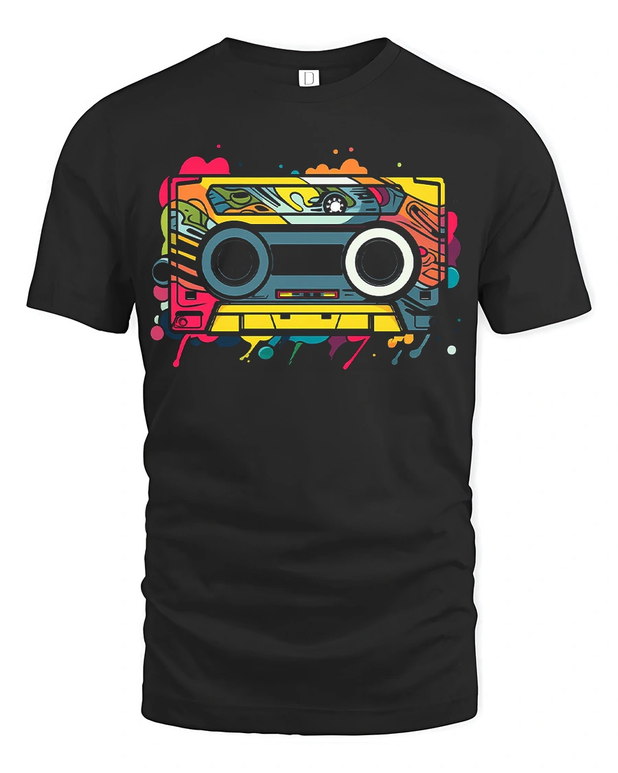 Retro Cassette Tape Colorful Music Graphic T Shirt features a vibrant and nostalgic design inspired by classic cassette tapes and old school music culture.