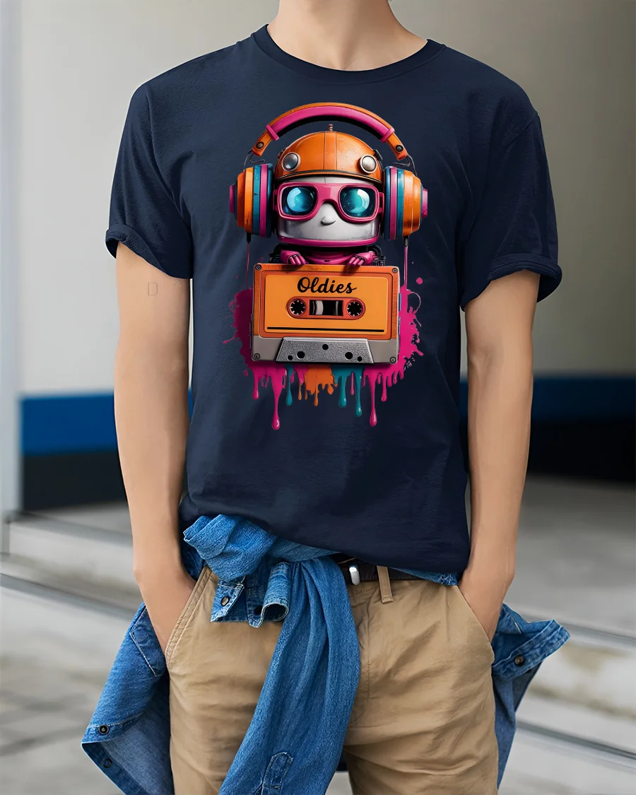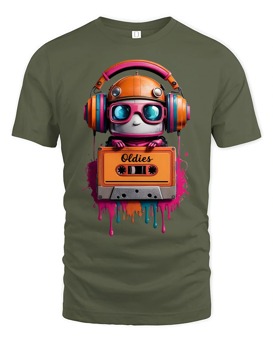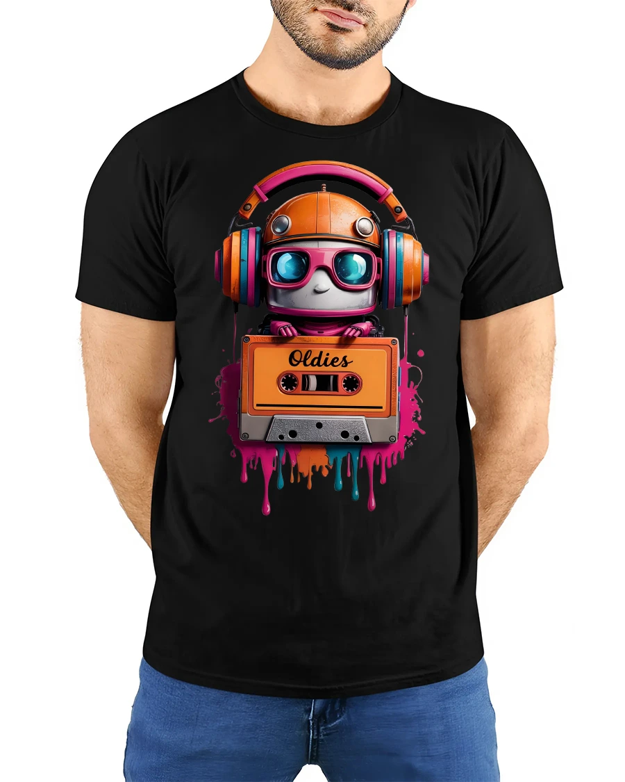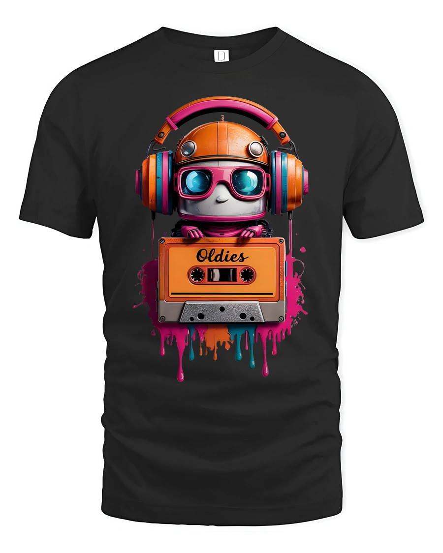 Retro Robot Oldies Cassette Colorful Music Lover Graphic Tee blends nostalgia, creativity, and vibrant artwork into one standout design. Featuring an adorable robot wearing oversized headphones and holding an old-school cassette tape labeled “Oldies,” this tshirt is perfect for anyone who loves vintage music and retro aesthetics. The dripping paint effect and bold neon colors make the design pop with artistic flair.