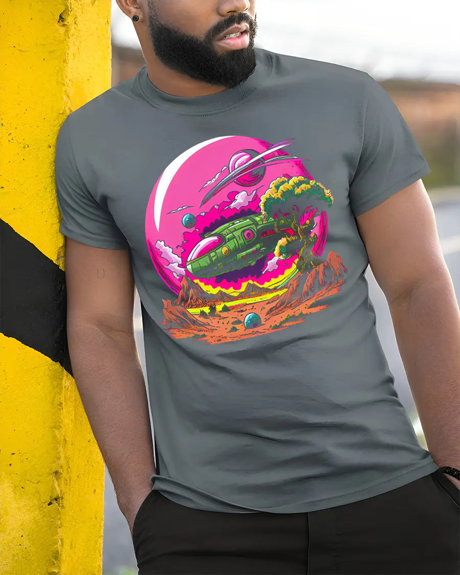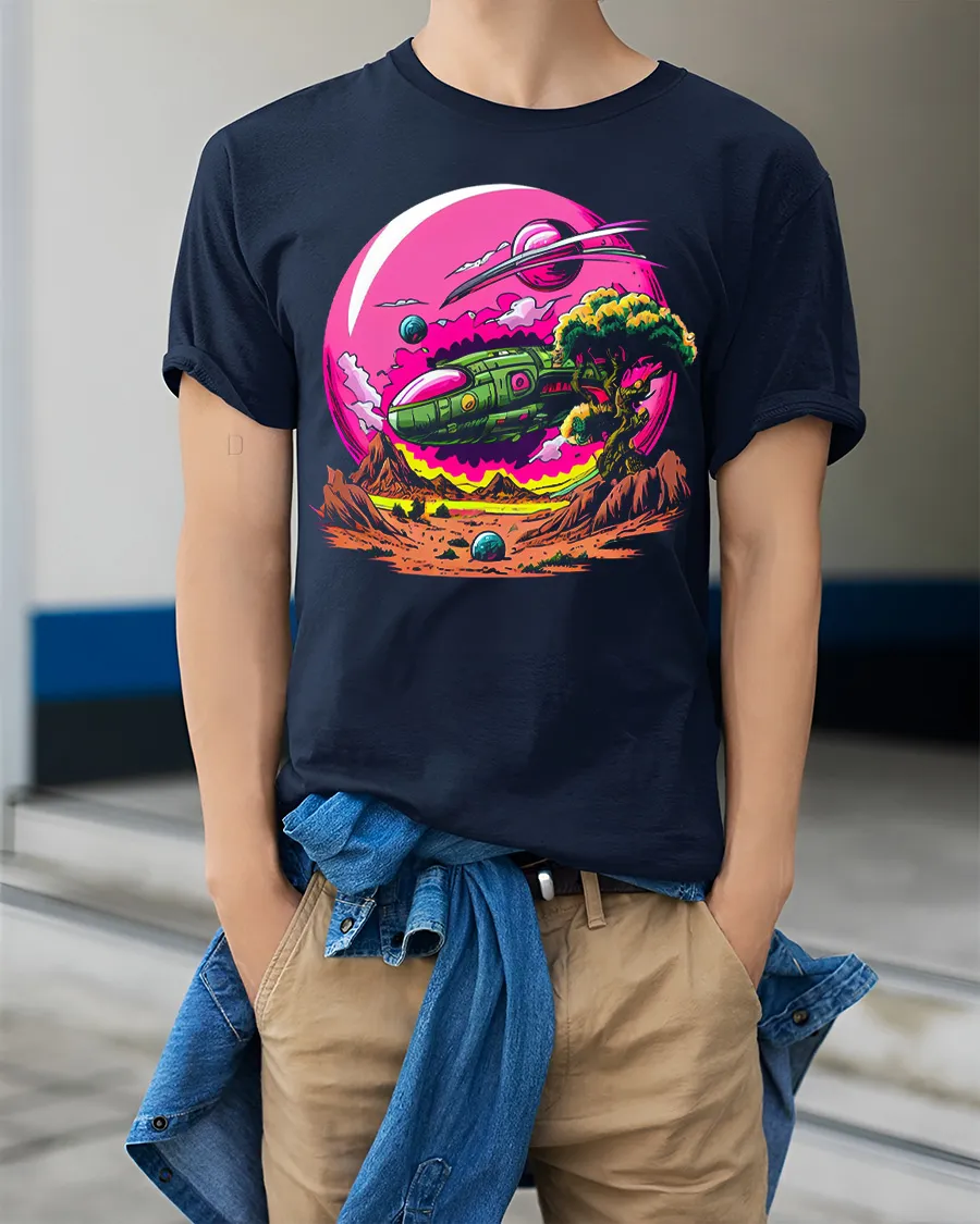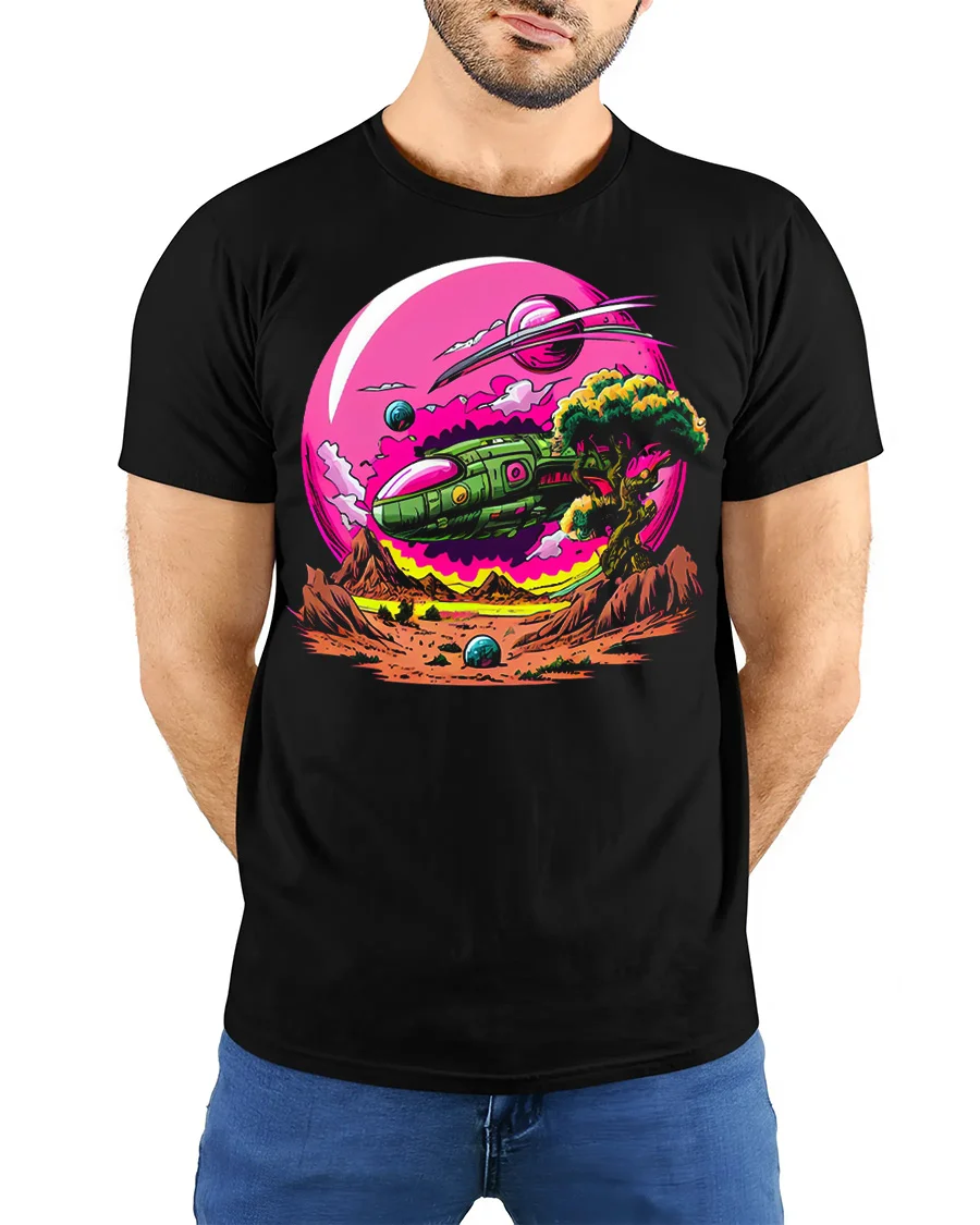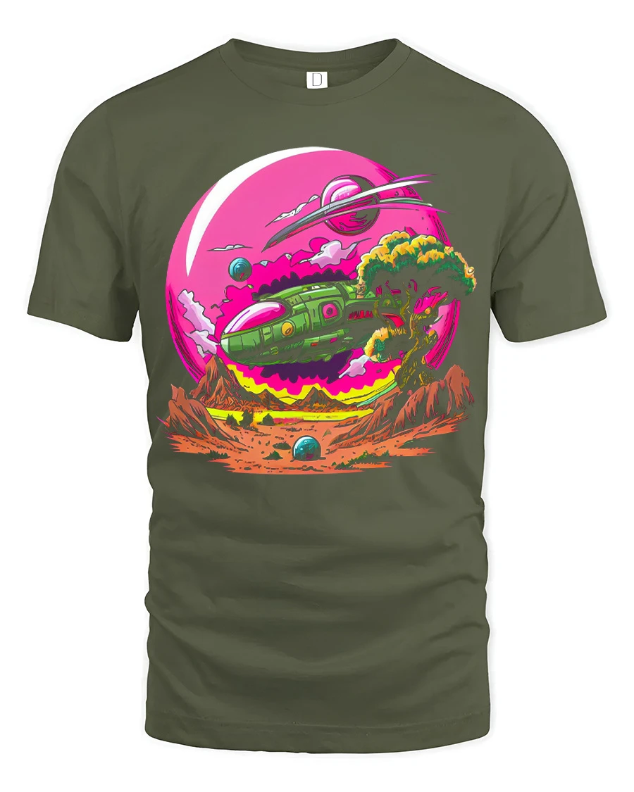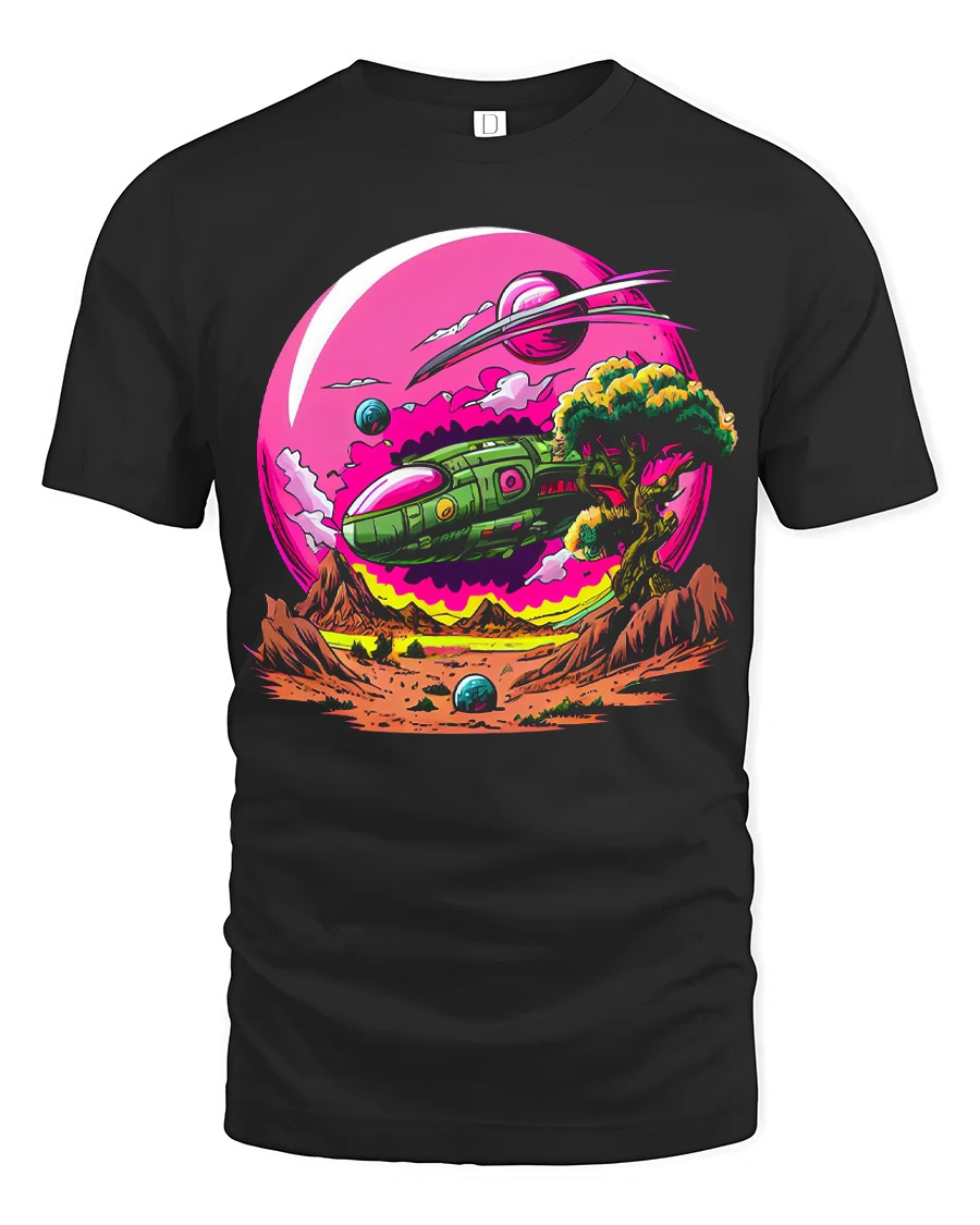 Retro Sci Fi Planet Spaceship Graphic Tshirt Cosmic Style showcases a vibrant alien landscape filled with futuristic elements and bold imagination.