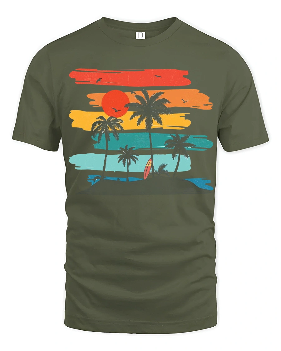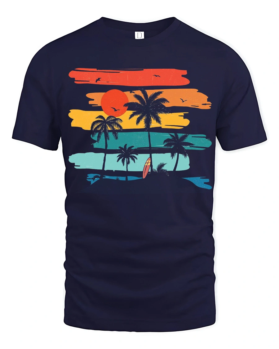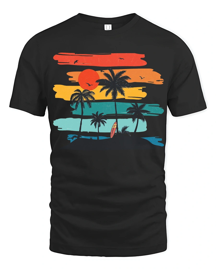 Featuring colorful sunset stripes, palm tree silhouettes, and a tropical island scene, this design captures the feeling of summer days and ocean breezes.