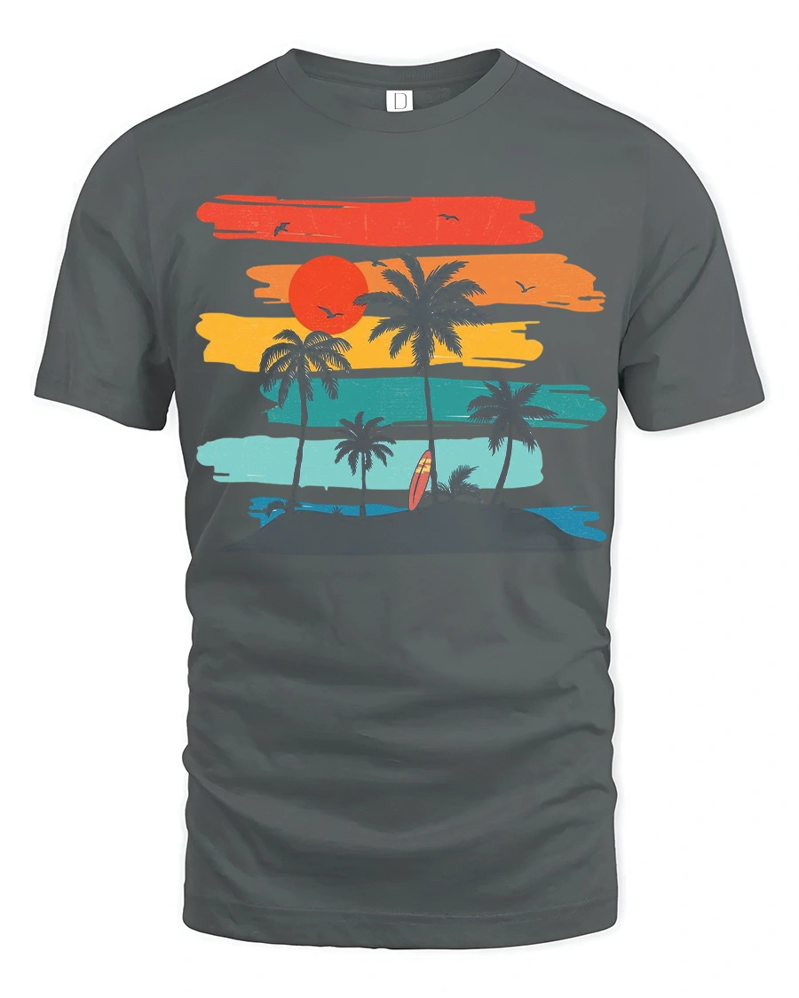 Retro Tropical Sunset Palm Trees Graphic T Shirt Beach Tee brings warm vacation vibes and laid back style to your everyday wardrobe.