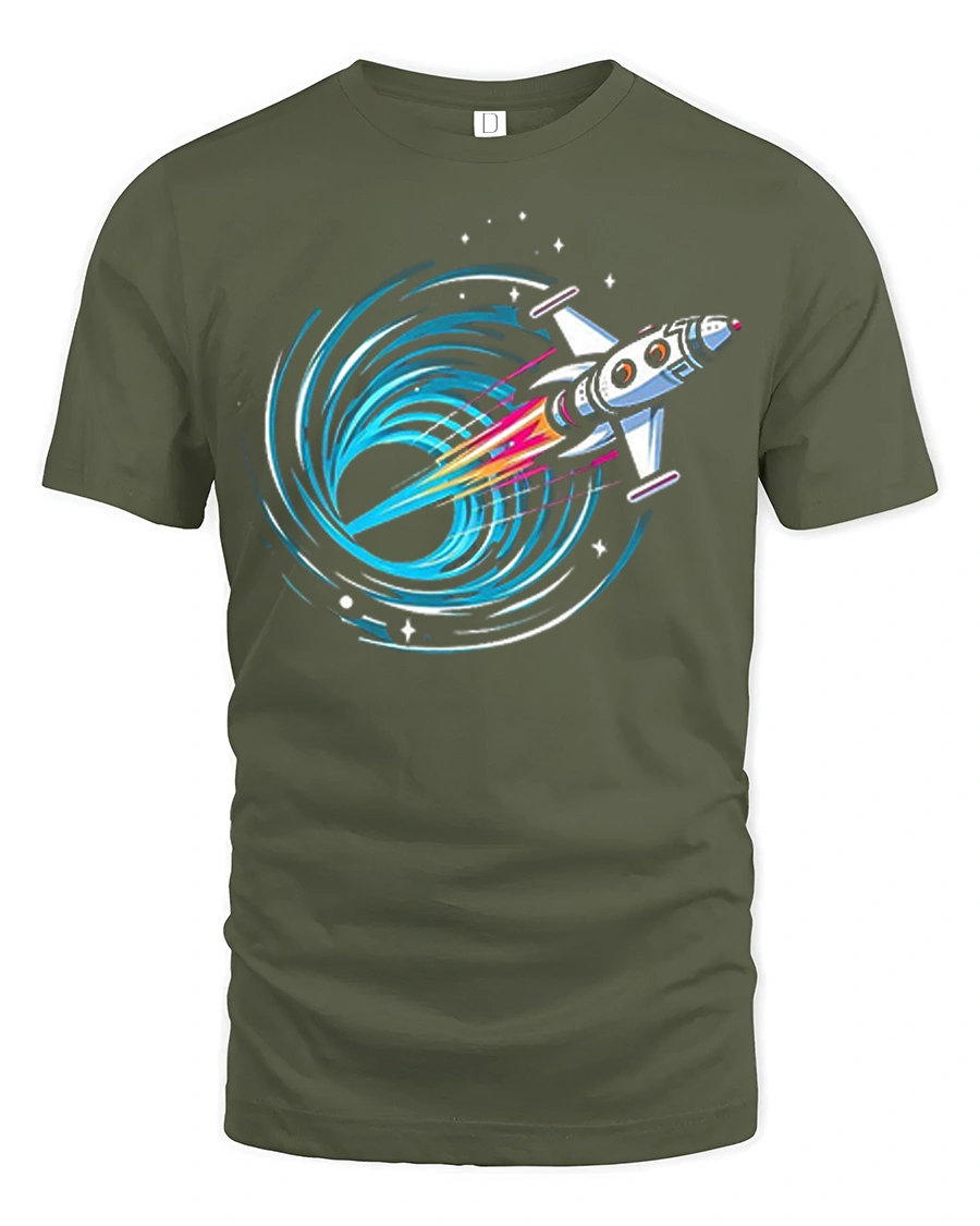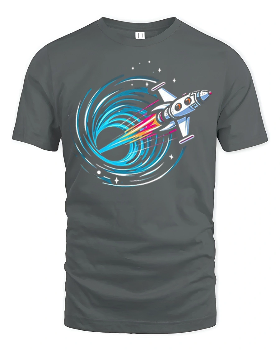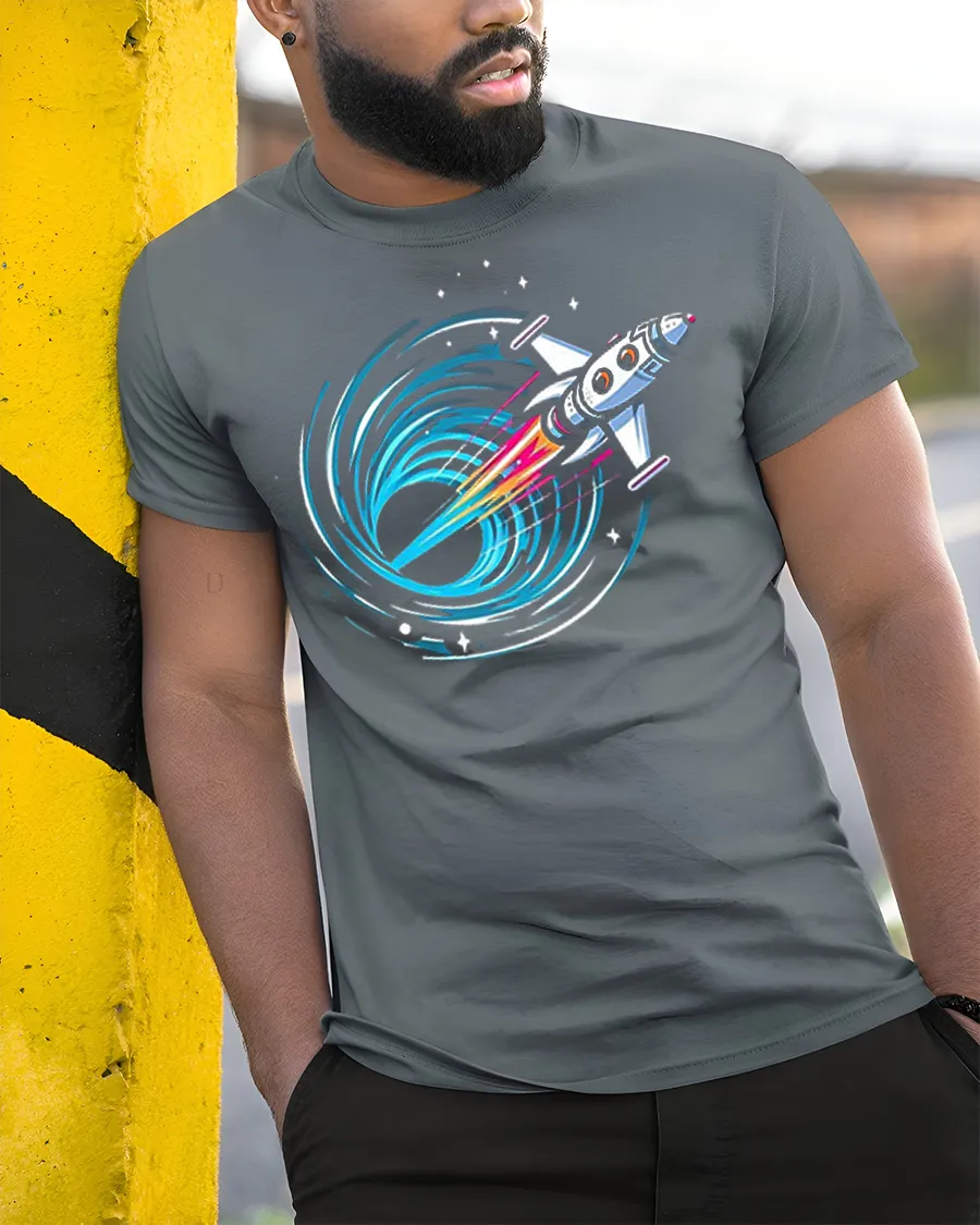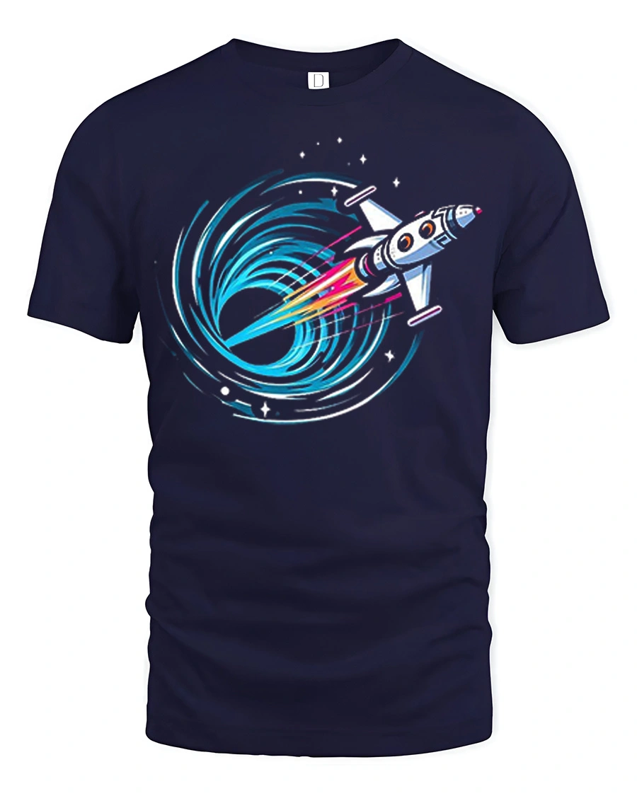 Featuring a bold rocket blasting toward a swirling black hole with bright neon accents, this design captures the excitement of discovery and deep space adventure.