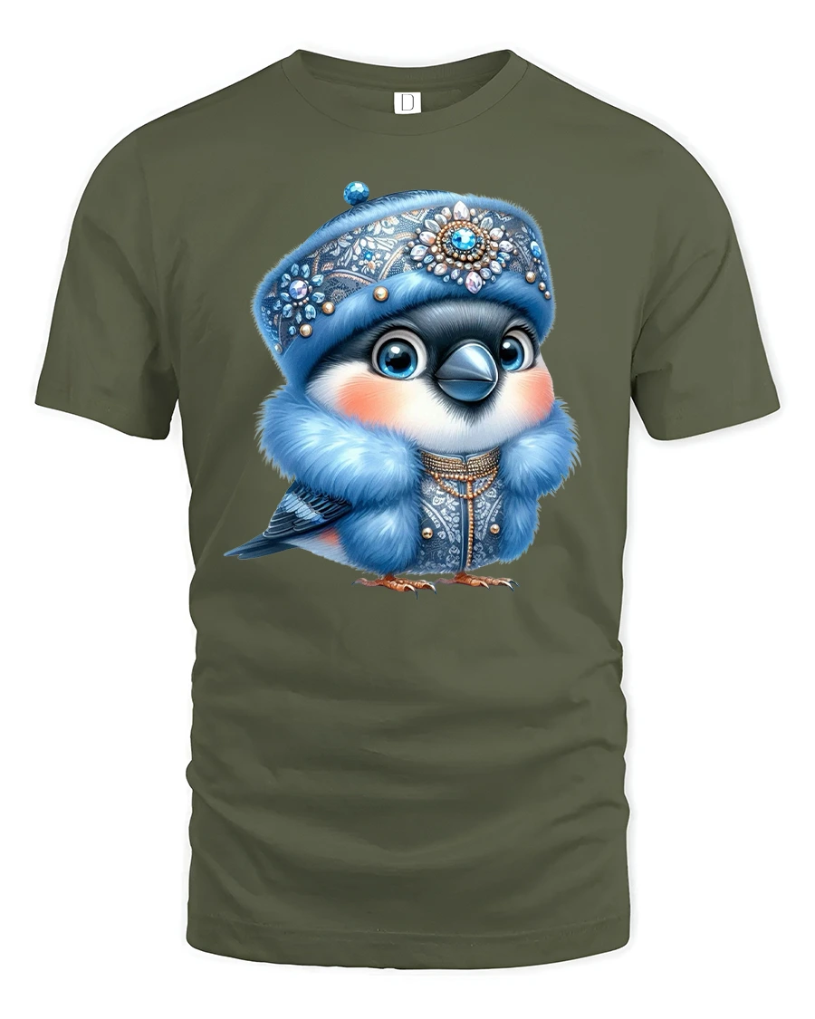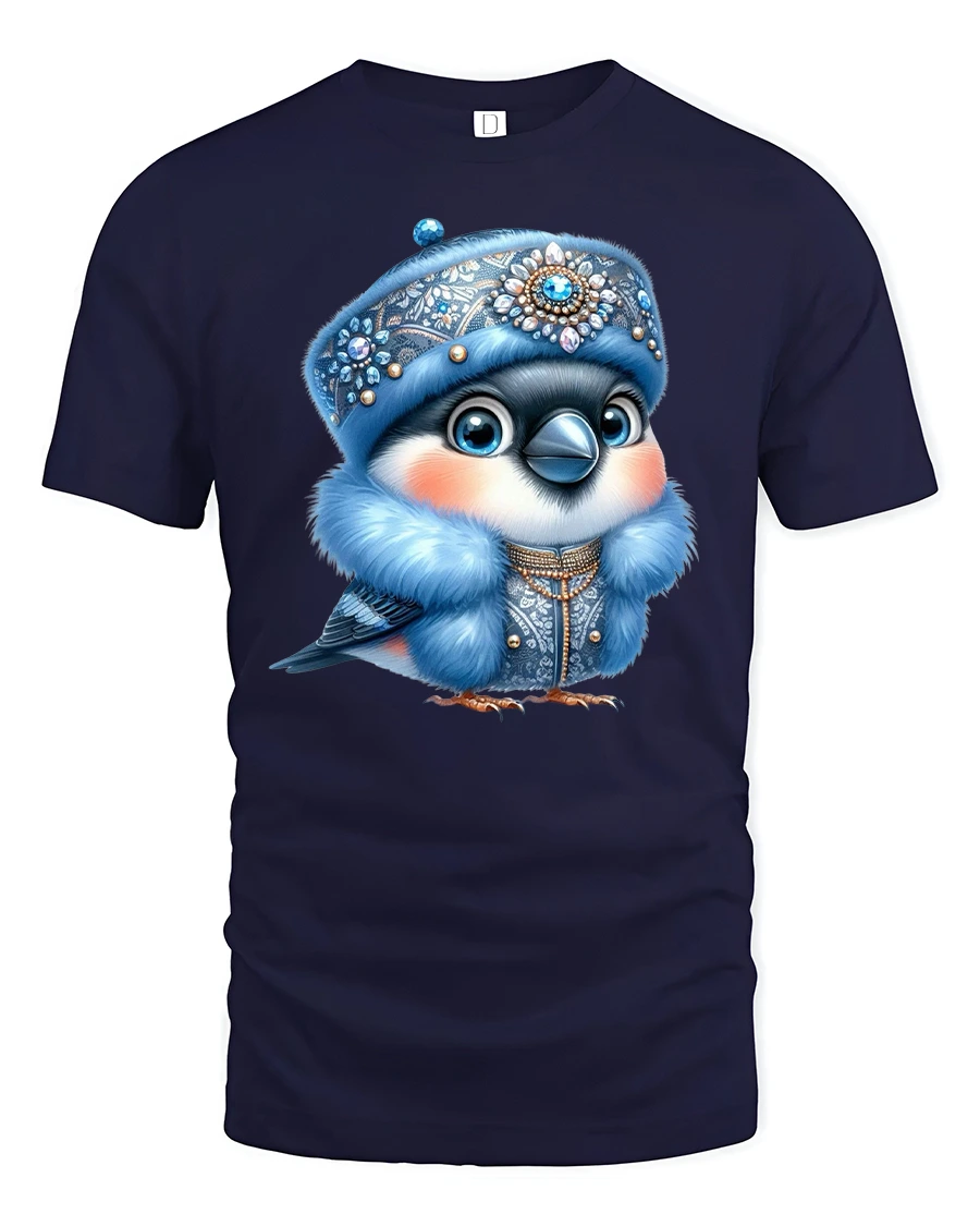 Featuring a beautifully detailed bluebird dressed in royal winter attire, this t-shirt adds a touch of whimsy and elegance to your casual wardrobe.