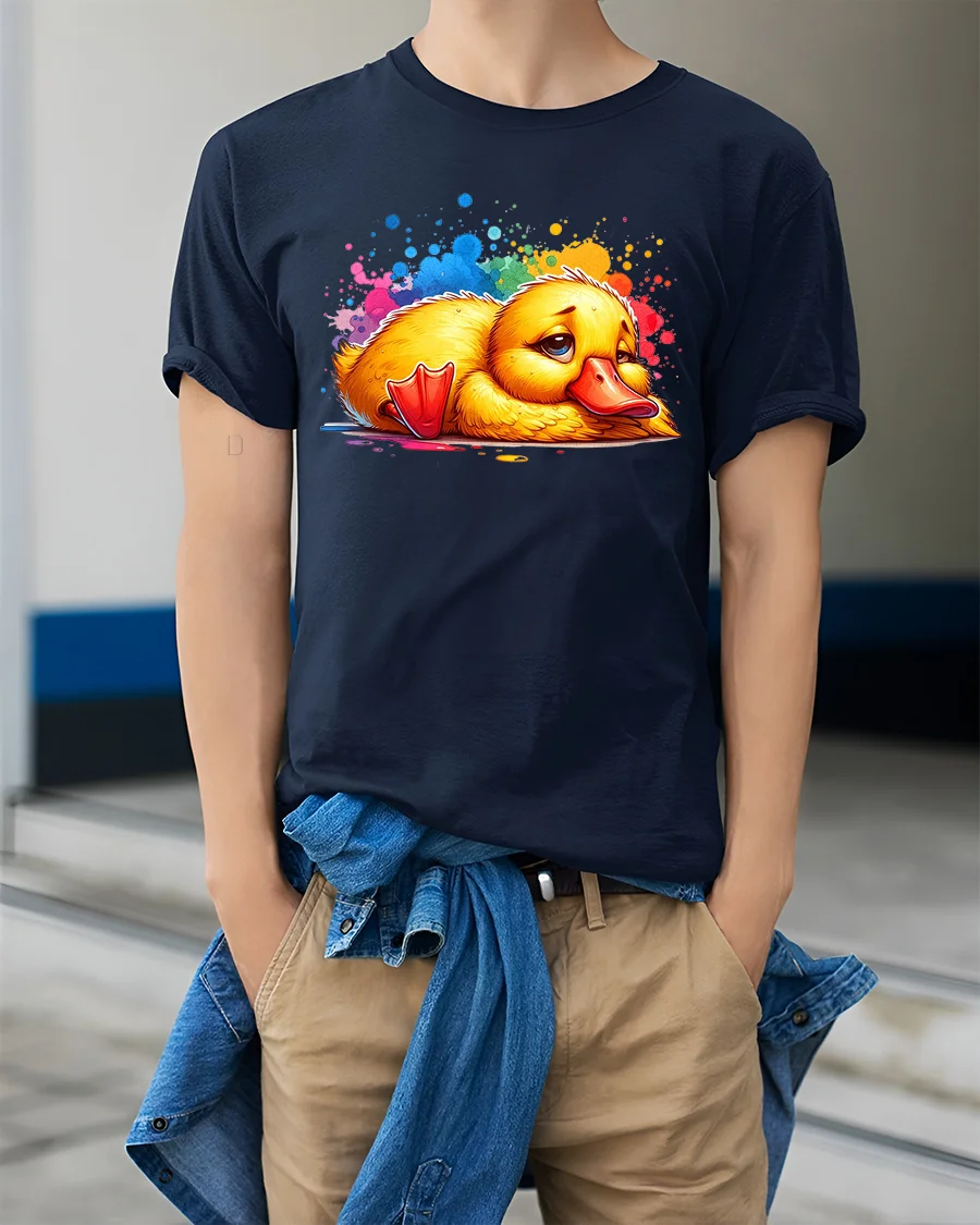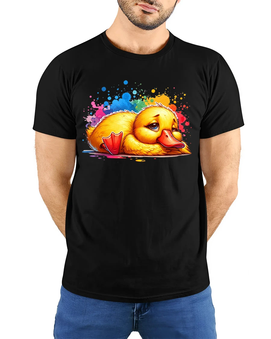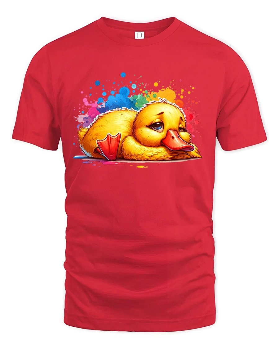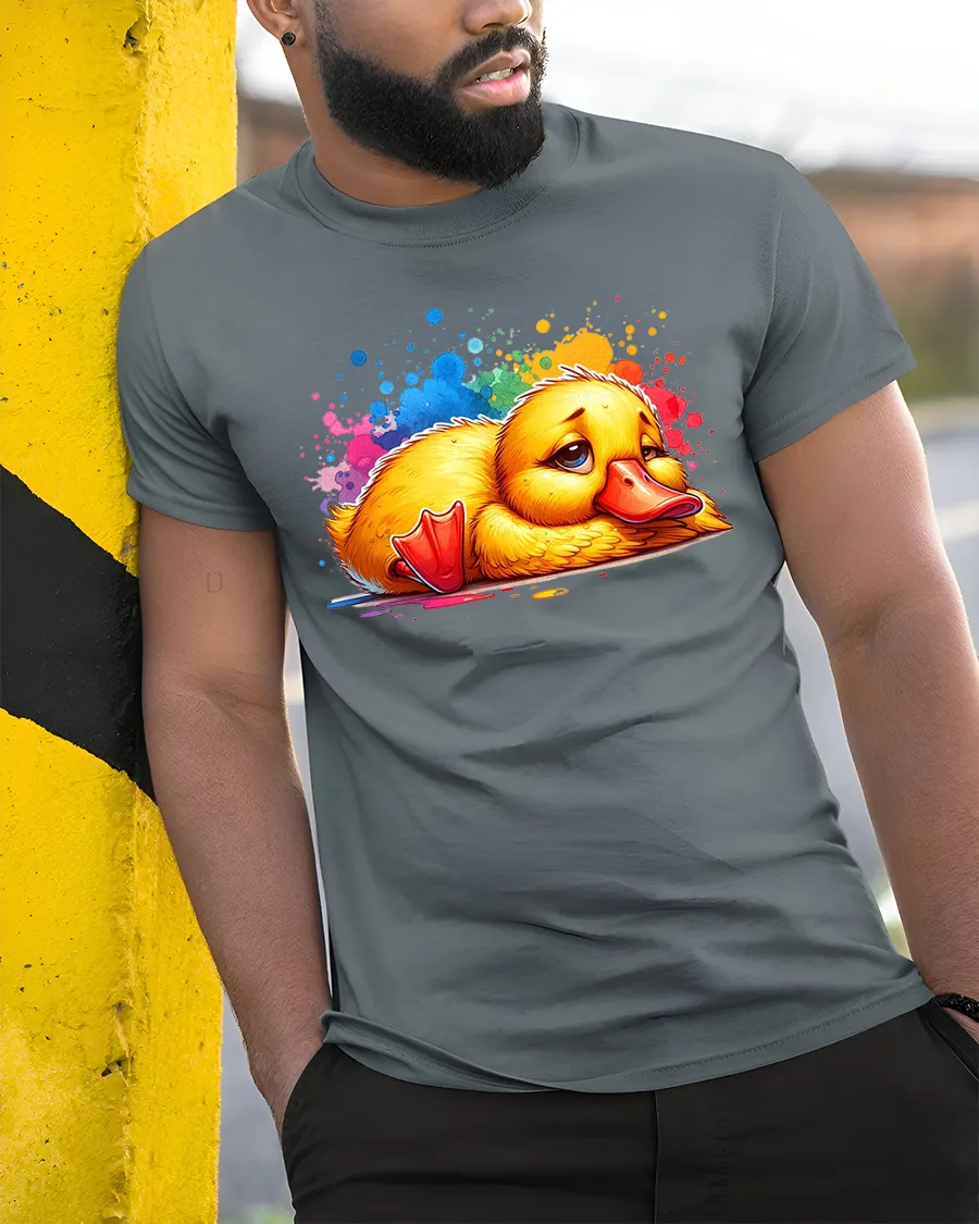 Sad Cute Duck Tshirt With Colorful Paint Splash Cartoon Art brings a unique mix of emotion charm and playful creativity into one eye catching design.