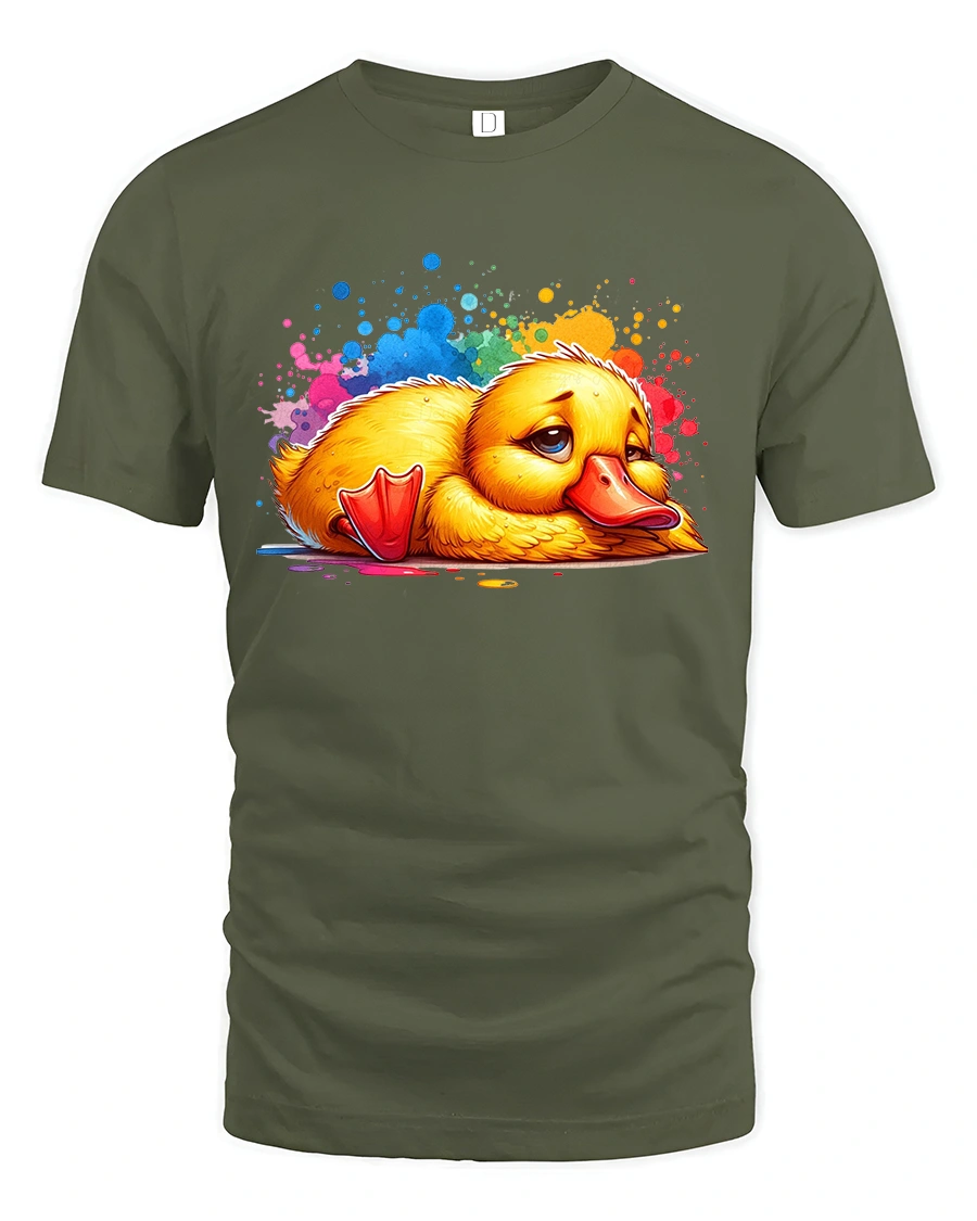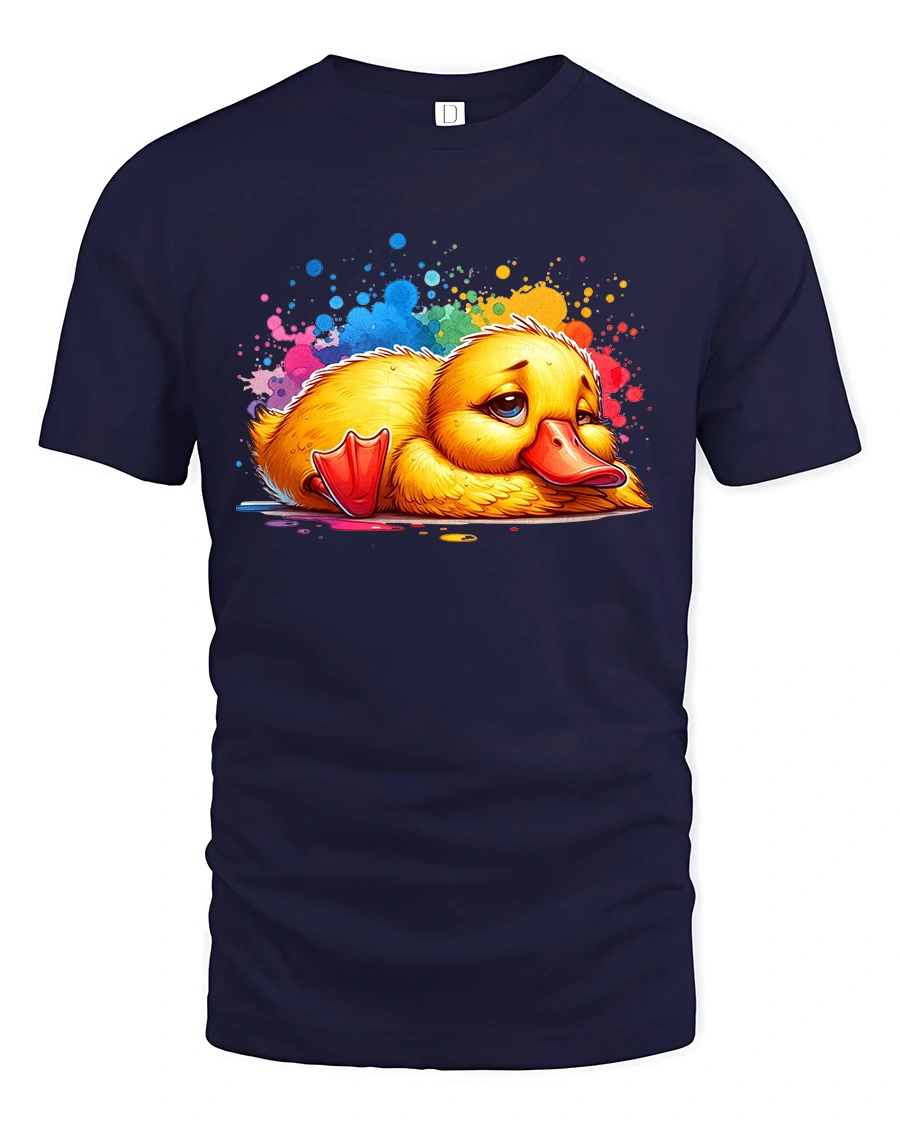 Sad Cute Duck Tshirt With Colorful Paint Splash Cartoon Art is ideal for anyone who enjoys cute animal art with an emotional twist.