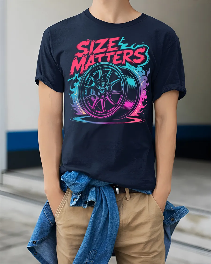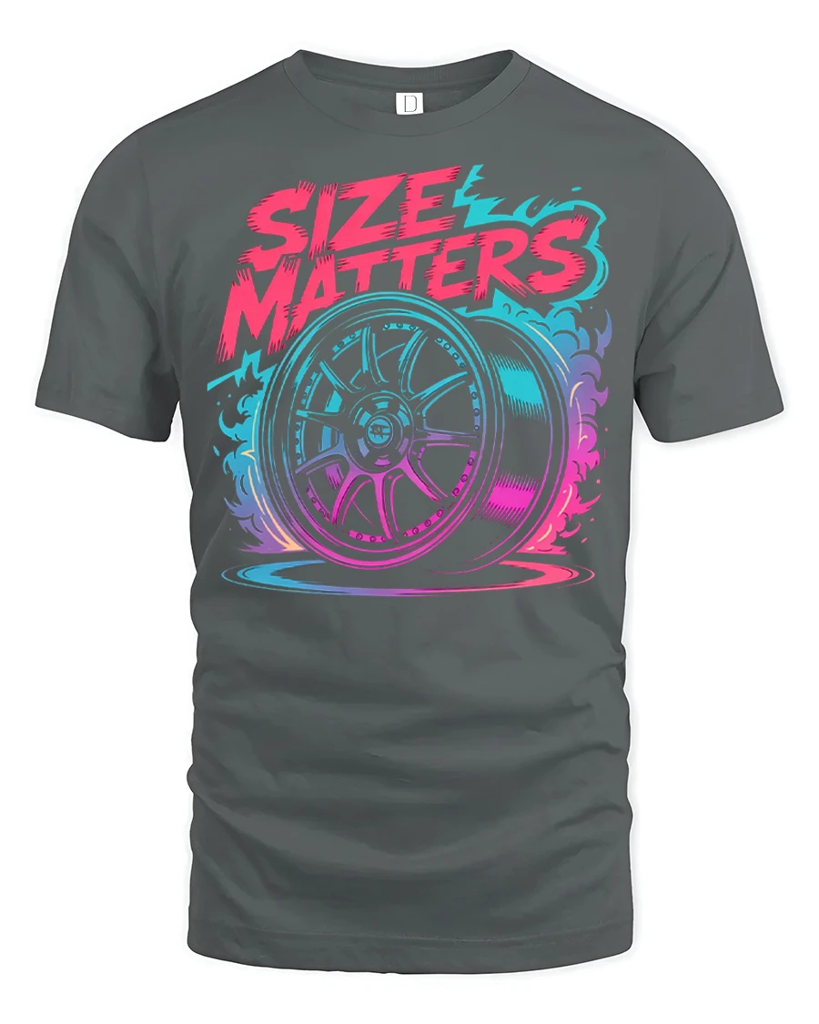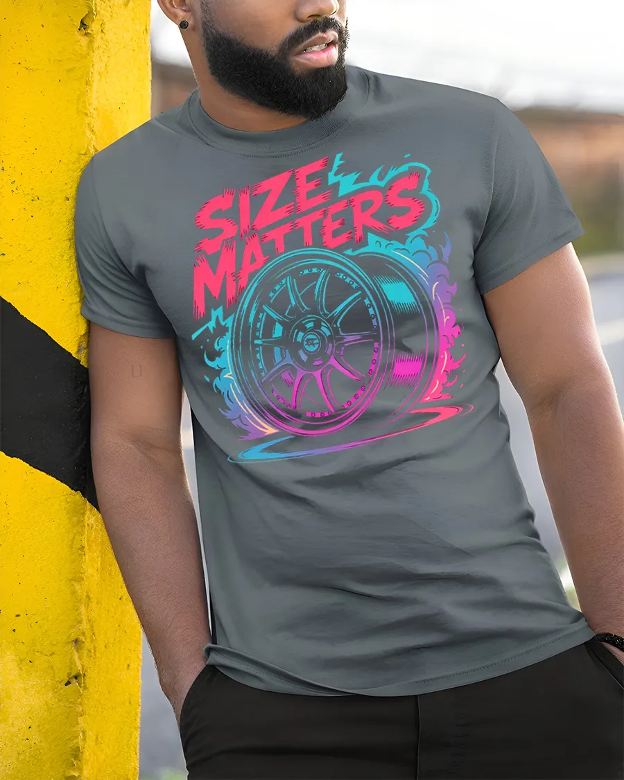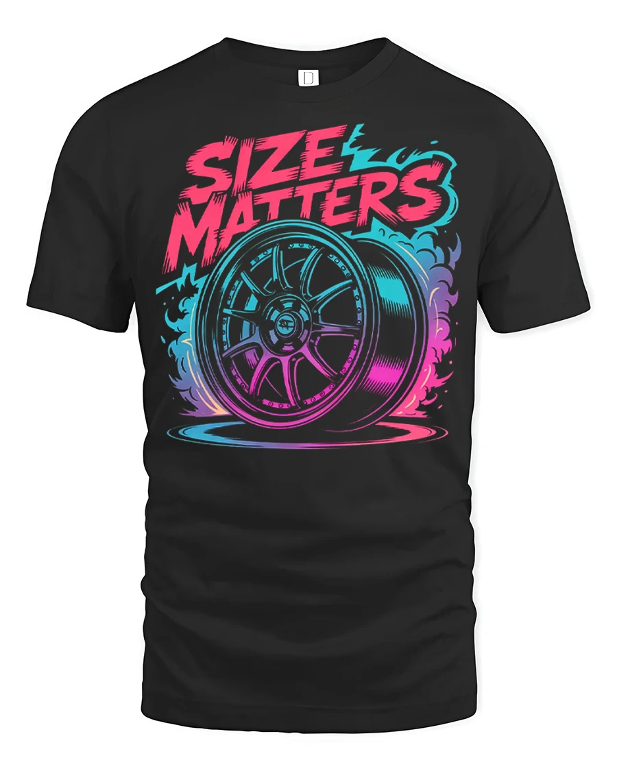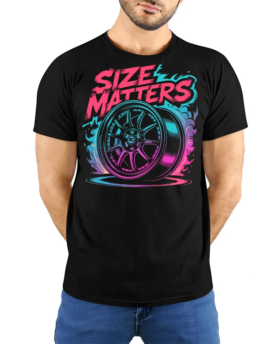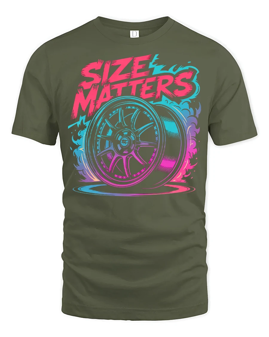 Size Matters Funny Tire Graphic T Shirt Bold Car Enthusiast Tee delivers a striking design that combines humor and automotive passion with a vibrant neon wheel graphic.