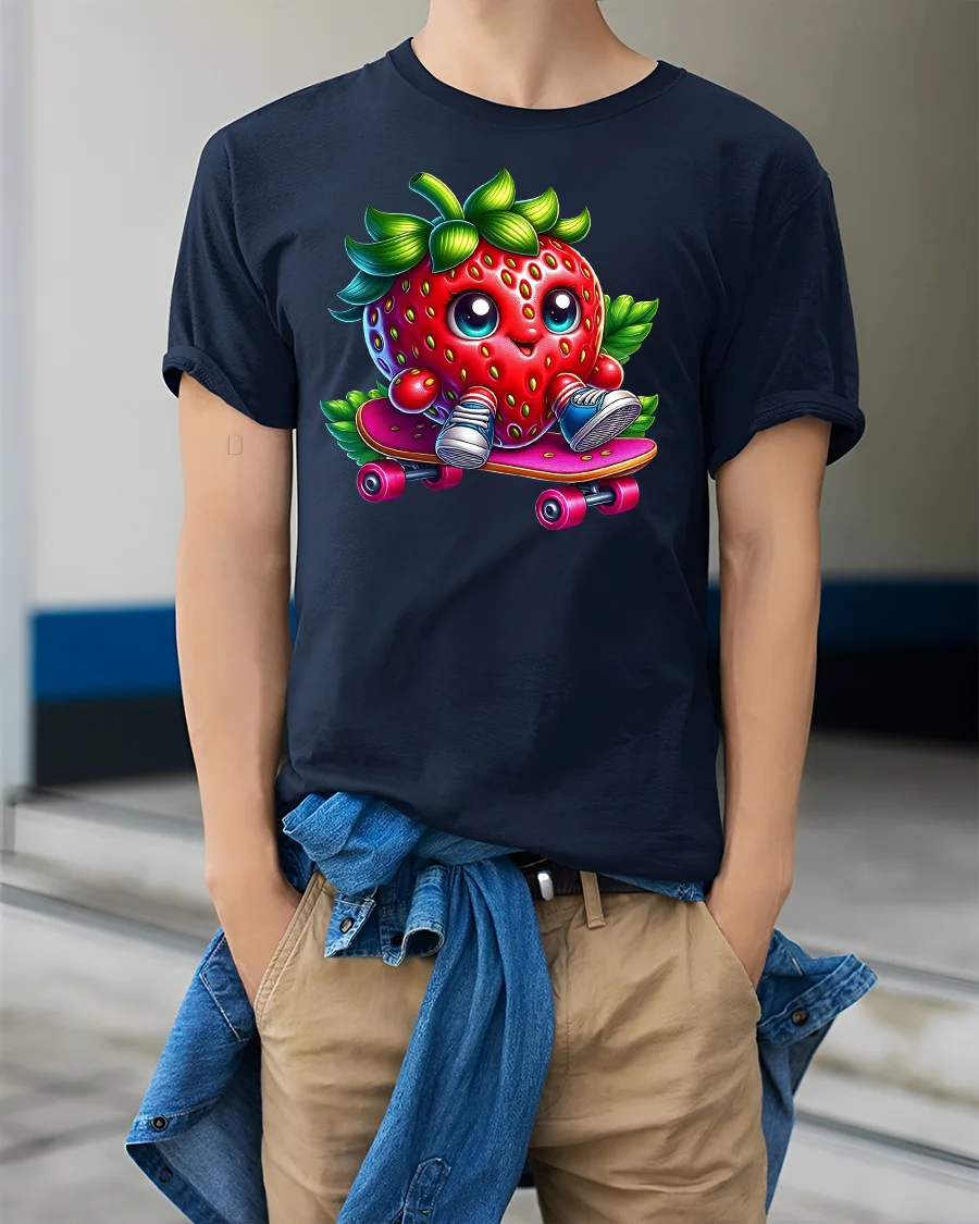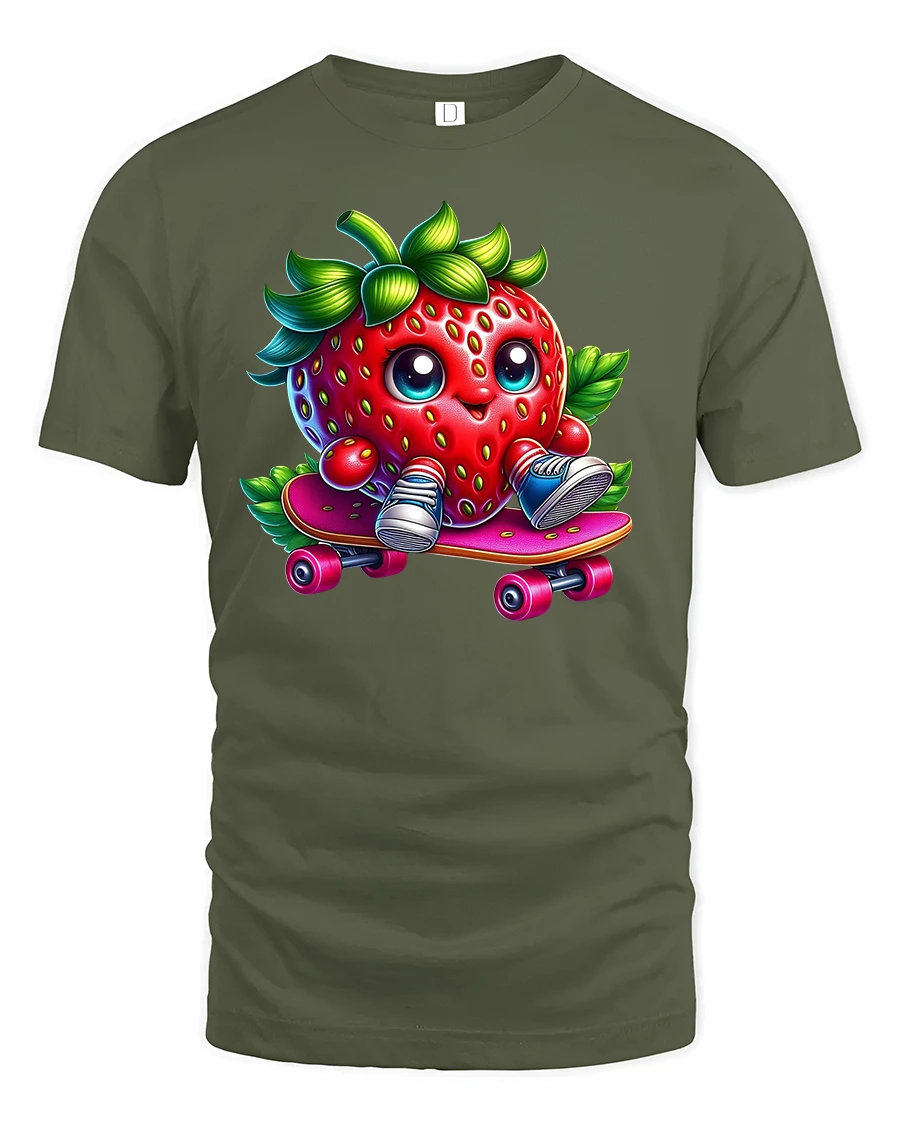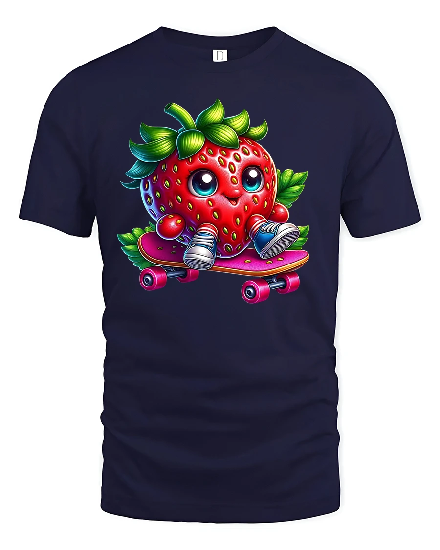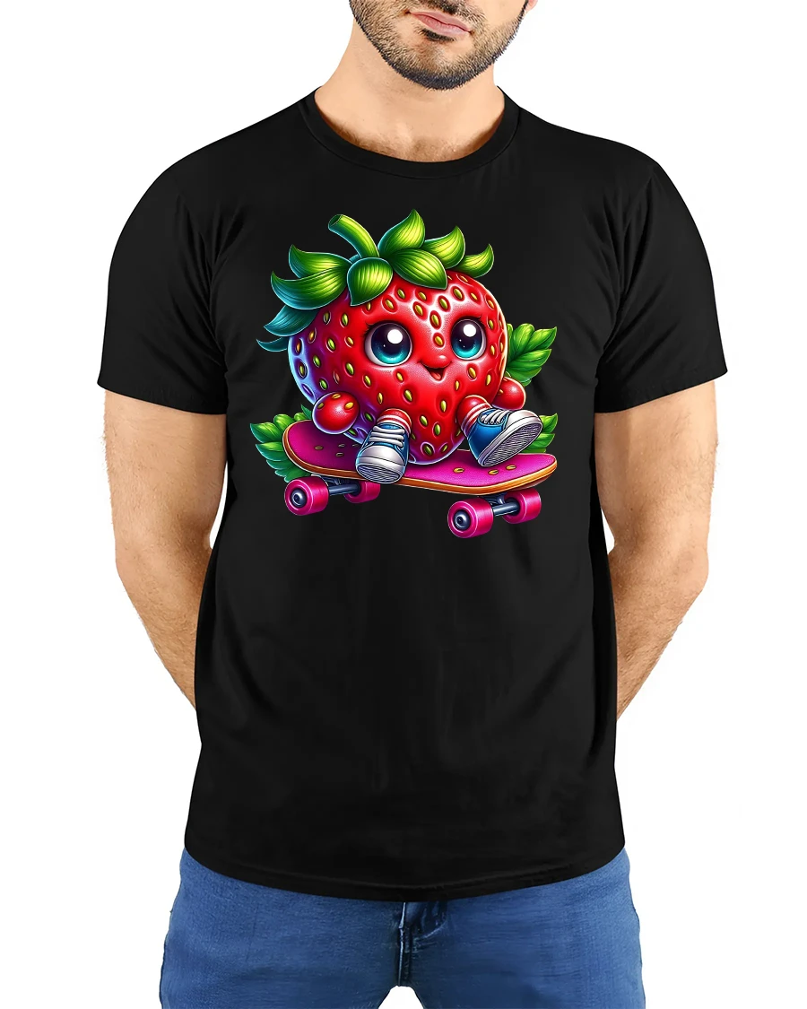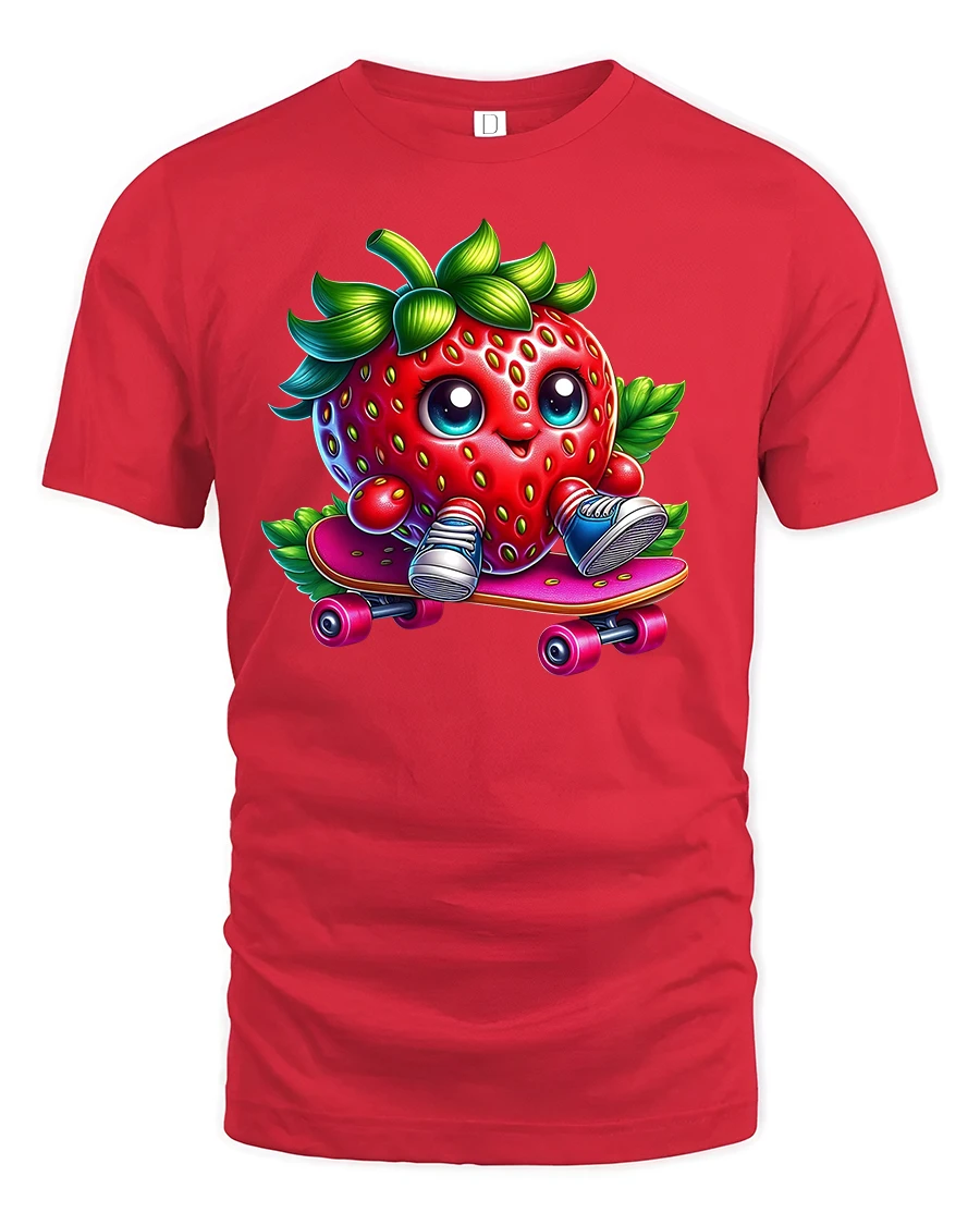 Featuring a cute strawberry character riding a skateboard with bright, vivid details, this tee is perfect for those who love quirky, cheerful designs that make everyone smile.