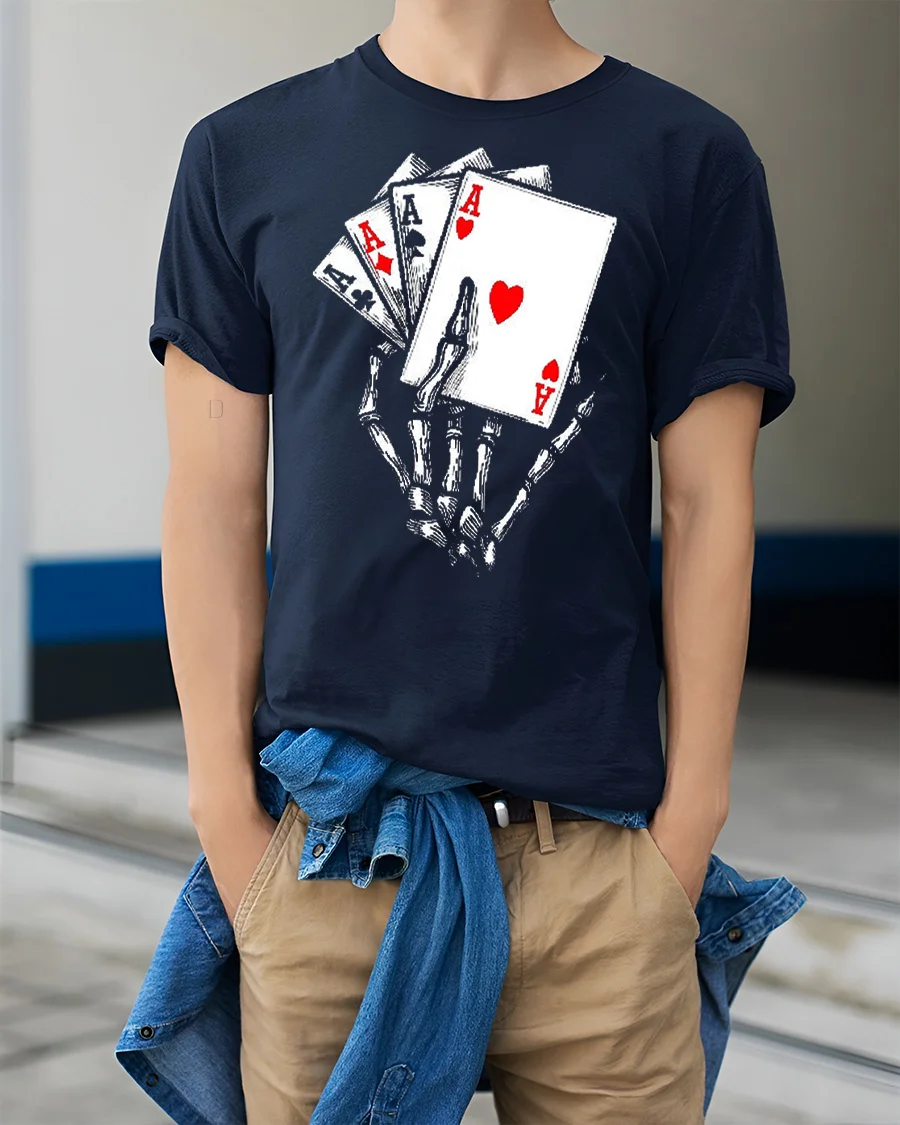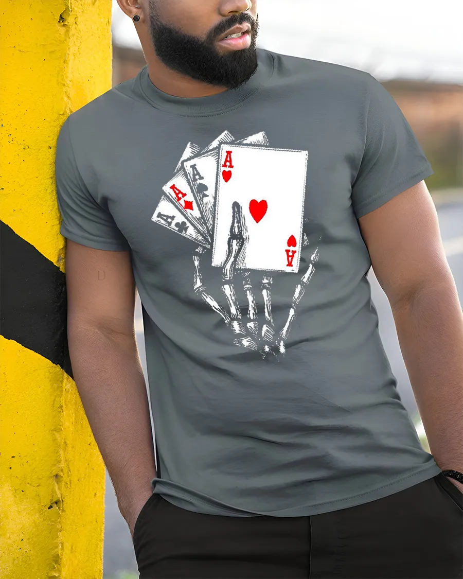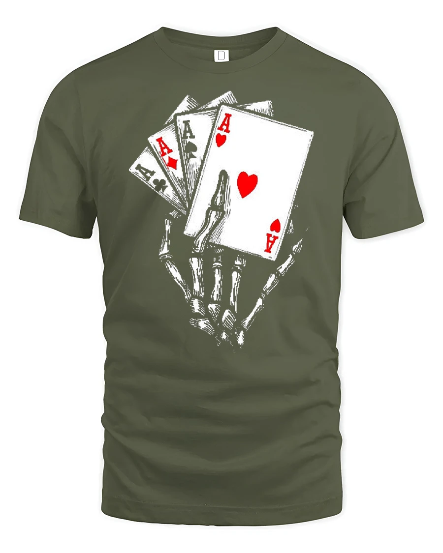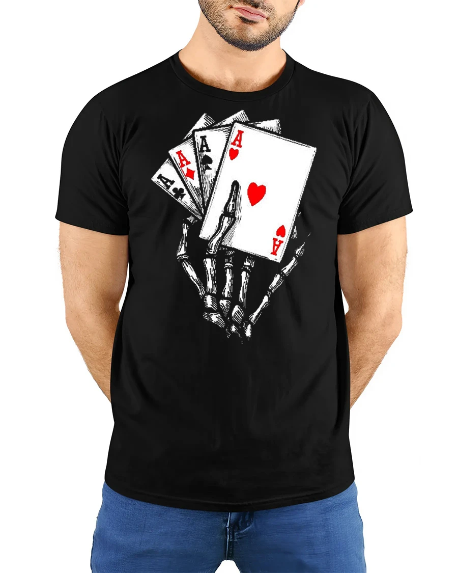 Skeleton Hand Holding Aces Poker Graphic T Shirt Cool Tee delivers a bold and edgy look inspired by classic card games and dark art style.