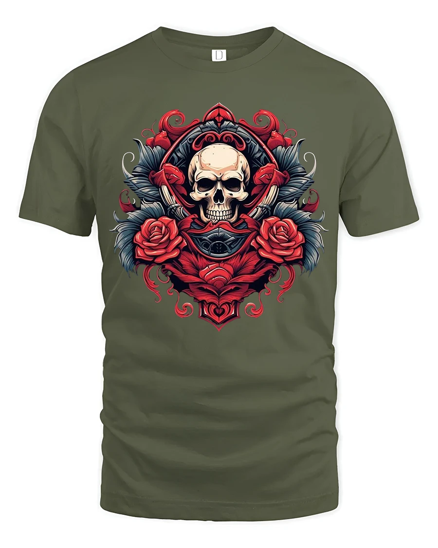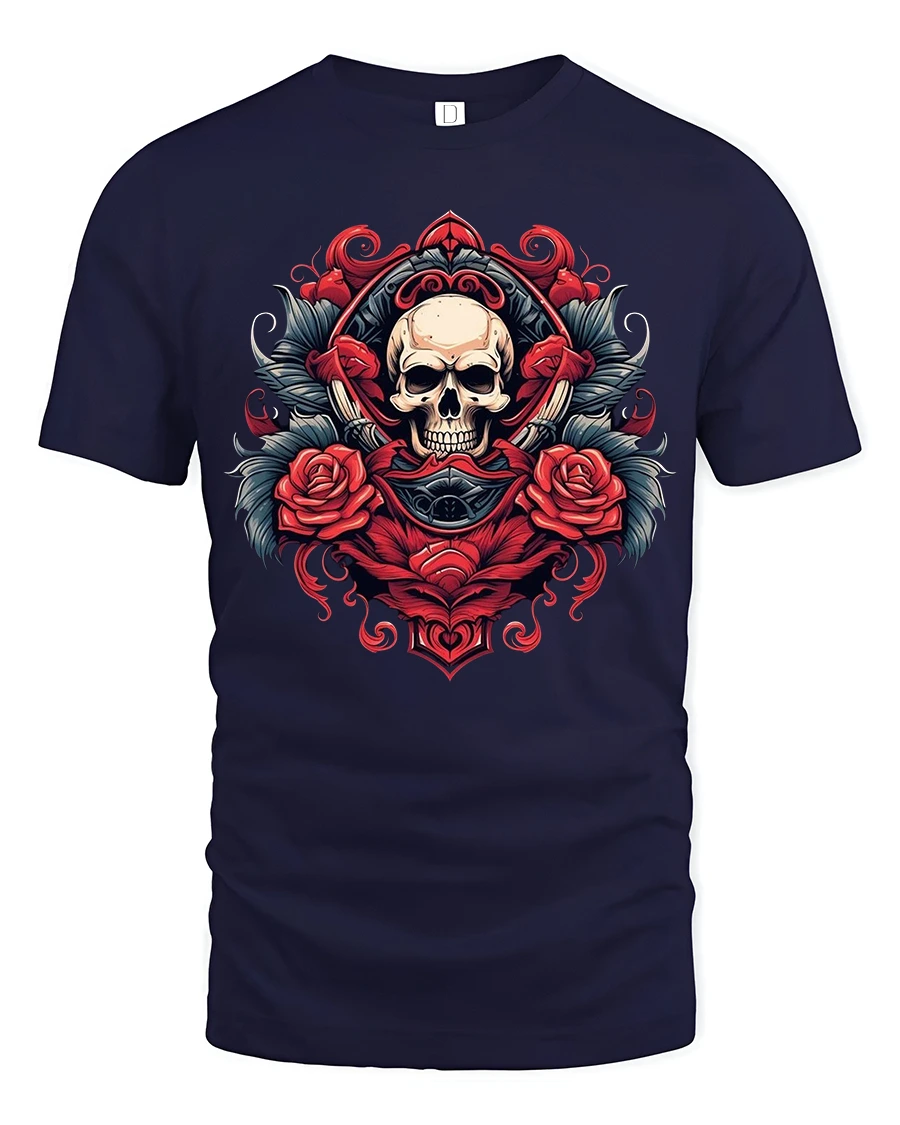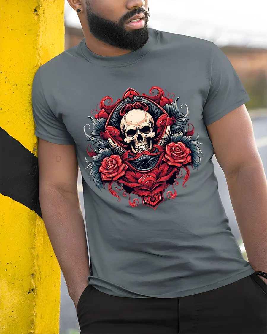 Skull And Red Rose Crest Art Graphic T Shirt blends gothic elegance with bold symbolic artwork in a striking and timeless design.