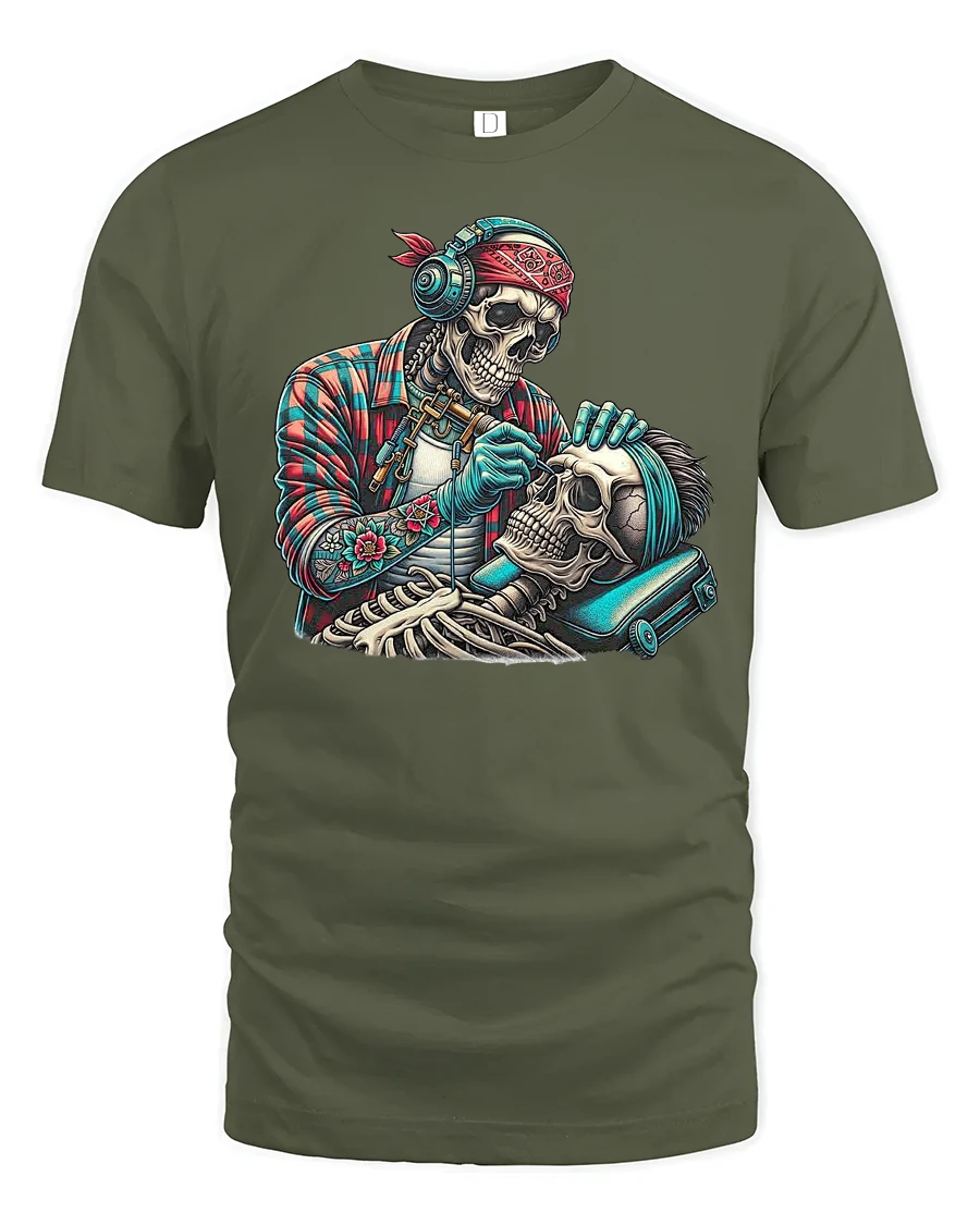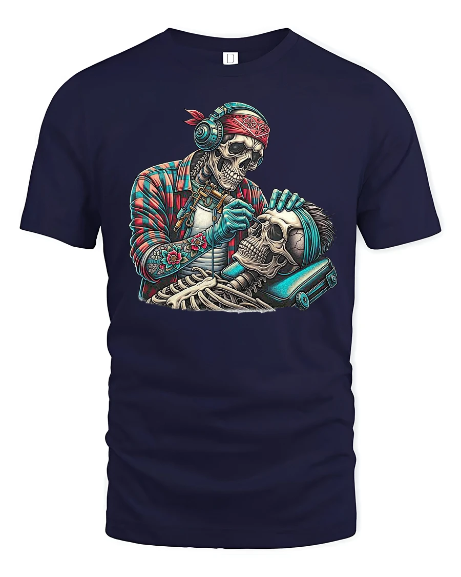 The design features a skeleton barber giving another skull a fresh cut — a creative nod to barber culture with a gothic twist.