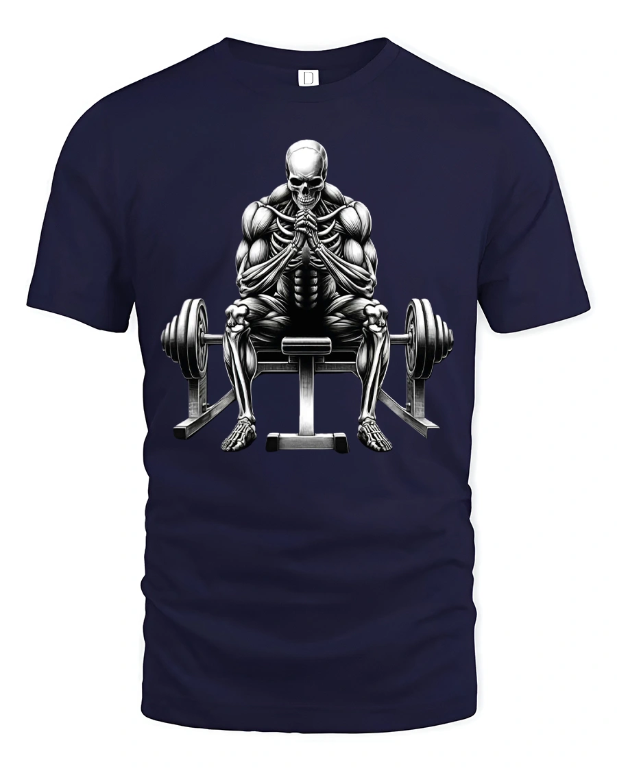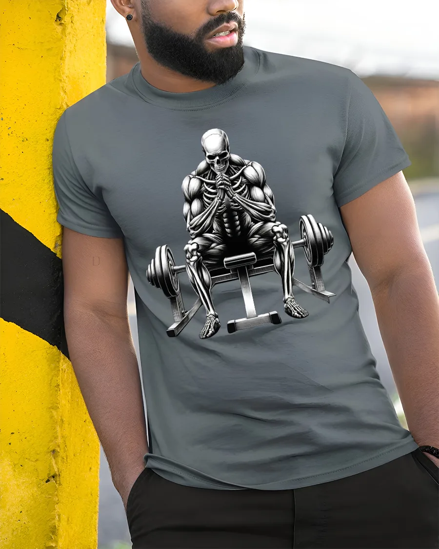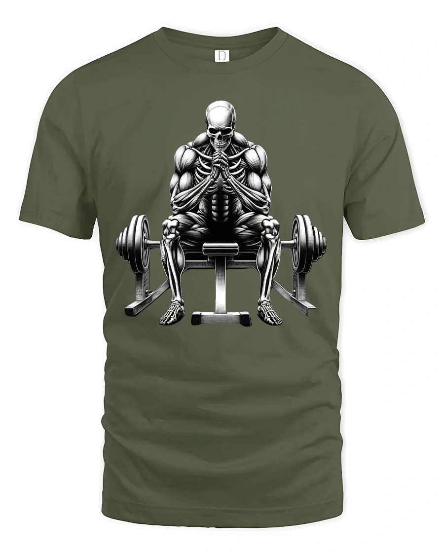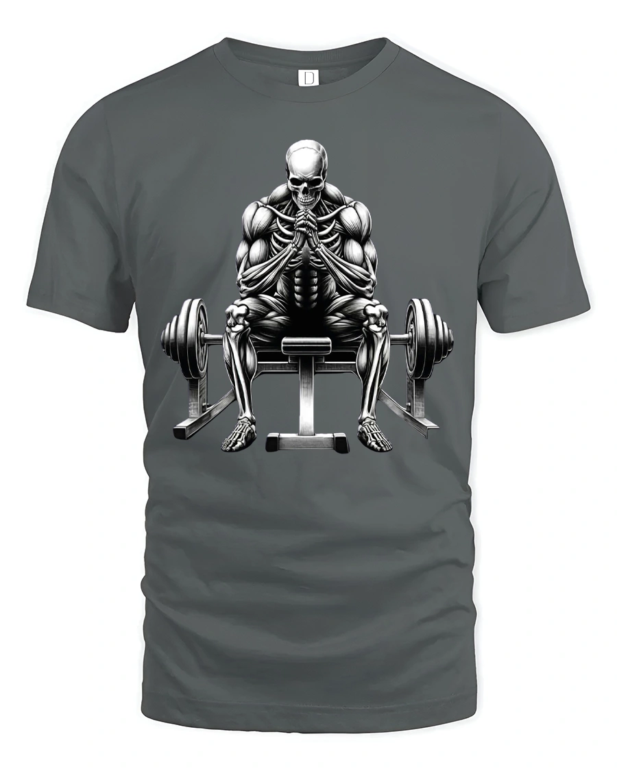 This bold design showcases a powerful skeletal lifter sitting between barbells, symbolizing strength, determination, and the relentless spirit of training.