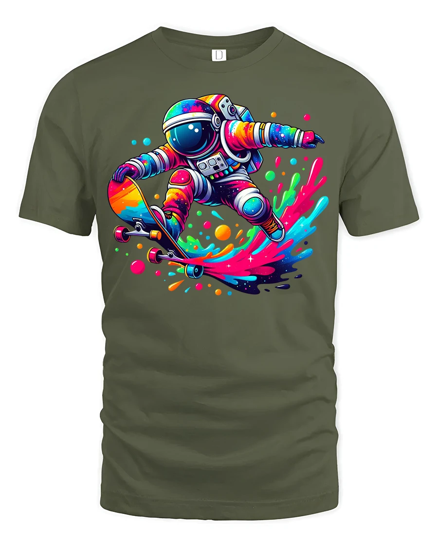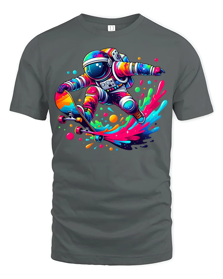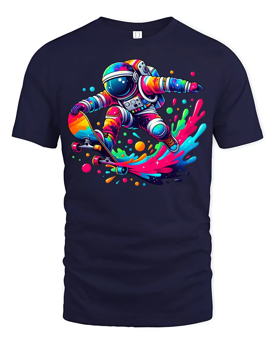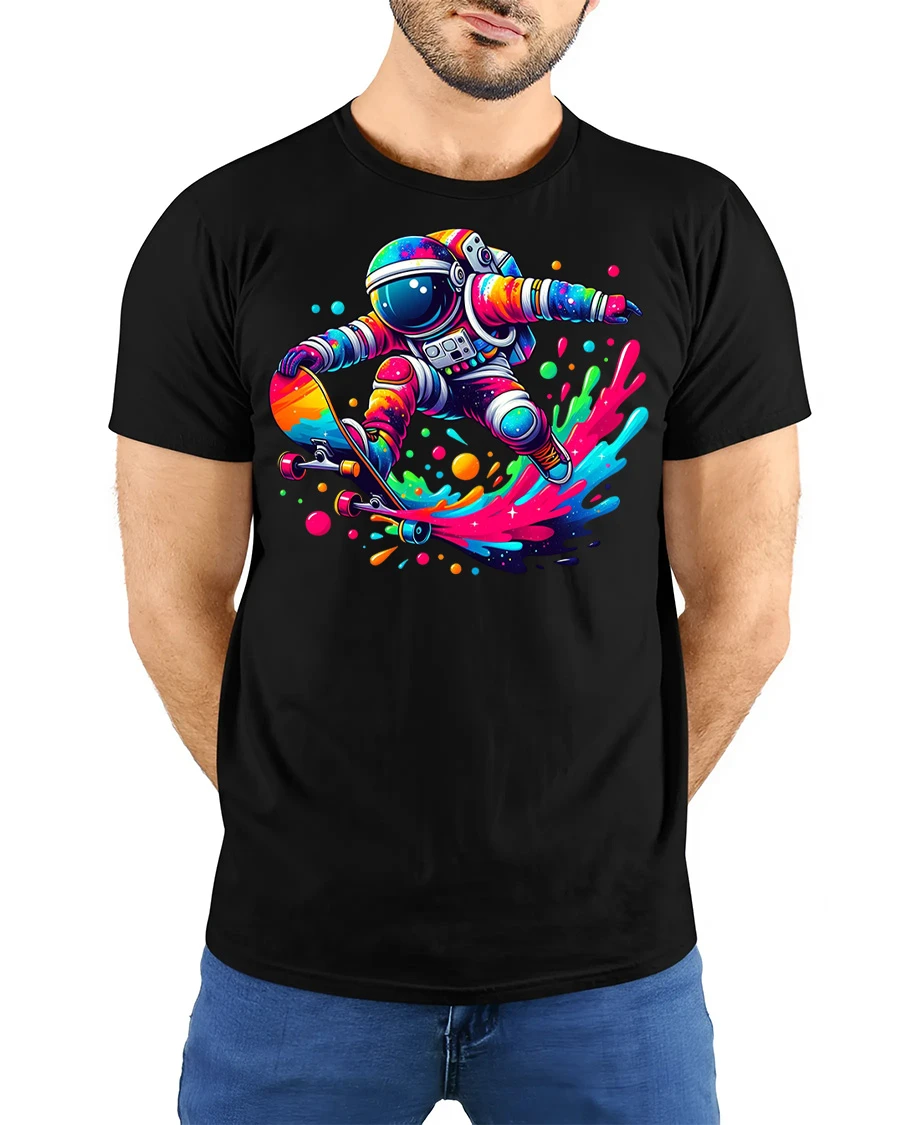 Space Skateboarding Astronaut Graphic T Shirt Color Splash Tee is a vibrant and creative design that combines space adventure with skate culture style. The artwork features a colorful astronaut riding a skateboard with bright paint splash effects, creating a dynamic and energetic graphic that stands out in any outfit. The bold colors and fun space theme make this graphic tee a unique addition to any casual wardrobe.